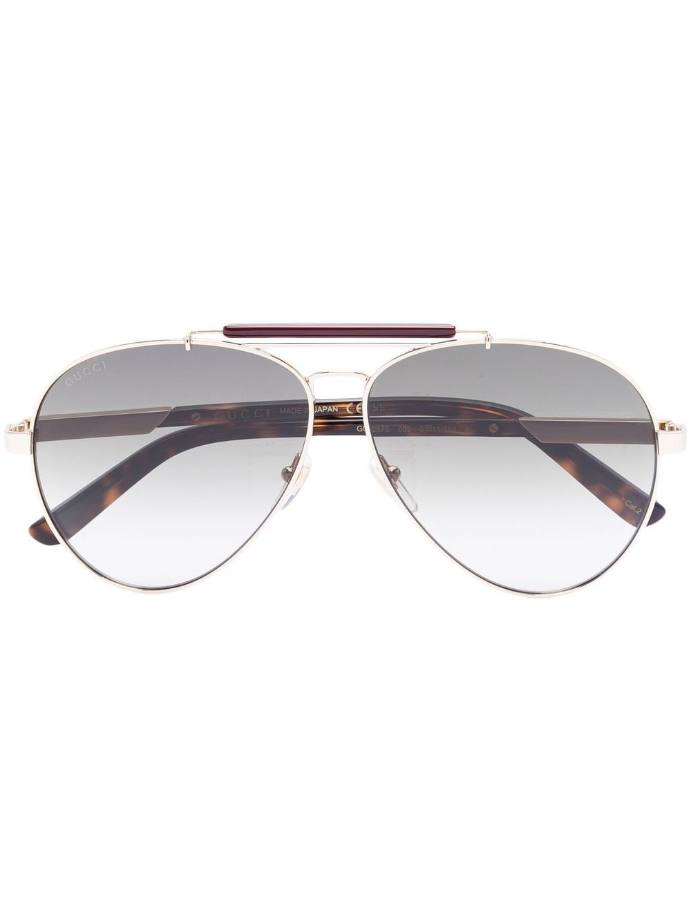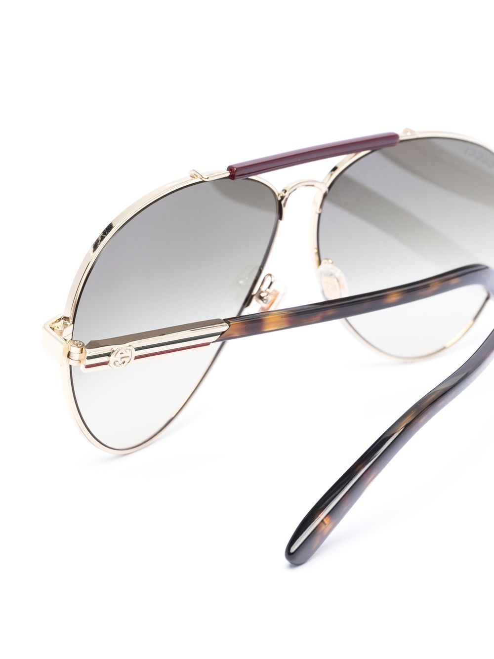 gold-tone hardware/brown double bridge tinted lenses nose pads straight arms curved tips These glasses come with a protective case.