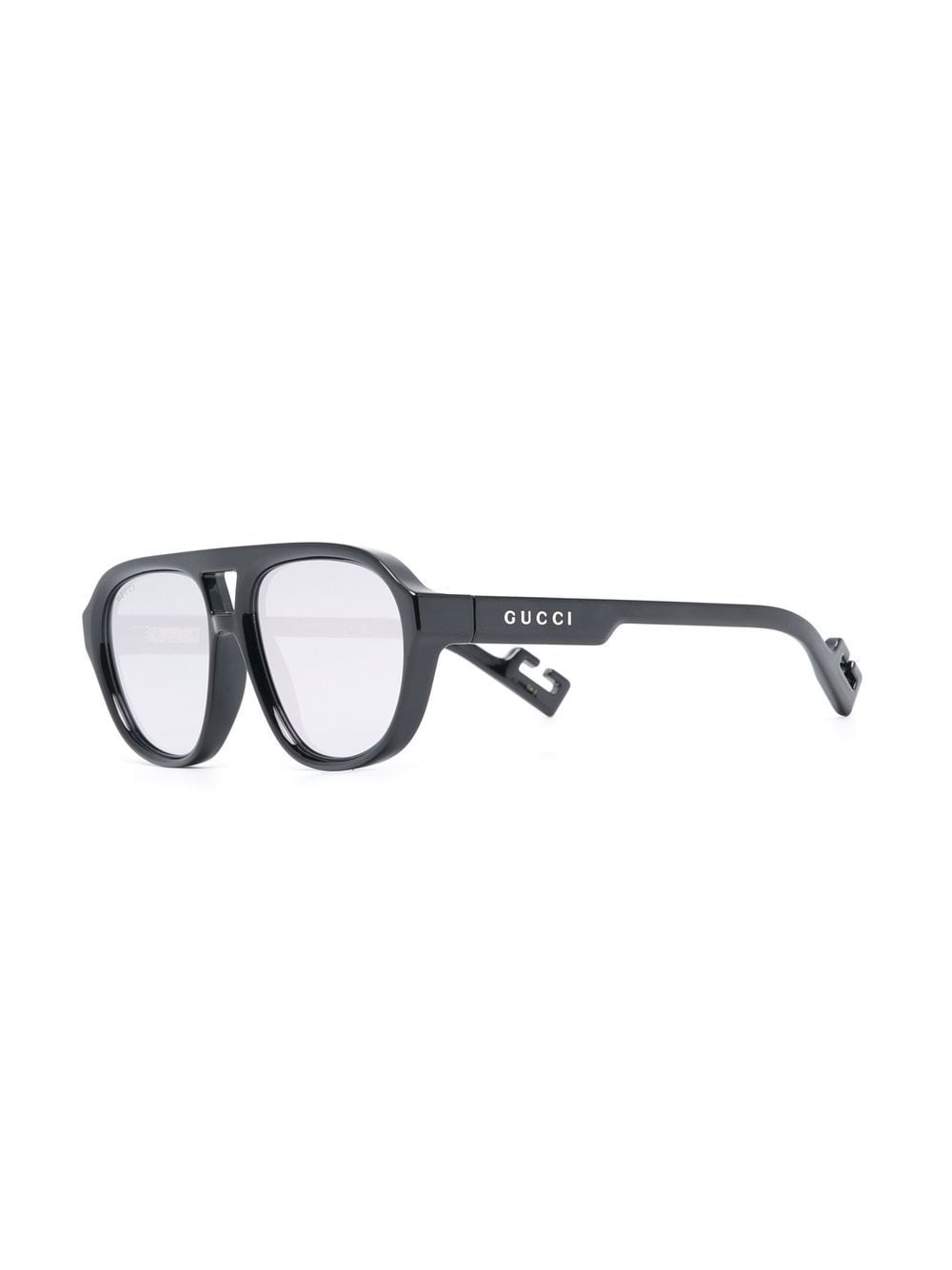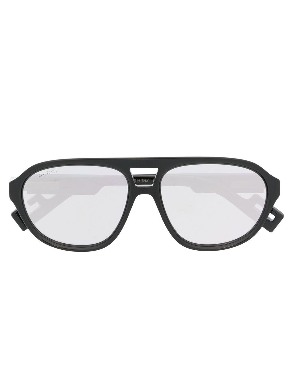 black acetate pilot frame tinted lenses gold-tone logo plaque straight arms curved tips These glasses come with a protective case.