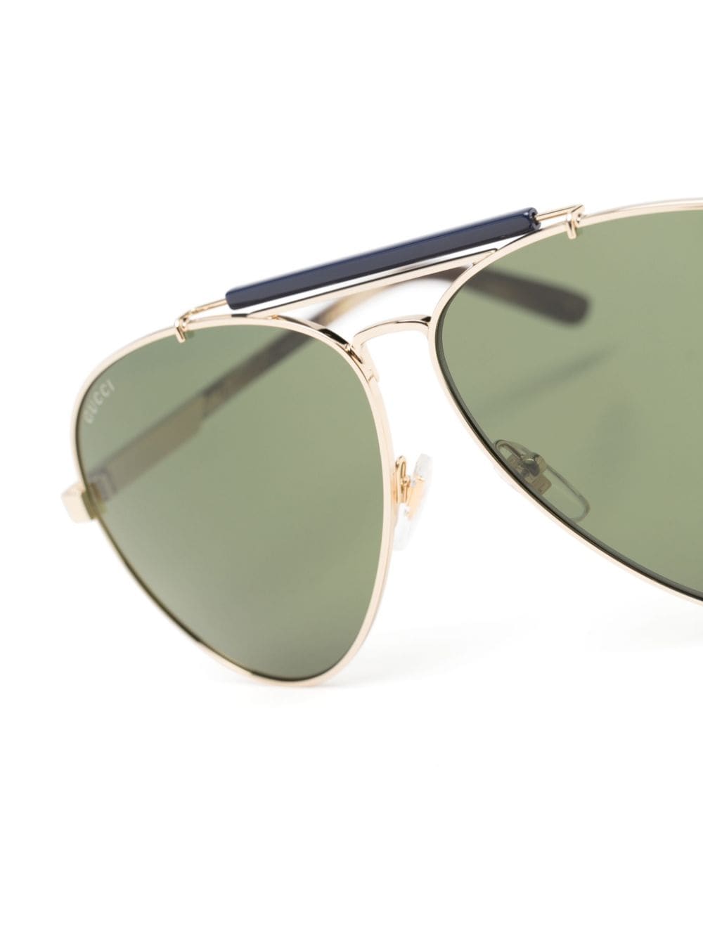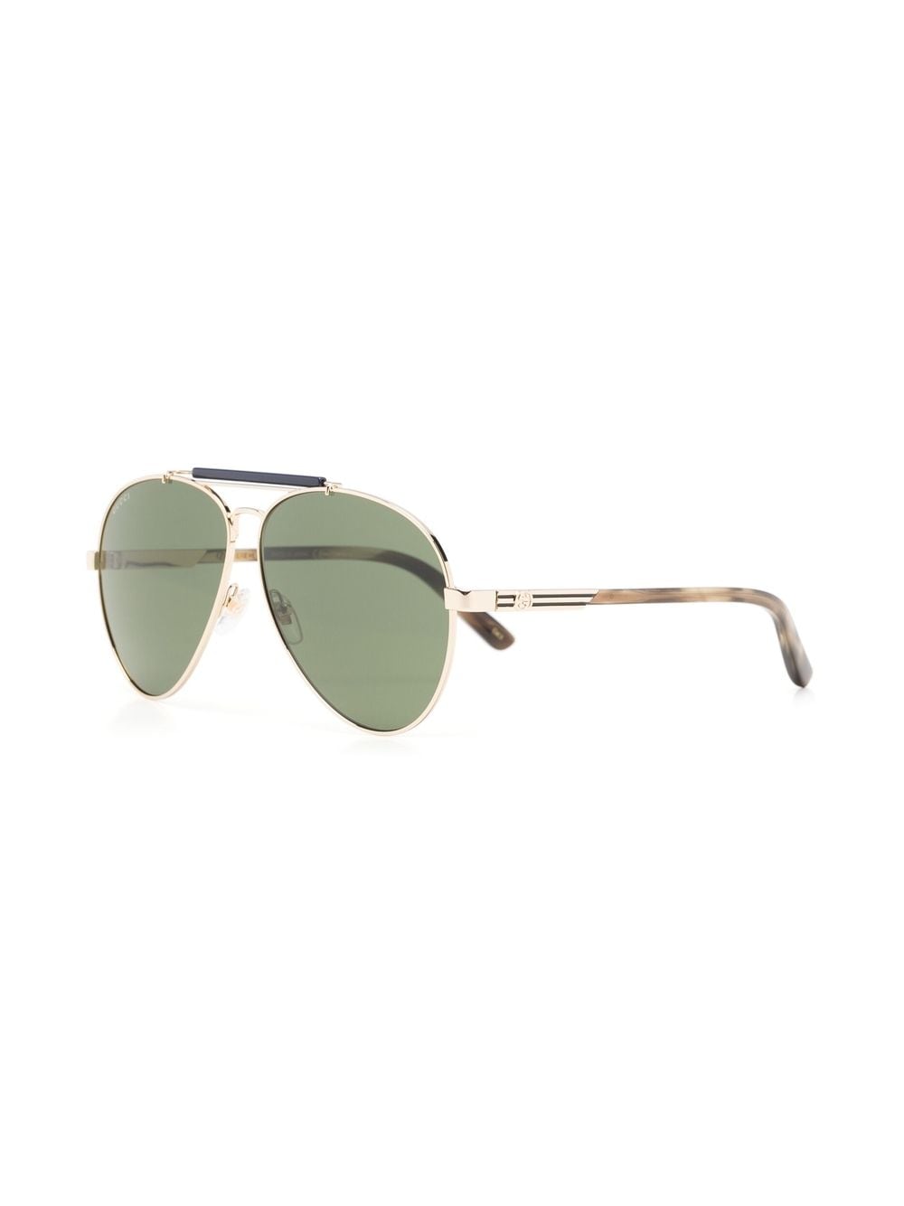 gold-tone/Havana brown metal/acetate logo-engraved arm pilot frame double bridge green tinted lenses UV protection lens decal straight arms curved tips nose pads These glasses come with a protective case.