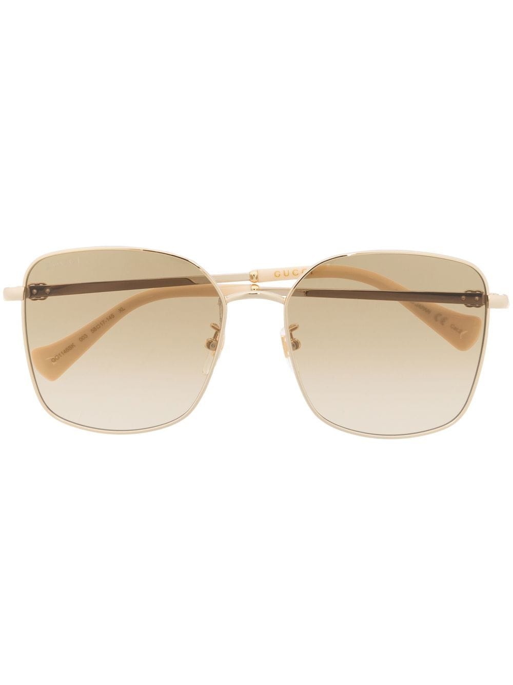 gold metal square frame gold-tone hardware curved arms These glasses come with a protective case.