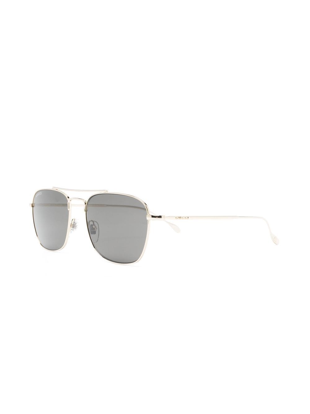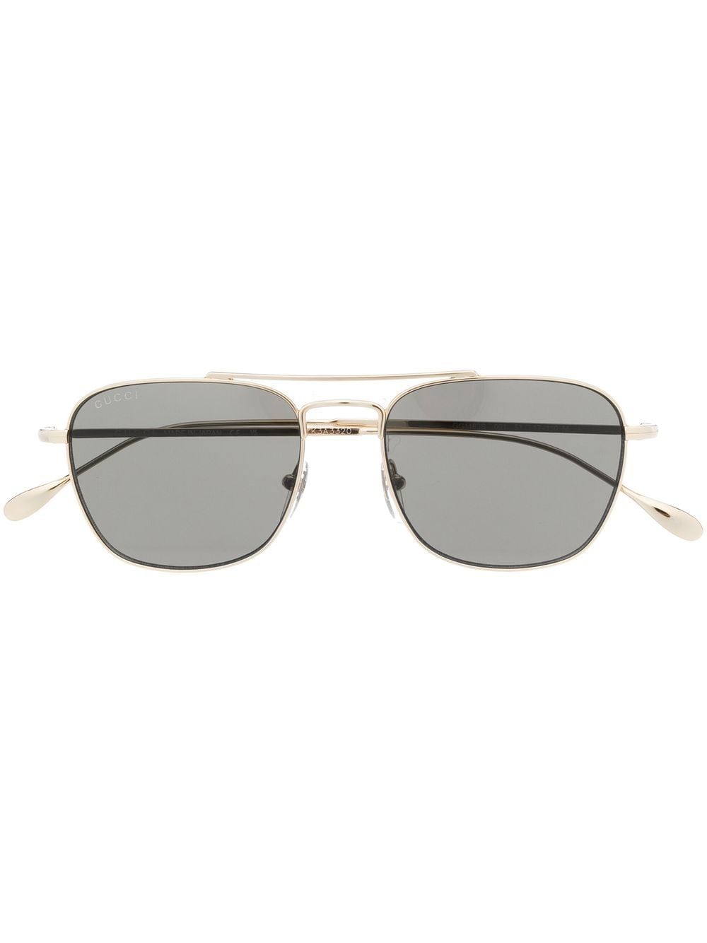 gold-tone metal gold-tone hardware engraved logo square frame grey tinted lenses nose pads straight arms curved tips UV-protective lenses These glasses come with a protective case.