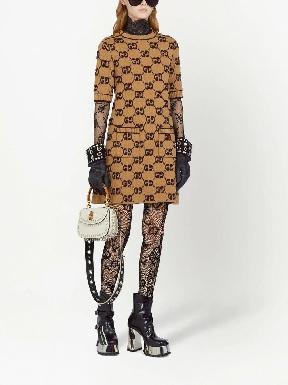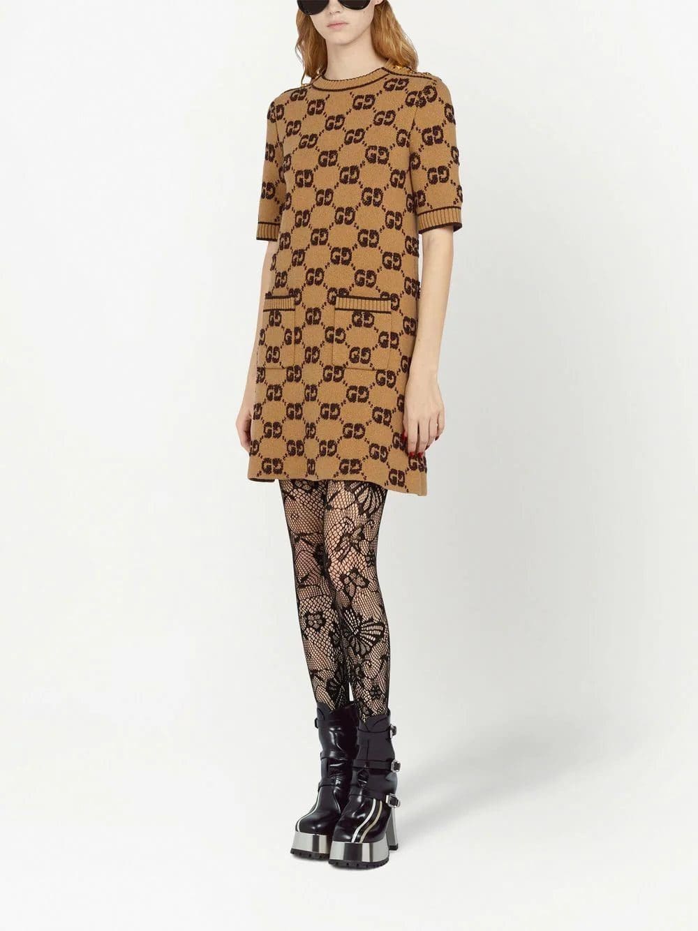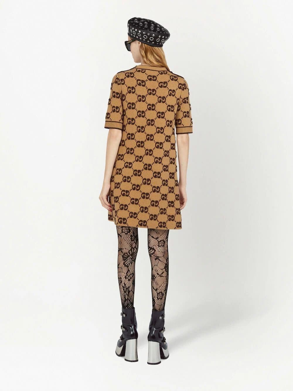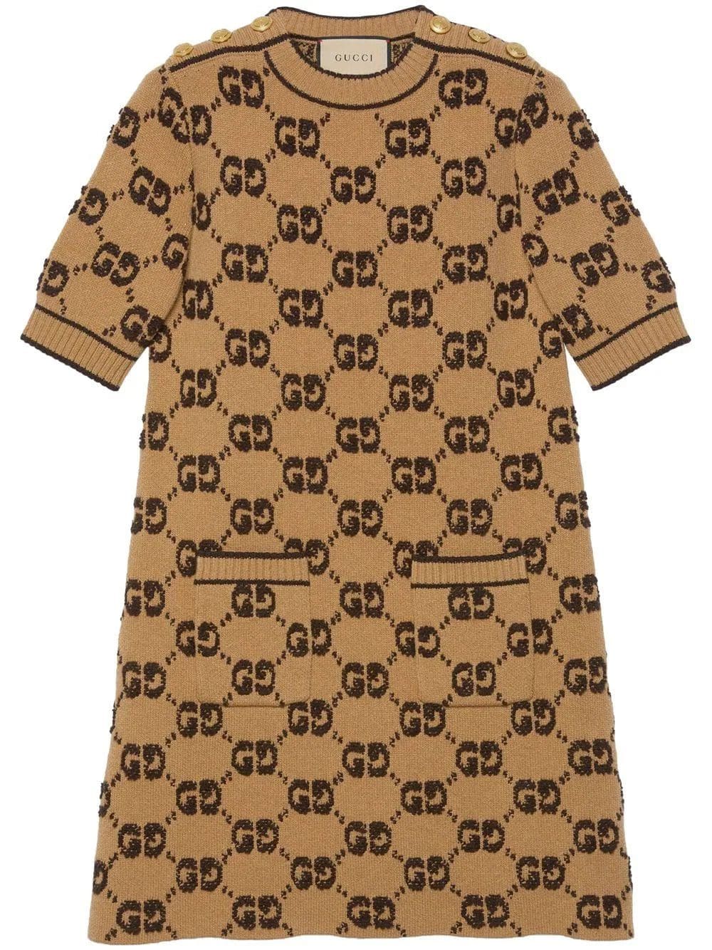 Gucci's signature GG motif takes on multiple iterations and is seen here in a wool bouclé jacquard construction on this short-sleeve knitted mini dress. Set against the silhouette's camel brown base, gold-tone logo-embossed buttons sit at each outer shoulder.
