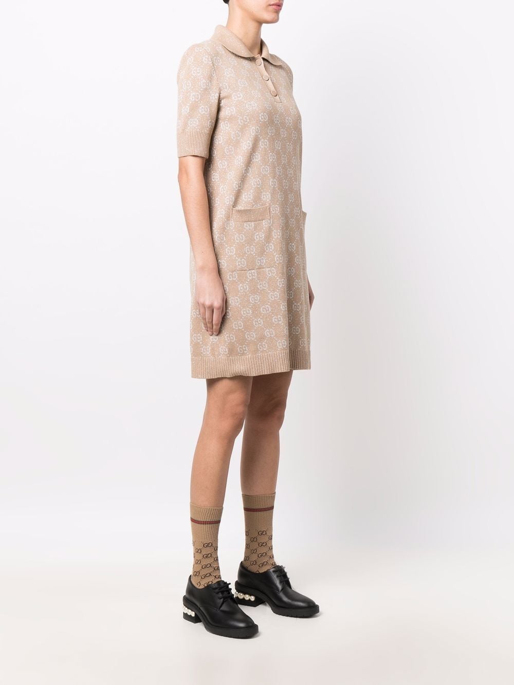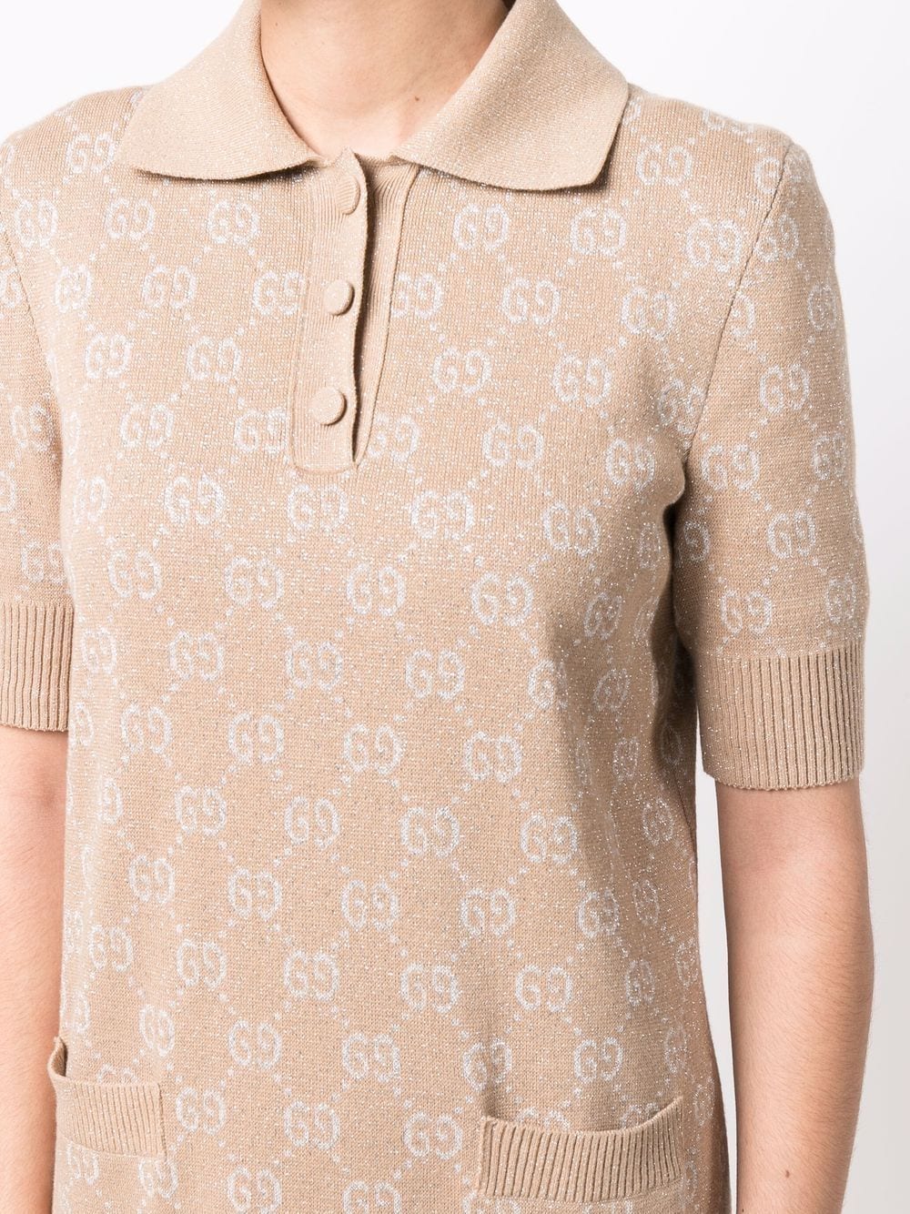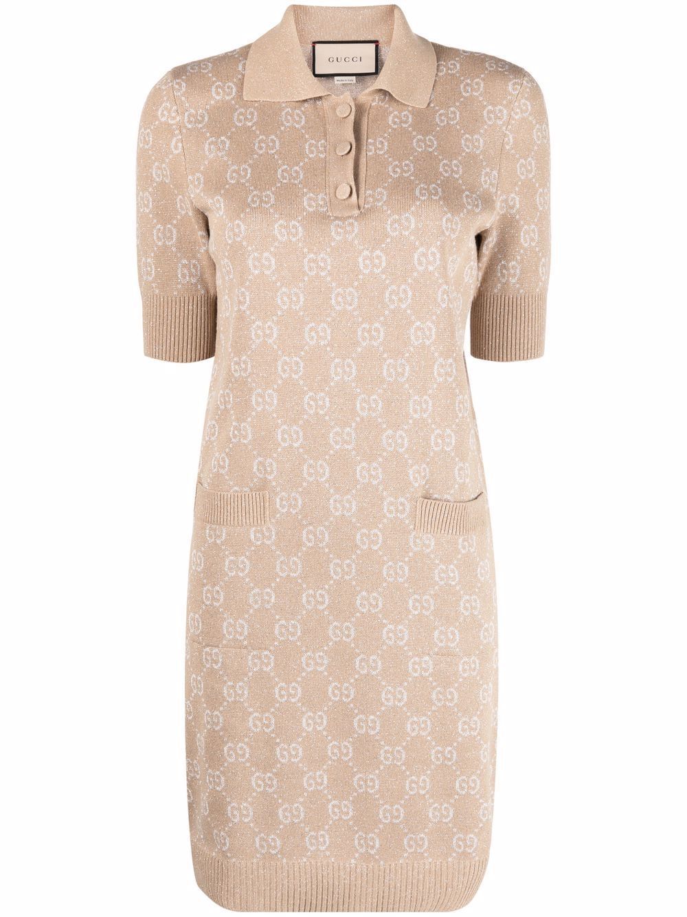 beige cotton blend jacquard G monogram motif polo collar short sleeves front button placket straight hem