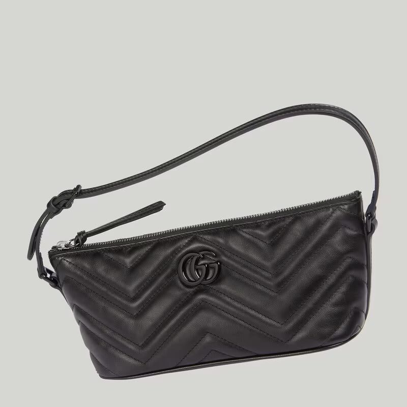 With its recognizable matelassé fabric and Double G hardware, the GG Marmont has become synonymous with the House. Continuously reinvented through the seasons, new shapes are introduced within this signature line, matching Gucci's contemporary vision. Presented here in black leather, it's further enriched with antique gold-toned details.