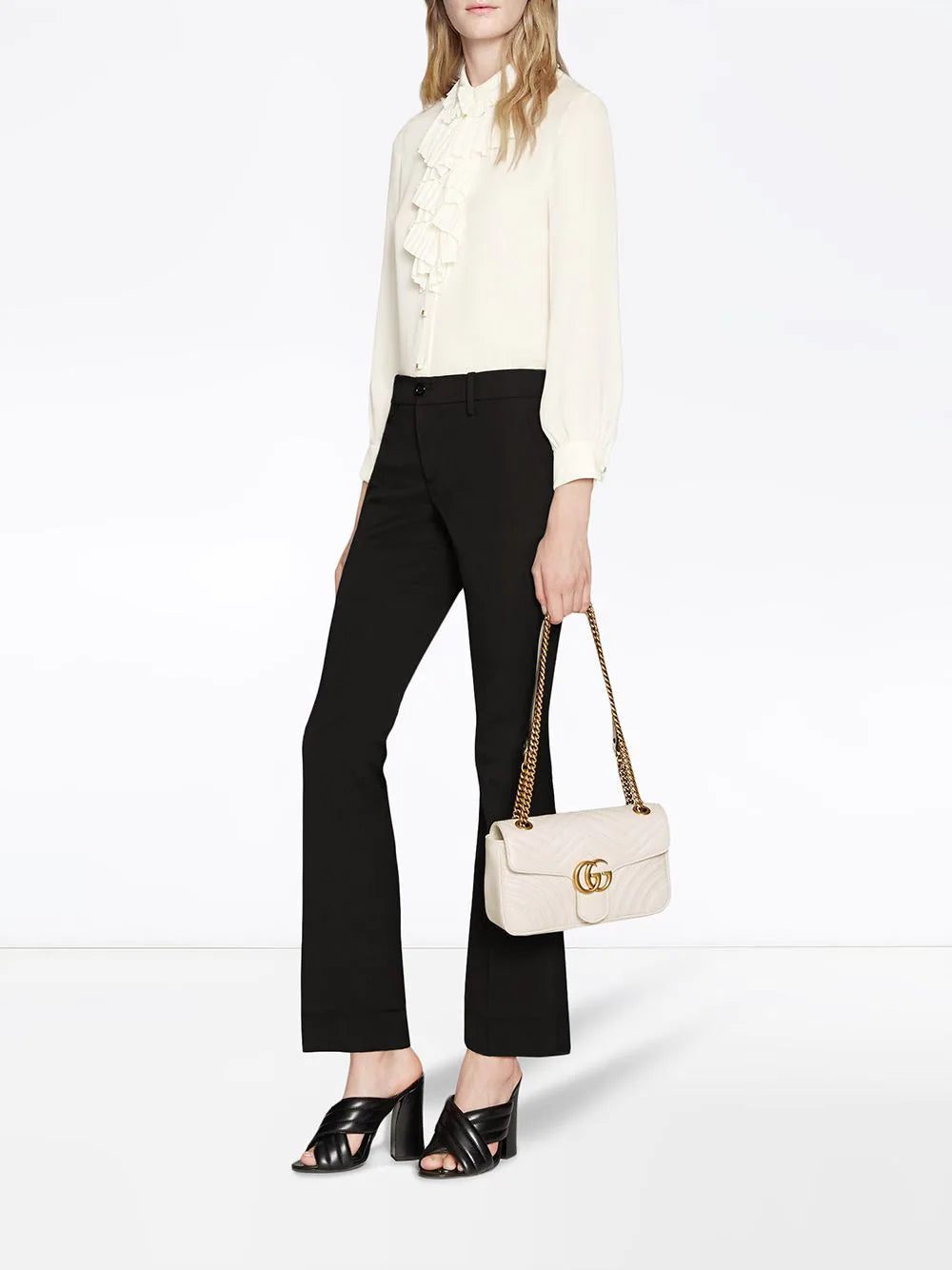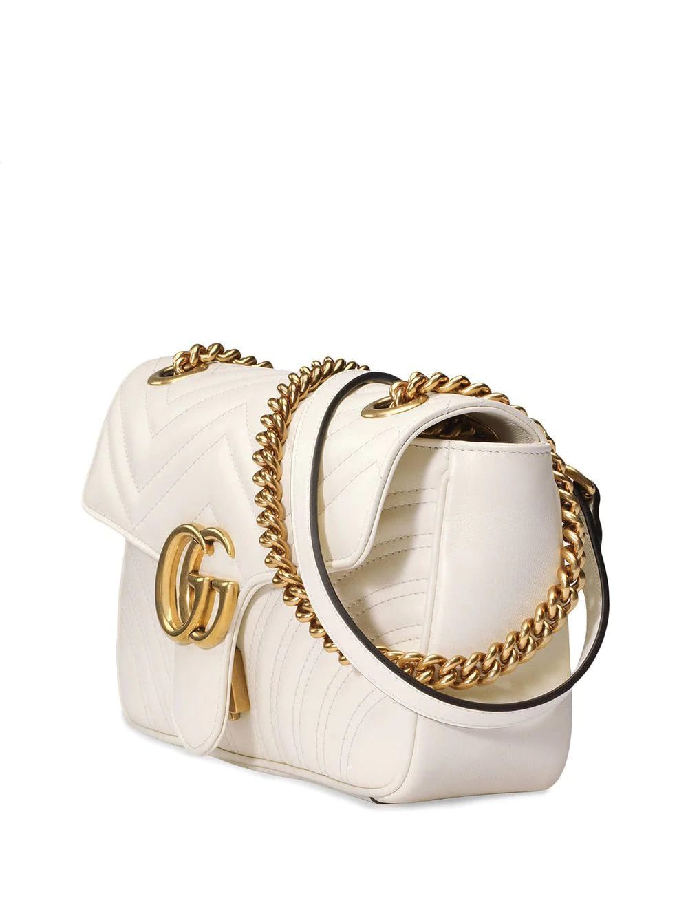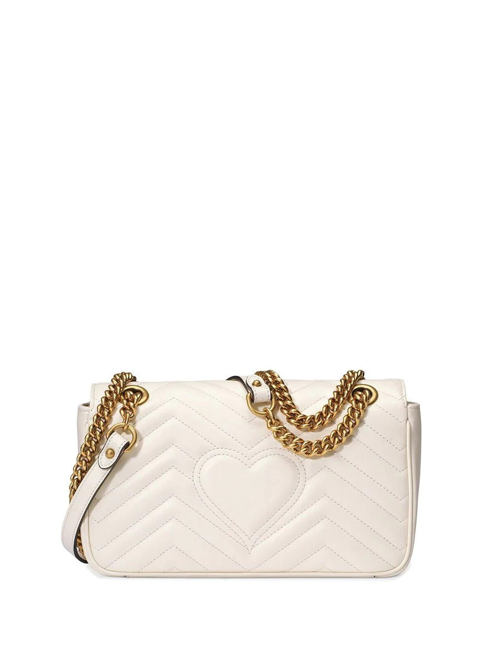 The small GG Marmont chain shoulder bag has a softly structured shape and an oversized flap closure with Double G hardware. The sliding chain strap can be worn multiple ways, changing between a shoulder and a top handle bag. Made in matelassé chevron leather with a heart on the back. White matelassé chevron leather with a heart. Antique gold toned hardware. Double G. Interior zipper pocket. Sliding chain strap can be worn as a shoulder strap with 22” drop, as a top handle with 12” drop or as a cross body bag. Flap with spring closure. Small size: 10"W x 6"H x 3"D. Microfiber lining with a suede-like finish. Made in Italy. The model is 180cm. This item will be delivered in special edition packaging.