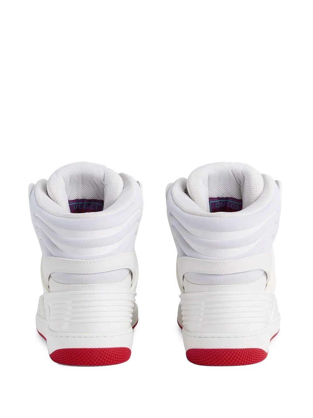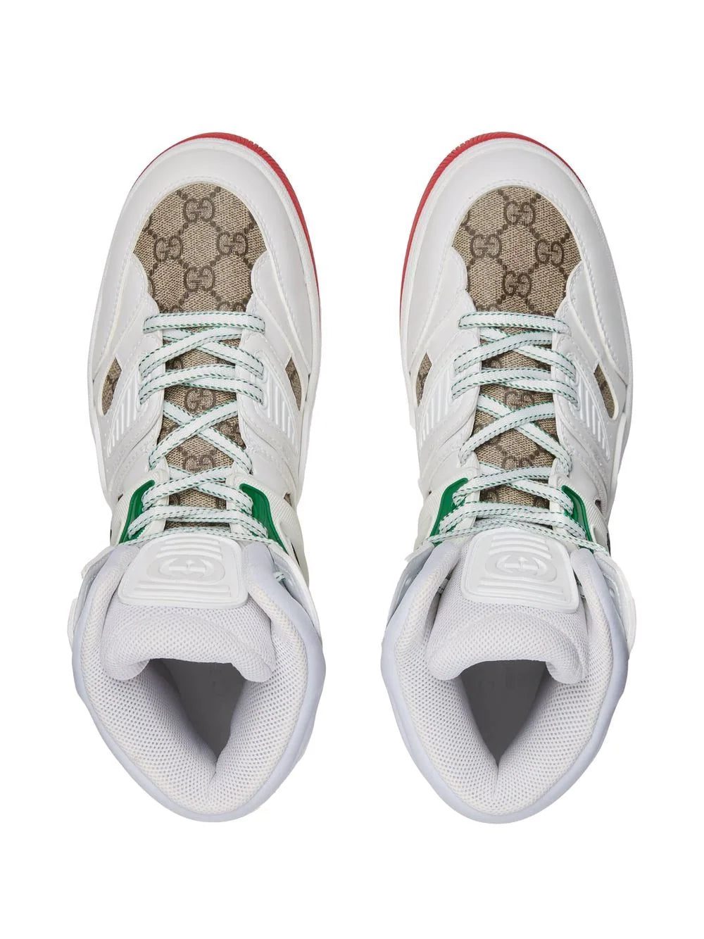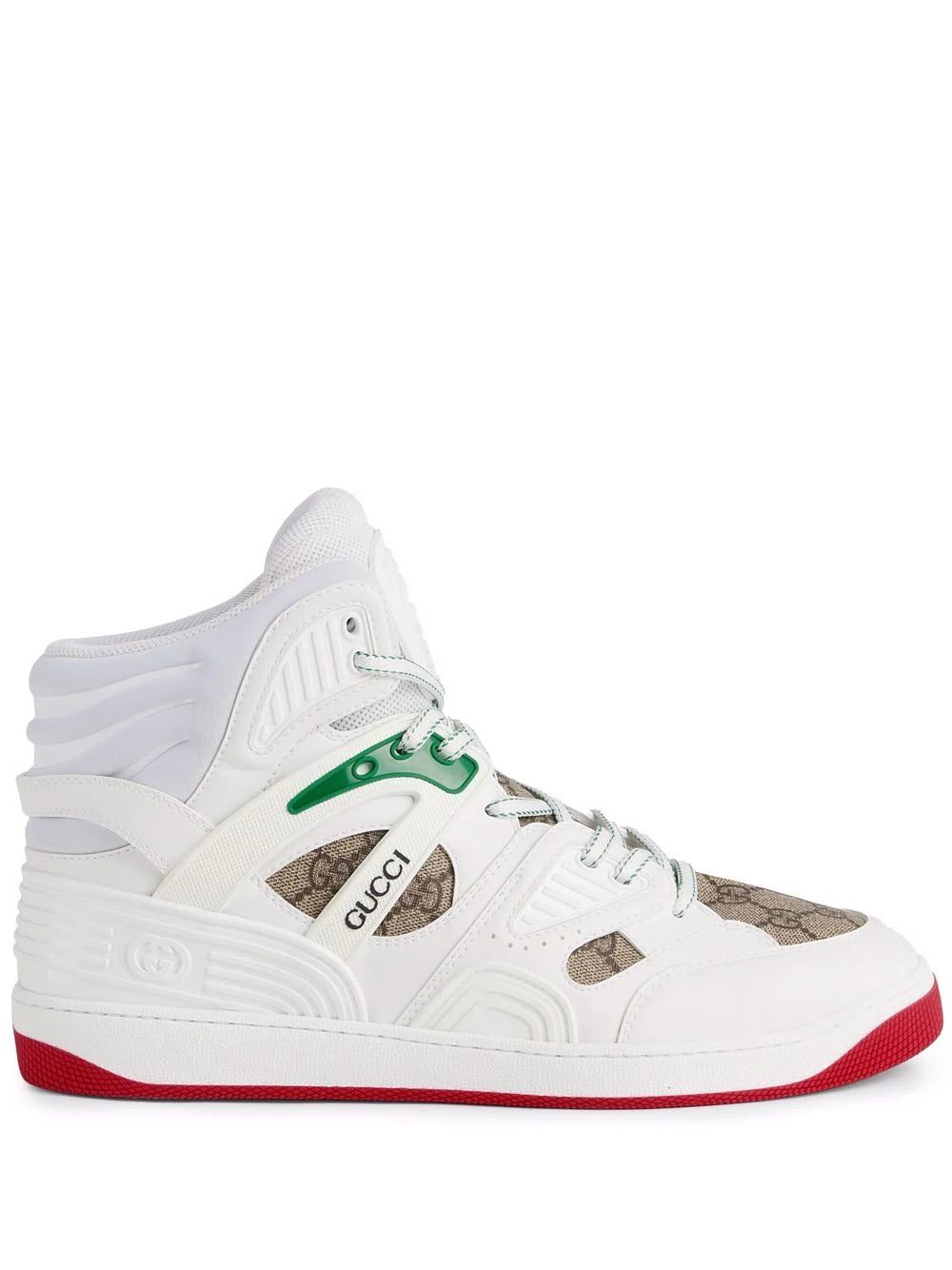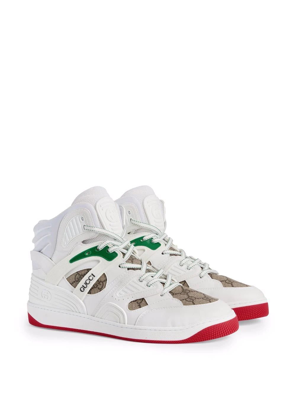 Gucci's Basket sneakers draw inspiration from classic high-top silhouettes as seen in the 90s. Constructed with eco-friendly materials, this pair boasts a crisp white colourway with a mesh-panelling logo motif.