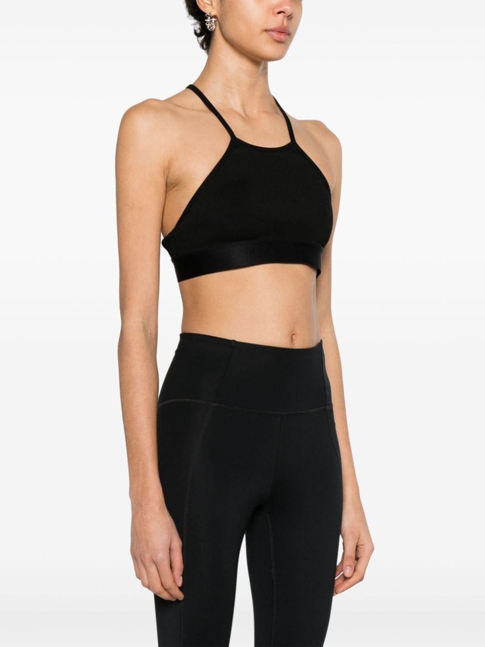 Drawing inspiration from '90s athleisure, this black Gucci cropped top is cut from ribbed jersey to a sleek racerback silhouette with spaghetti straps anchored by a silver-tone Interlocking G plaque to the rear. Note the logo underband, adding another layer of branding.