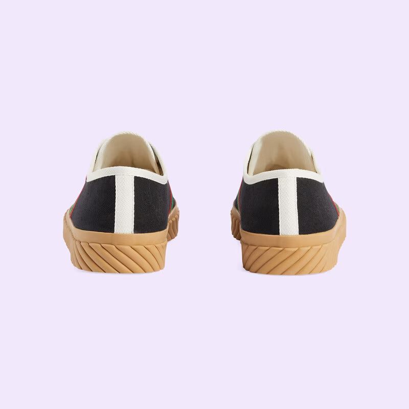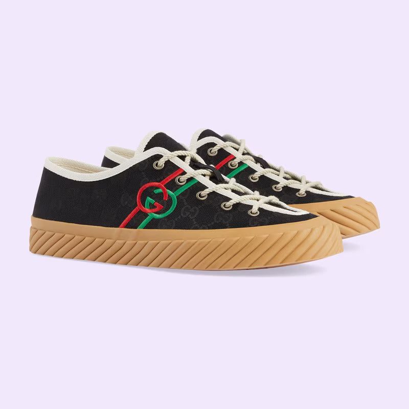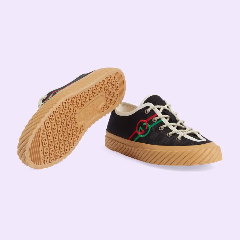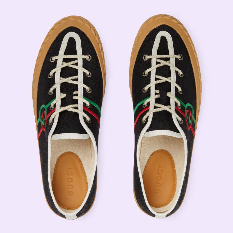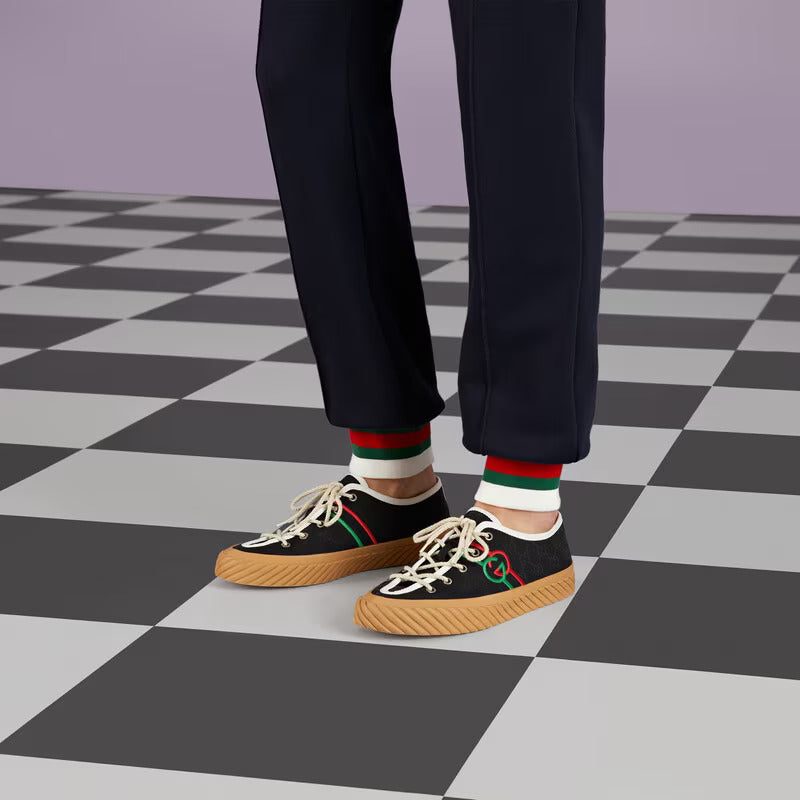 An instantly recognizable silhouette, the House personalizes the sneaker with an intricate Interlocking G embroidery. The shoe is presented in black and ebony Original GG canvas, which draws attention to the blue and red logo detail.