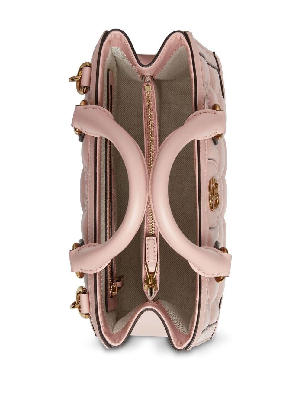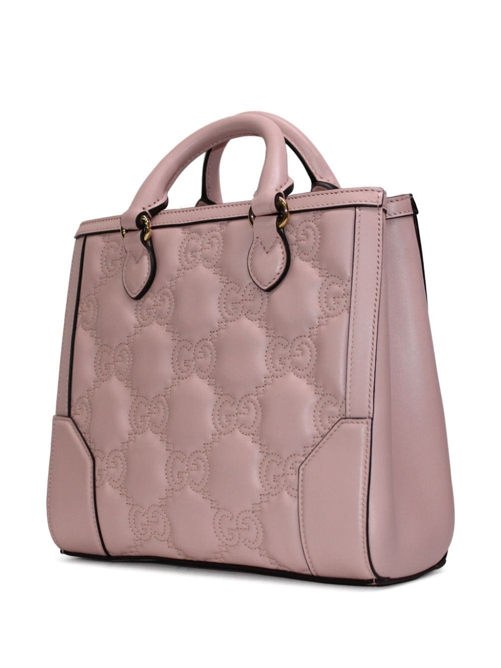 GG logo-embossed mini tote bag from Gucci featuring powder pink, calf leather, signature Interlocking G logo plaque, all-over logo embroidery, two rolled top handles, partitioned compartment, internal zip-fastening pockets and adjustable detachable shoulder strap.