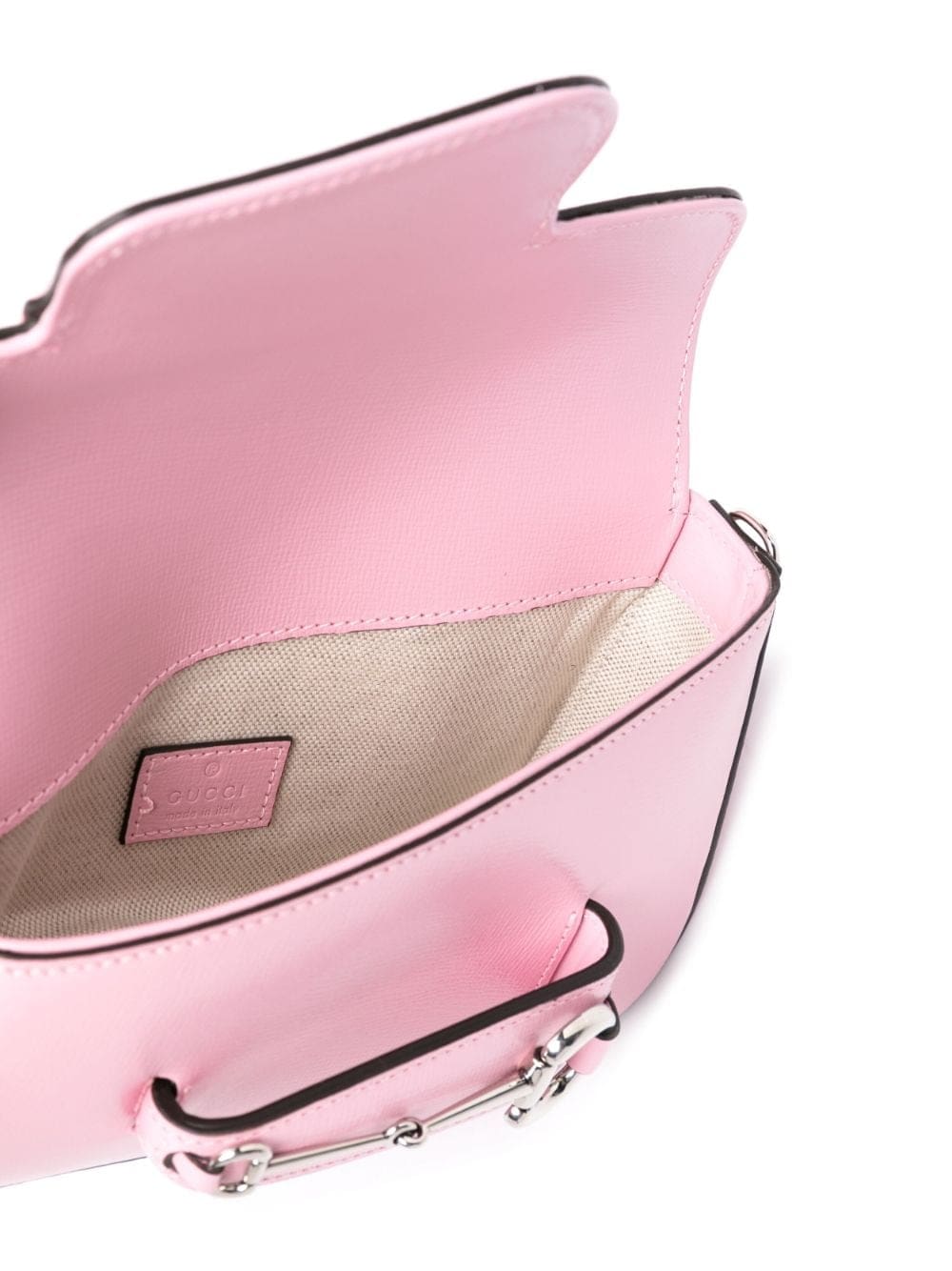 Gucci's celebrates the 70th anniversary of its iconic hardware with this mini Horsebit 1955 shoulder bag. It’s crafted from pink leather with a silver-tone version of the iconic embellishment at the front flap – it’s tapered to mimic the asymmetric silhouette.