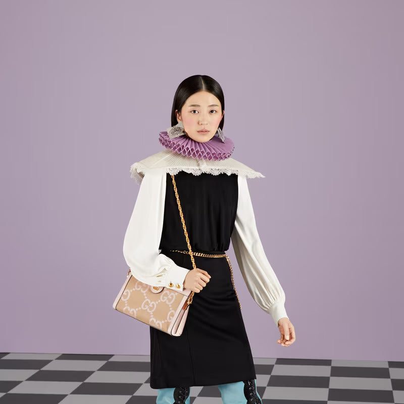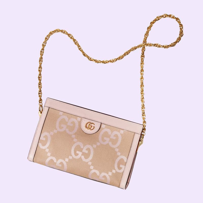 The Gucci color palette is constantly evolving to include more refined hues. New colorways and combinations result in the reinvention of signature styles with a contemporary feel. A jumbo GG canvas explores a new, maximalist version of the historic monogram, animating this small shoulder bag across a camel and light pink canvas base.