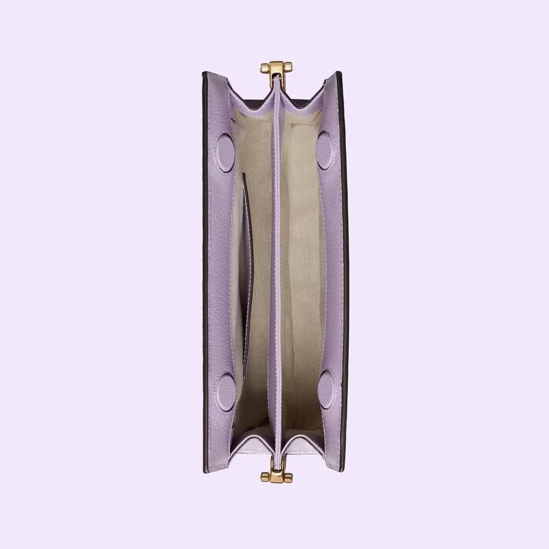 Ophidia evolves as part of the Cosmogonie collection with new iterations, combining vintage-inspired details with emblematic House codes. The jumbo GG explores a new, maximalist version of the historic monogram, animating this small shoulder bag in camel and lilac. The structured design is completed by a chain strap and Double G hardware.
