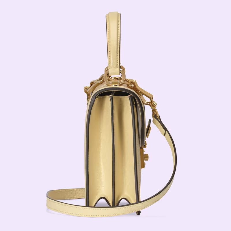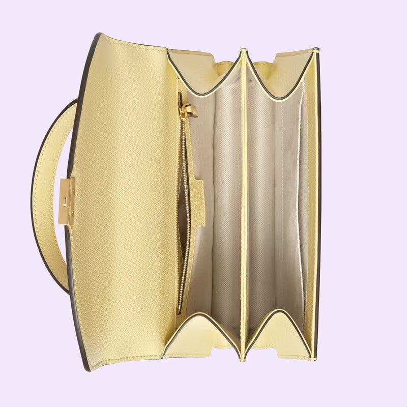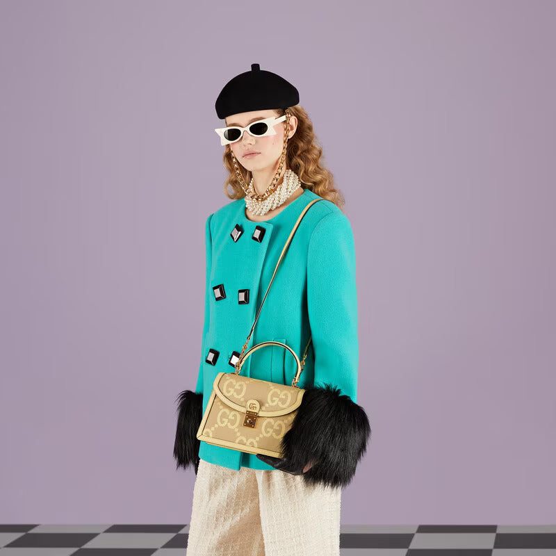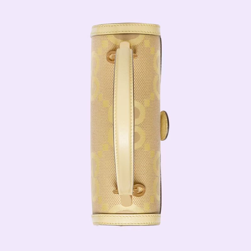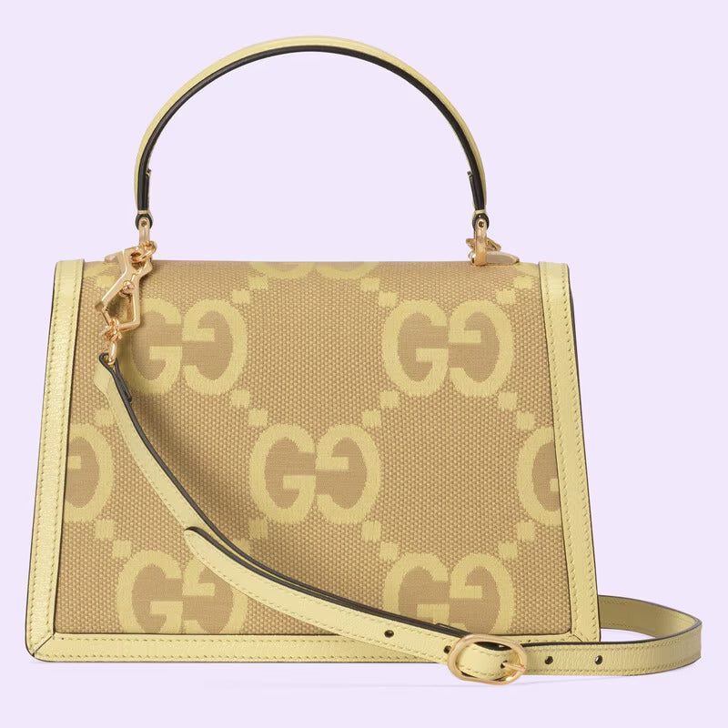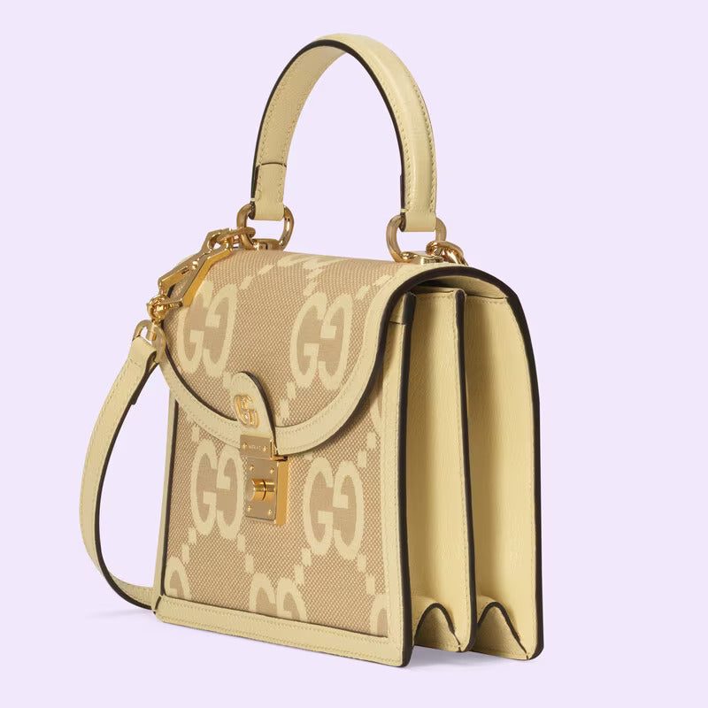 The jumbo GG transforms one of the House's most emblematic materials, bringing structure and movement to the Ophidia top handle bag. This camel and banana canvas interpretation becomes an ode to timeless pieces and everlasting design. A detachable shoulder strap lends versatility to styling, allowing it to be worn as a crossbody or shoulder bag.