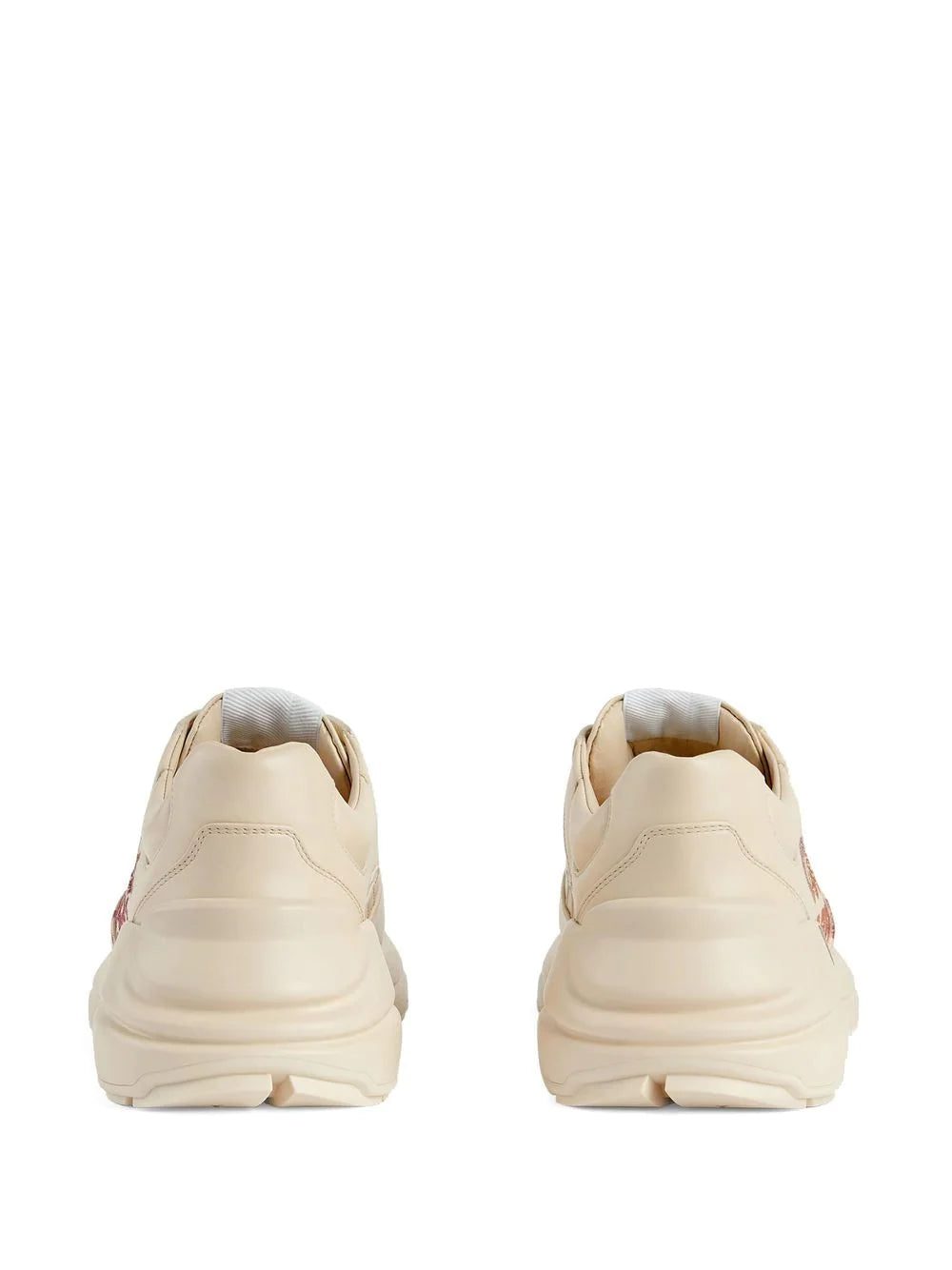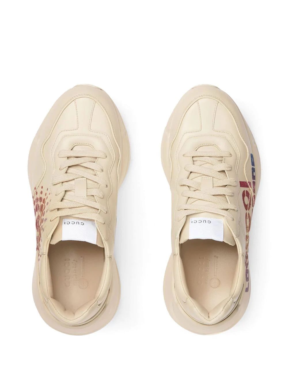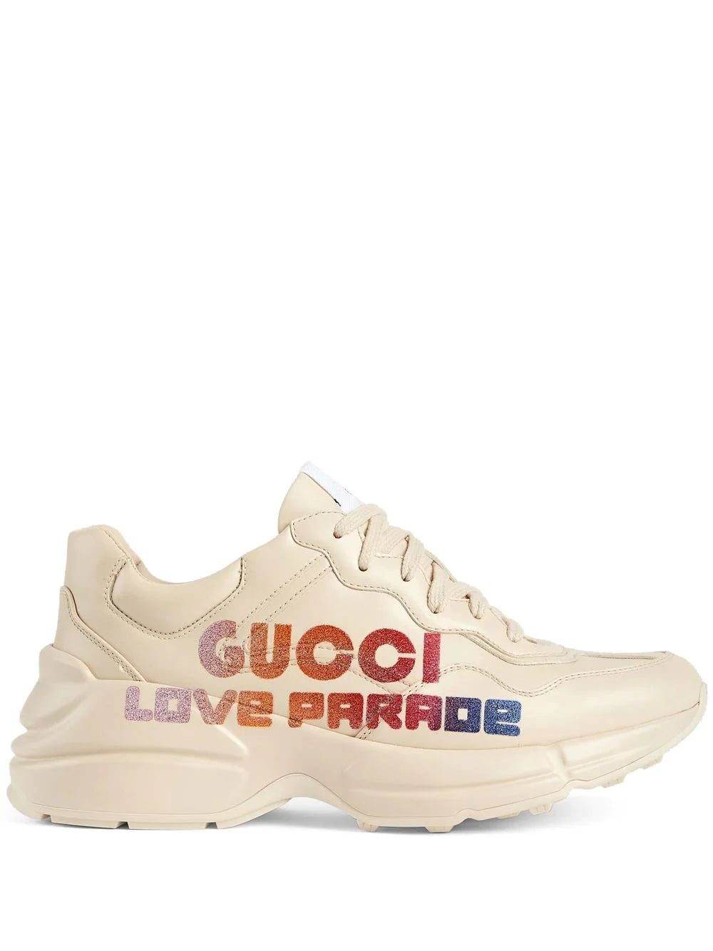 Rhyton glitter-logo chunky trainers from GUCCI featuring off-white, leather, logo print to the side, glitter detailing, round toe, front lace-up fastening, logo patch at the tongue and chunky rubber sole.