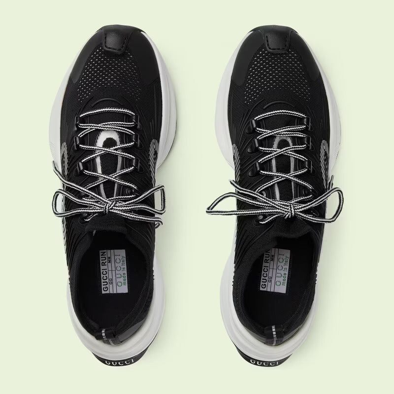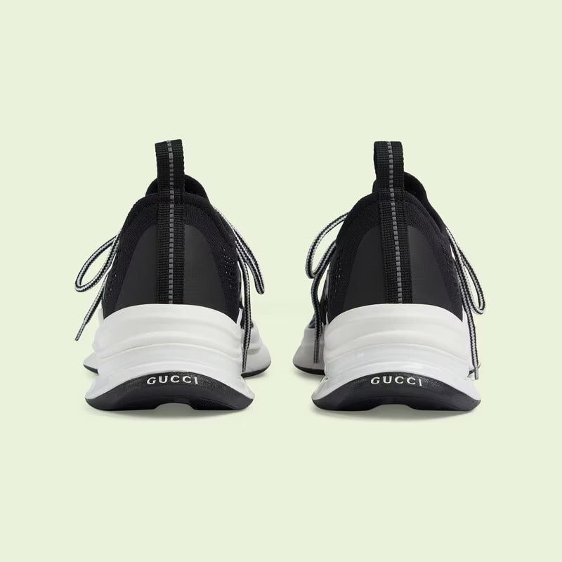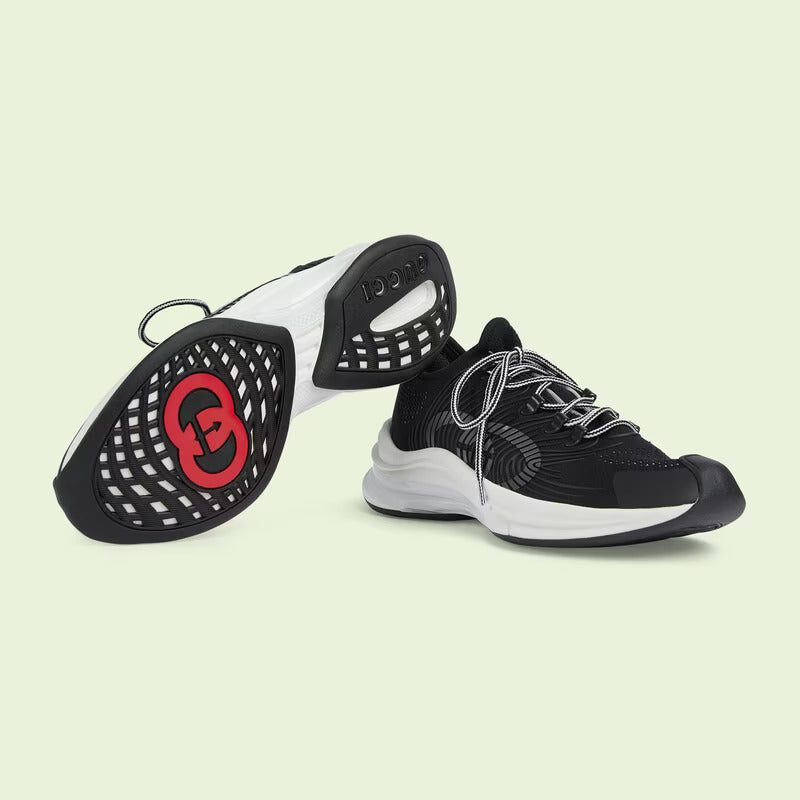 Designs inspired by the sporting world are interpreted through the Gucci lens with standout logo details. This pair of streamlined sneakers is crafted from black technical knit fabric and defined by the Interlocking G. A bi-color sole completes the style with a playful note of chromatic contrast.