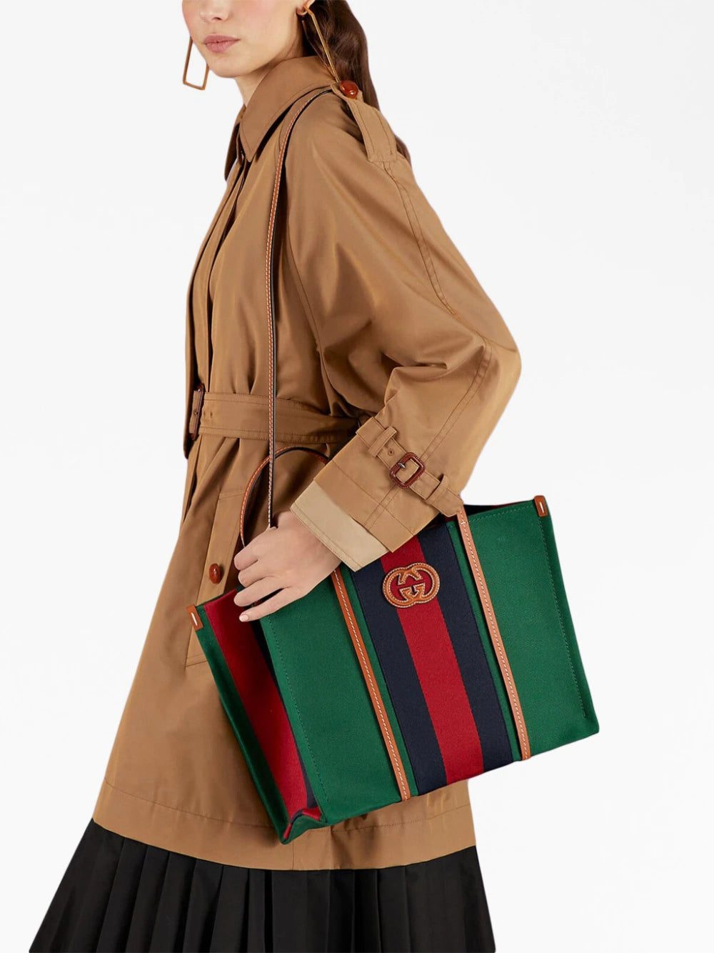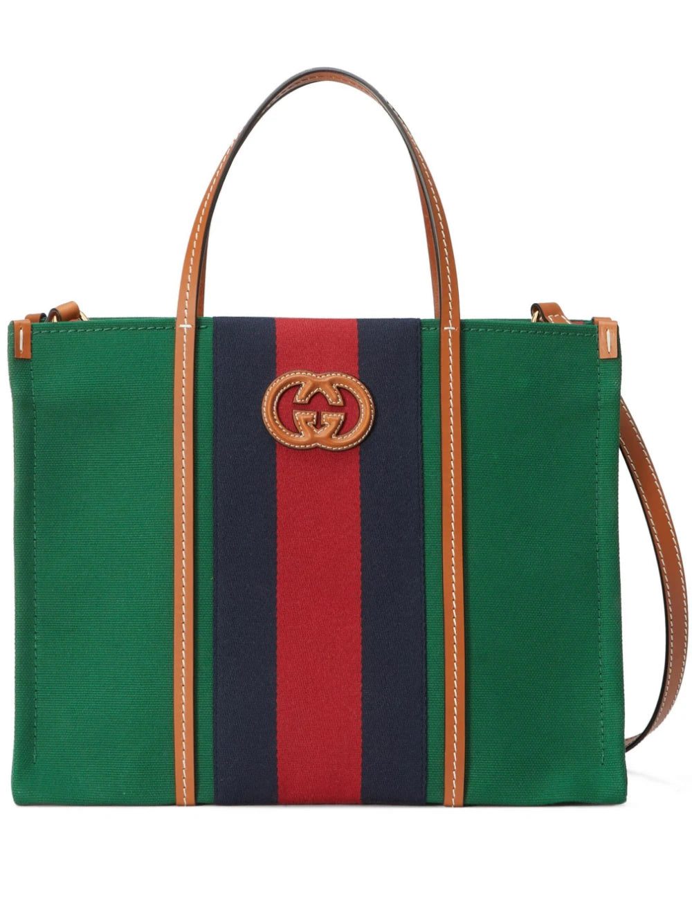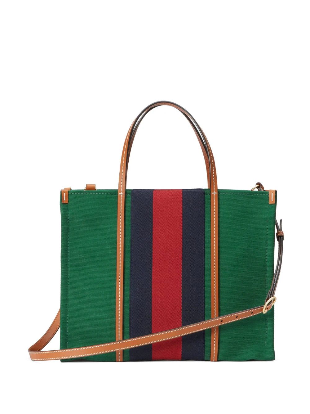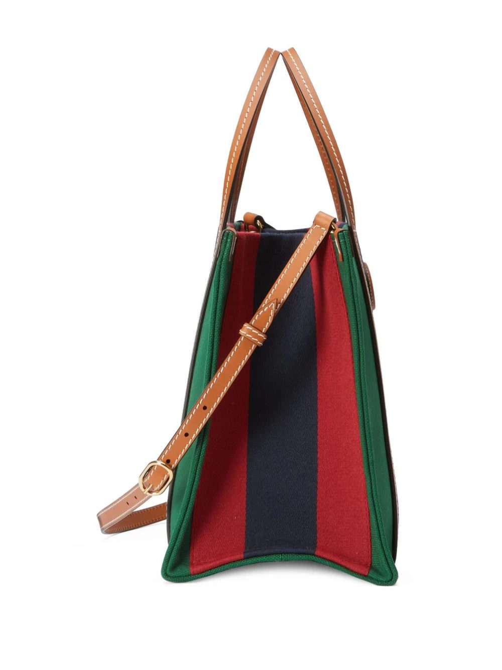 signature stripe-detail tote bag from Gucci featuring dark green, navy blue, red, canvas, signature 3-Stripes logo, logo plaque, two top handles, adjustable detachable shoulder strap, internal zip-fastening pocket and main compartment.