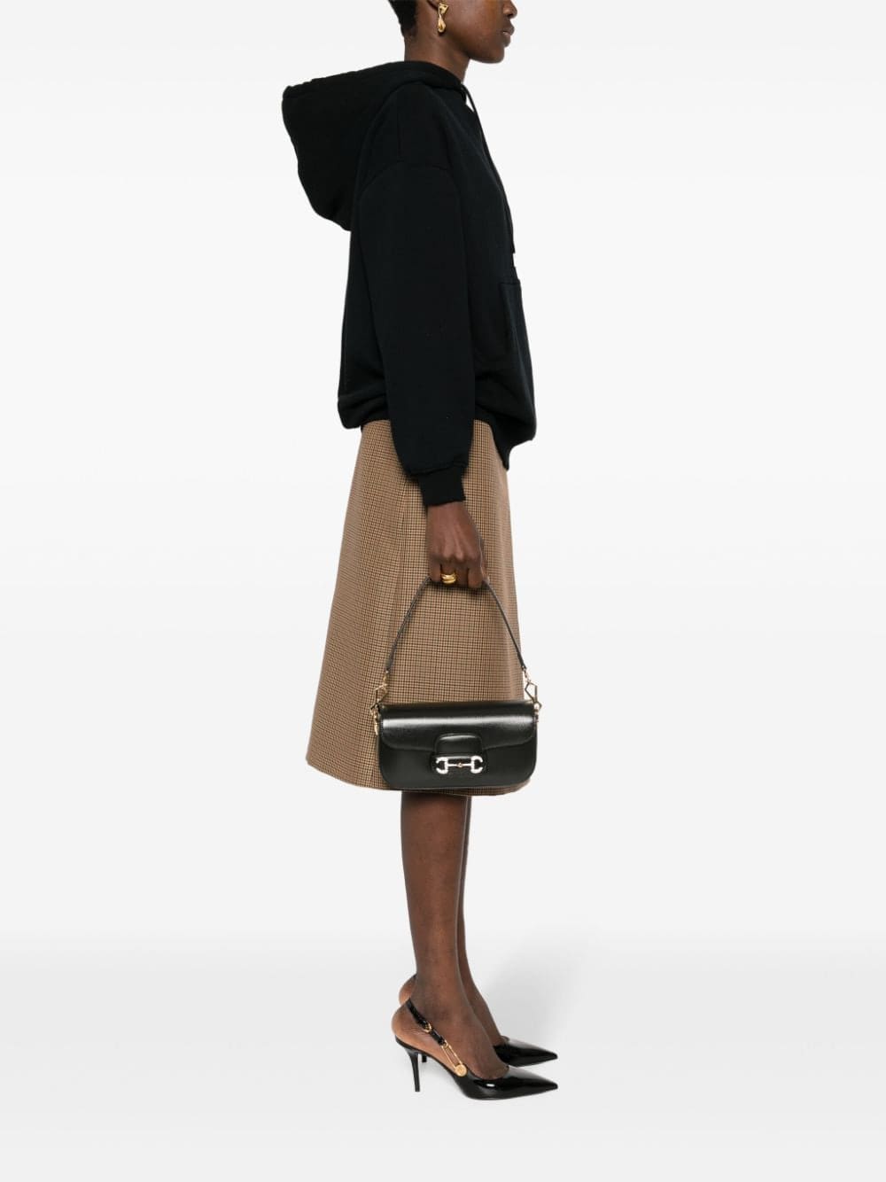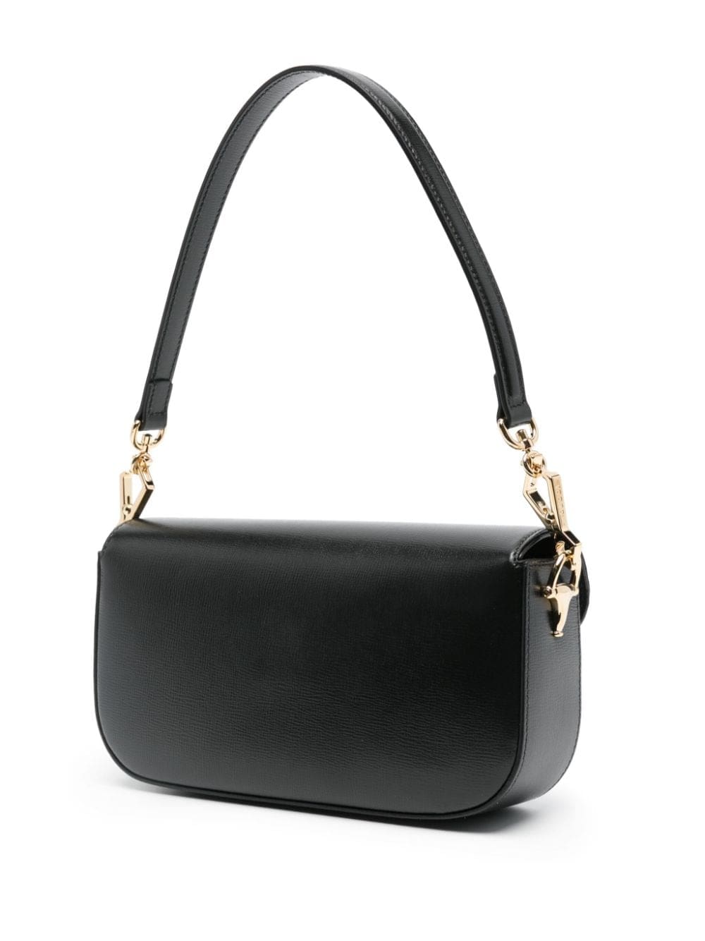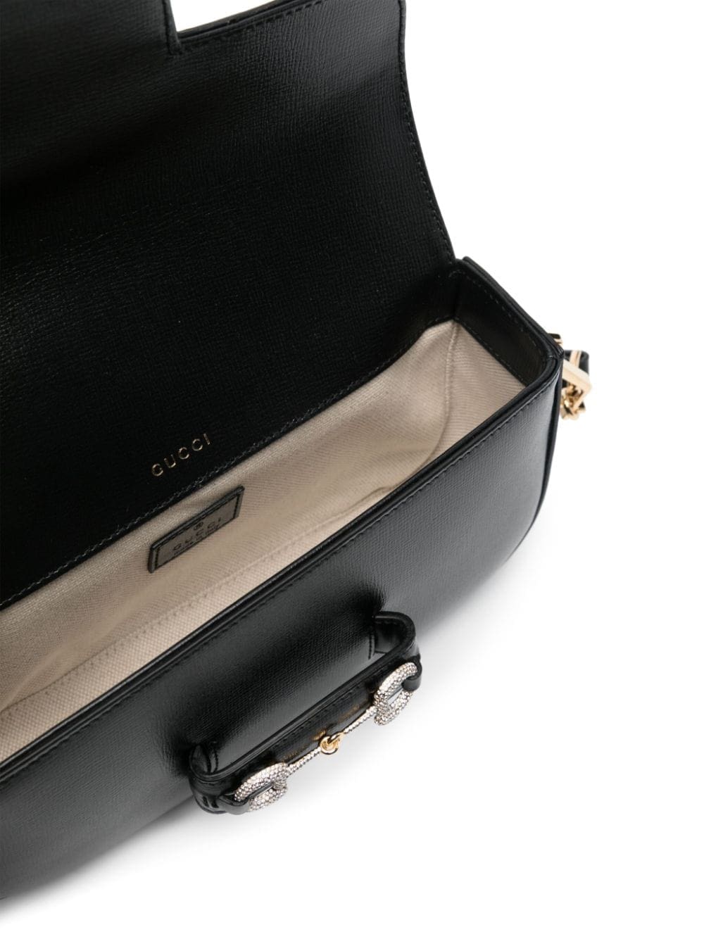 Gucci merges iconic House codes to recreate an archival design that dates back to 1955. This iteration is presented in black leather and draws attention to the label's equestrian roots with the Horsebit detail that decorates the front flap.