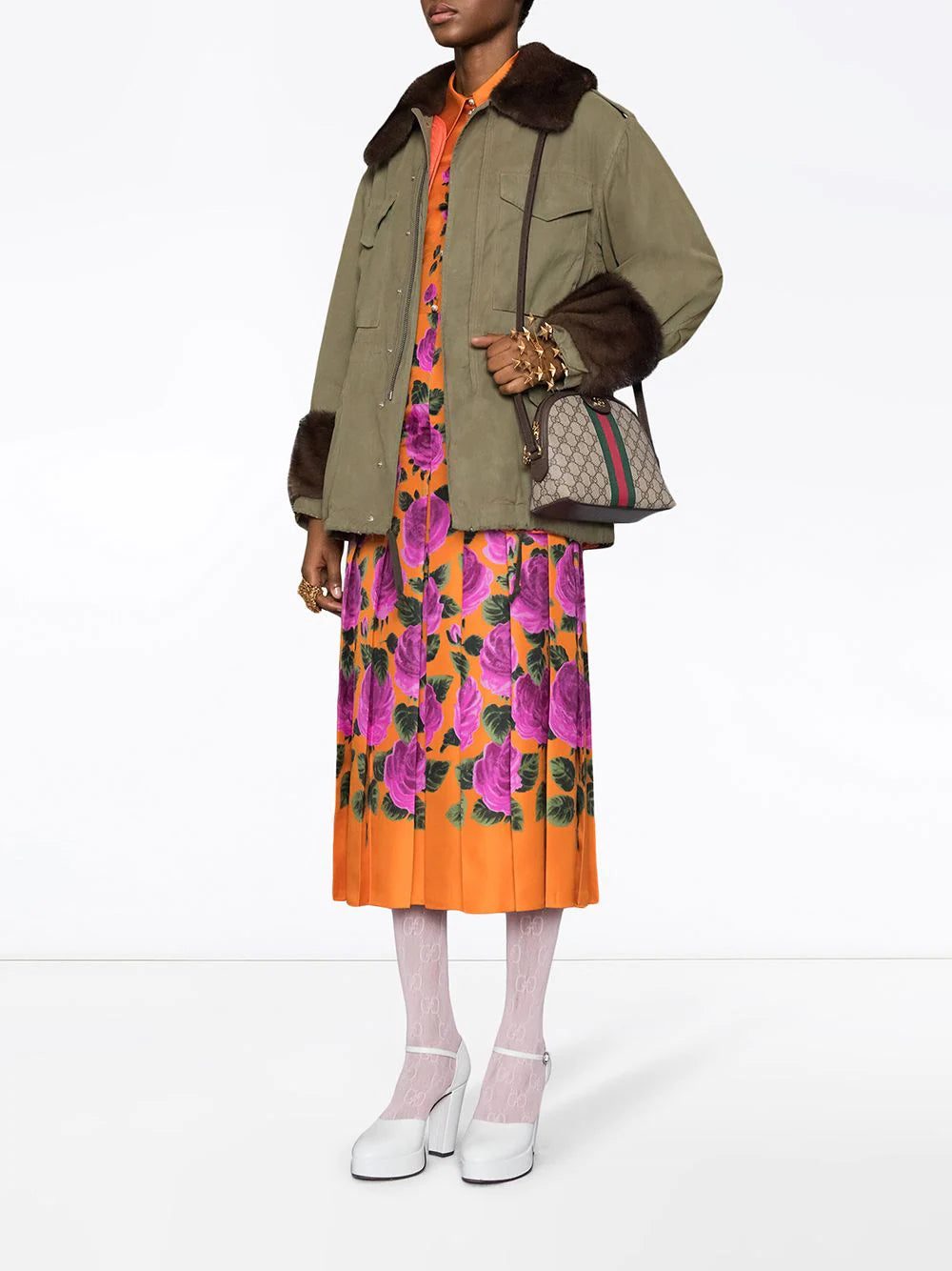 Gucci pays homage to their rich Italian heritage through iconic elements from the brand’s archives. The creative director explores new, modern paths to achieve this goal. Crafted from GG Supreme canvas, this small Ophidia GG shoulder bag from Gucci features an adjustable shoulder strap, a top zip fastening, a green and red Web, a metal Double G, gold-tone hardware, leather trims, internal slip pockets and Double G charms.