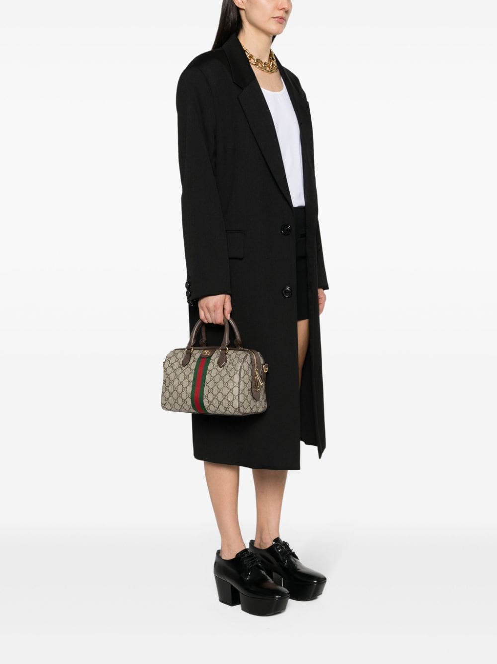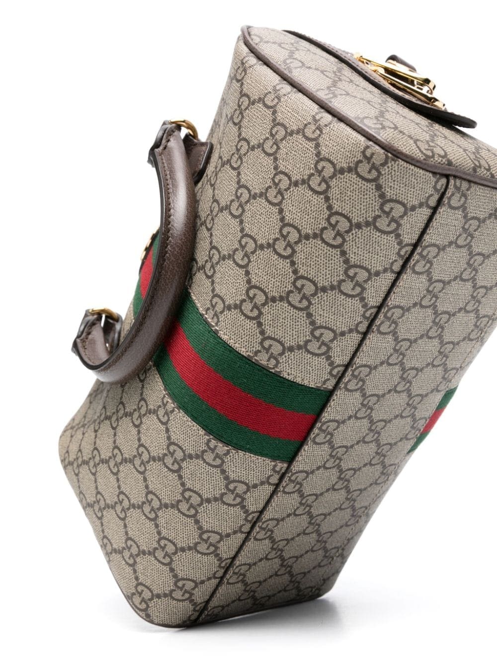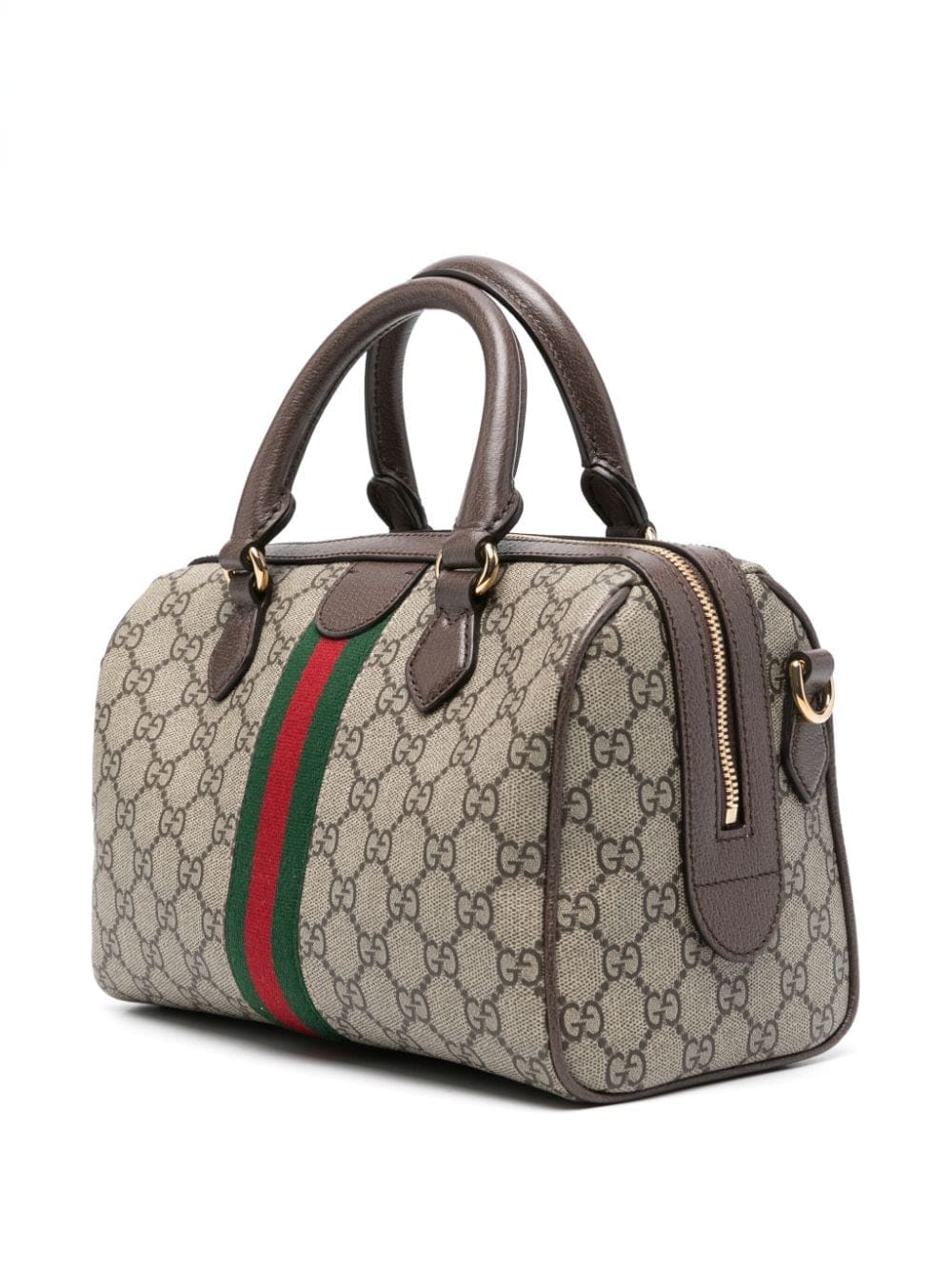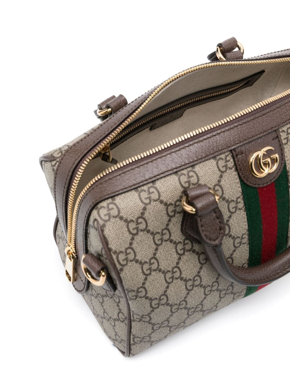 Gucci's Ophidia line is an exploration of the maison's rich heritage. This small iteration is crafted from signature GG Supreme canvas, an evolution of the original created by founder Guccio Gucci in 1930. It boasts a structured silhouette with two top handles and an adjustable, detachable shoulder strap, allowing different carrying options, and a zip-fastening pocket to store essentials. It is trimmed with leather, while a gold-tone Double G logo plaque and Web detailing round out the branded theme.
