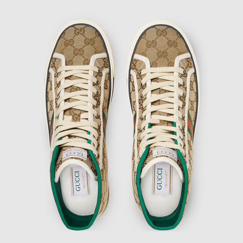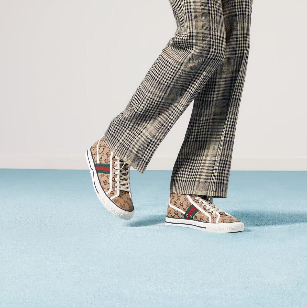 The Gucci Tennis 1977 sneaker is presented in a high-top version for the Pre-Fall 2020 collection. The sneaker is crafted from a monogram canvas that combines with the textured GG motif at the sole and the House Web. The style is finished with a dedicated label with the name of the line and a subtle embroidered detail of the number 77.