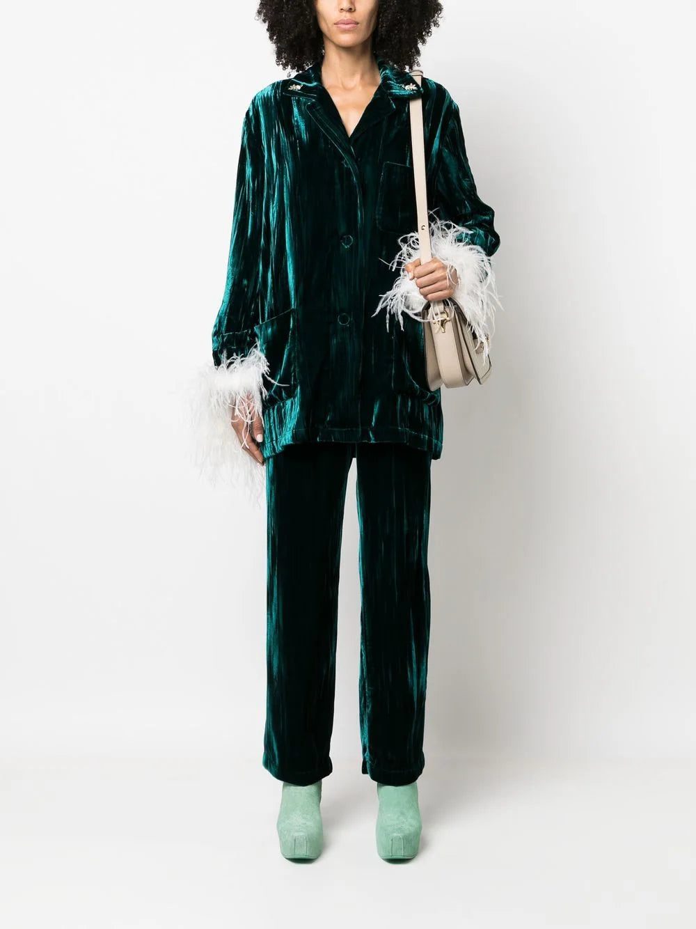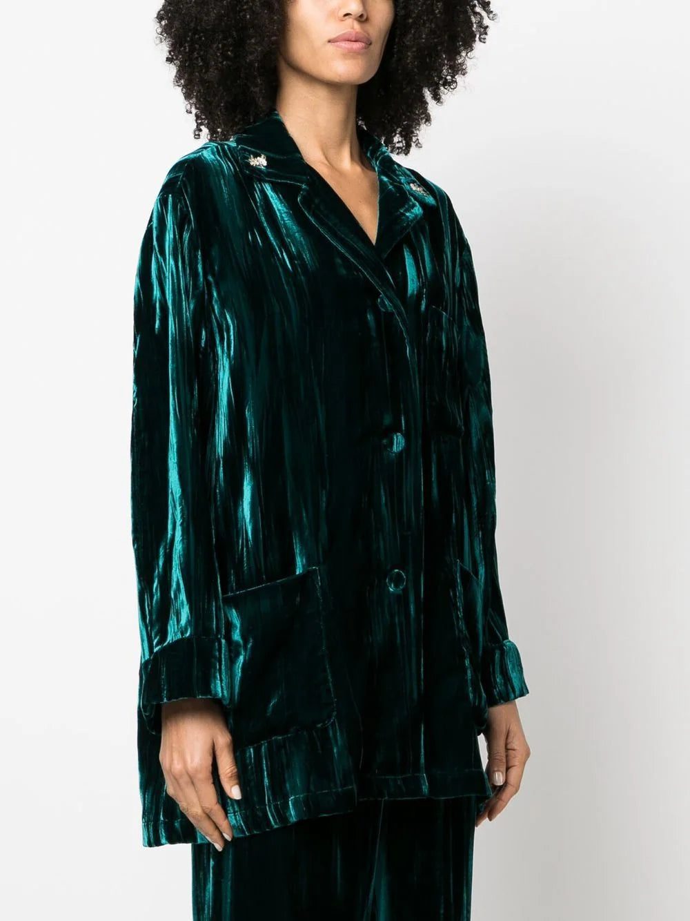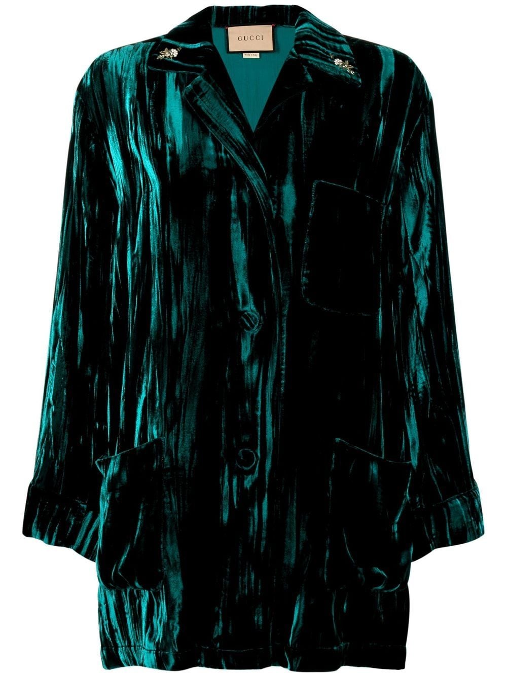 velvet-effect three-pocket shirt from Gucci featuring dark green, velvet effect, notched collar, front button fastening, long sleeves, chest patch pocket, two front patch pockets and straight hem.