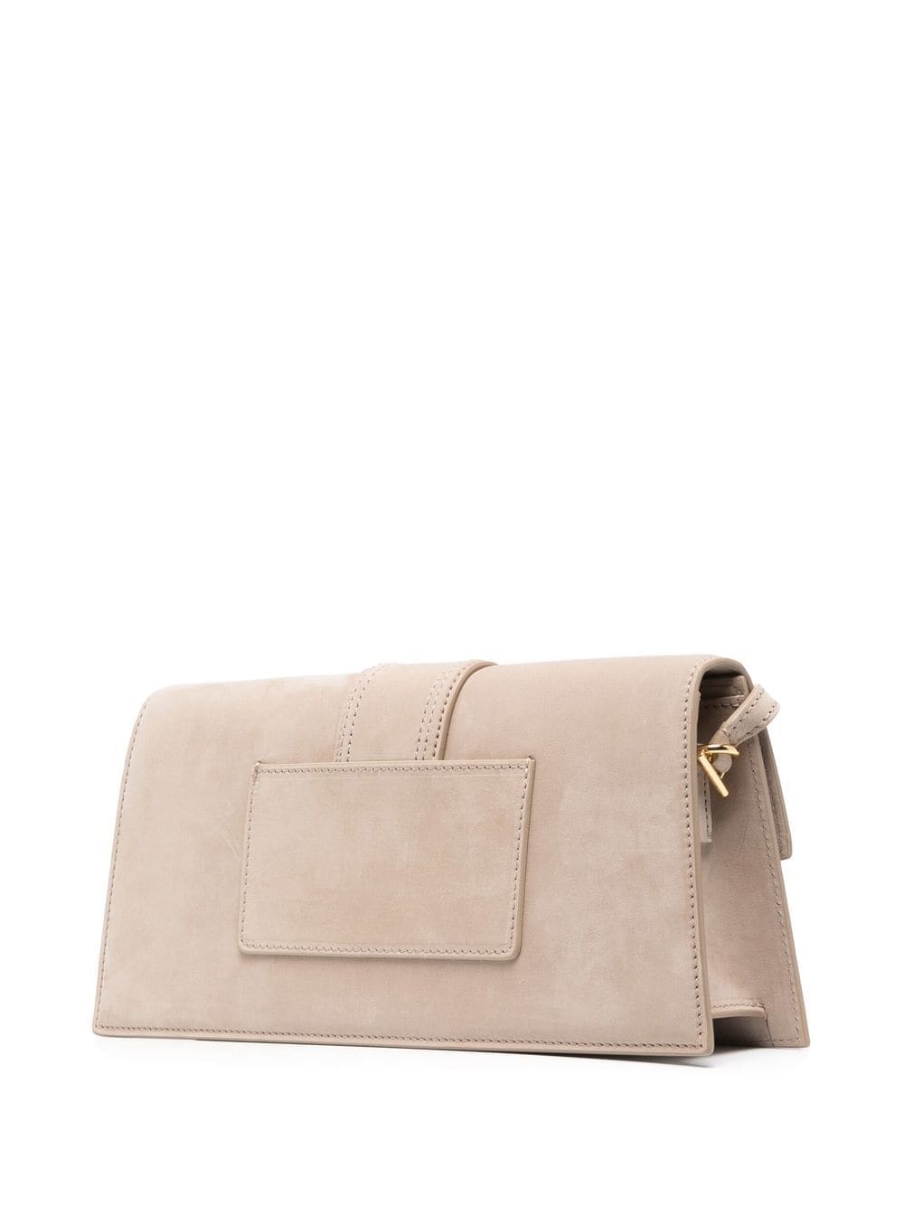 Le Bambino shoulder bag from Jacquemus featuring light beige, calf leather, gold-tone hardware, gold-tone logo lettering, single shoulder strap, foldover top with magnetic fastening, main compartment, internal slip pocket and slip pocket to the rear.