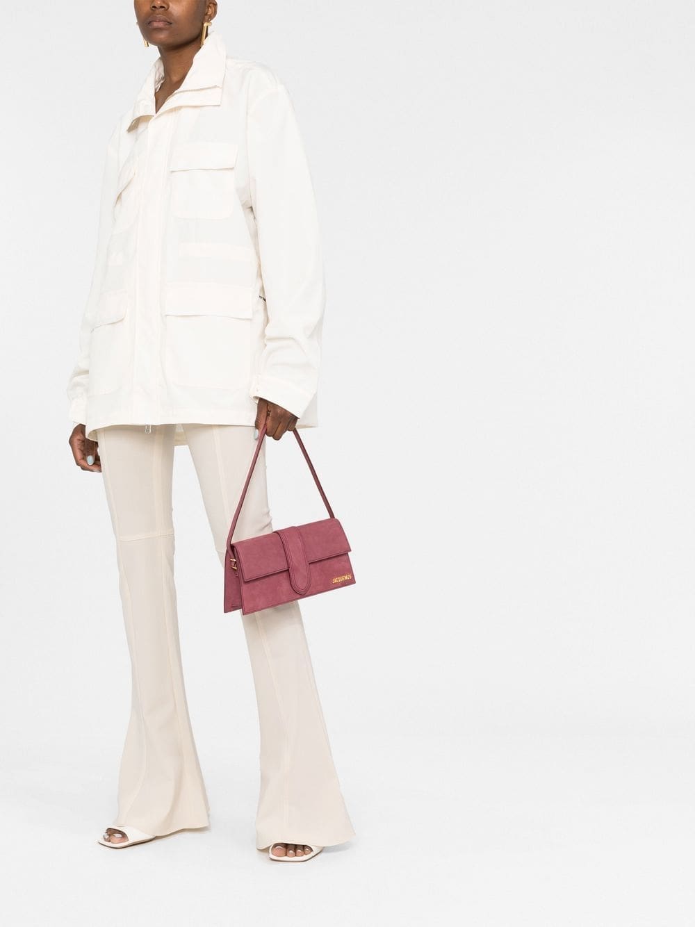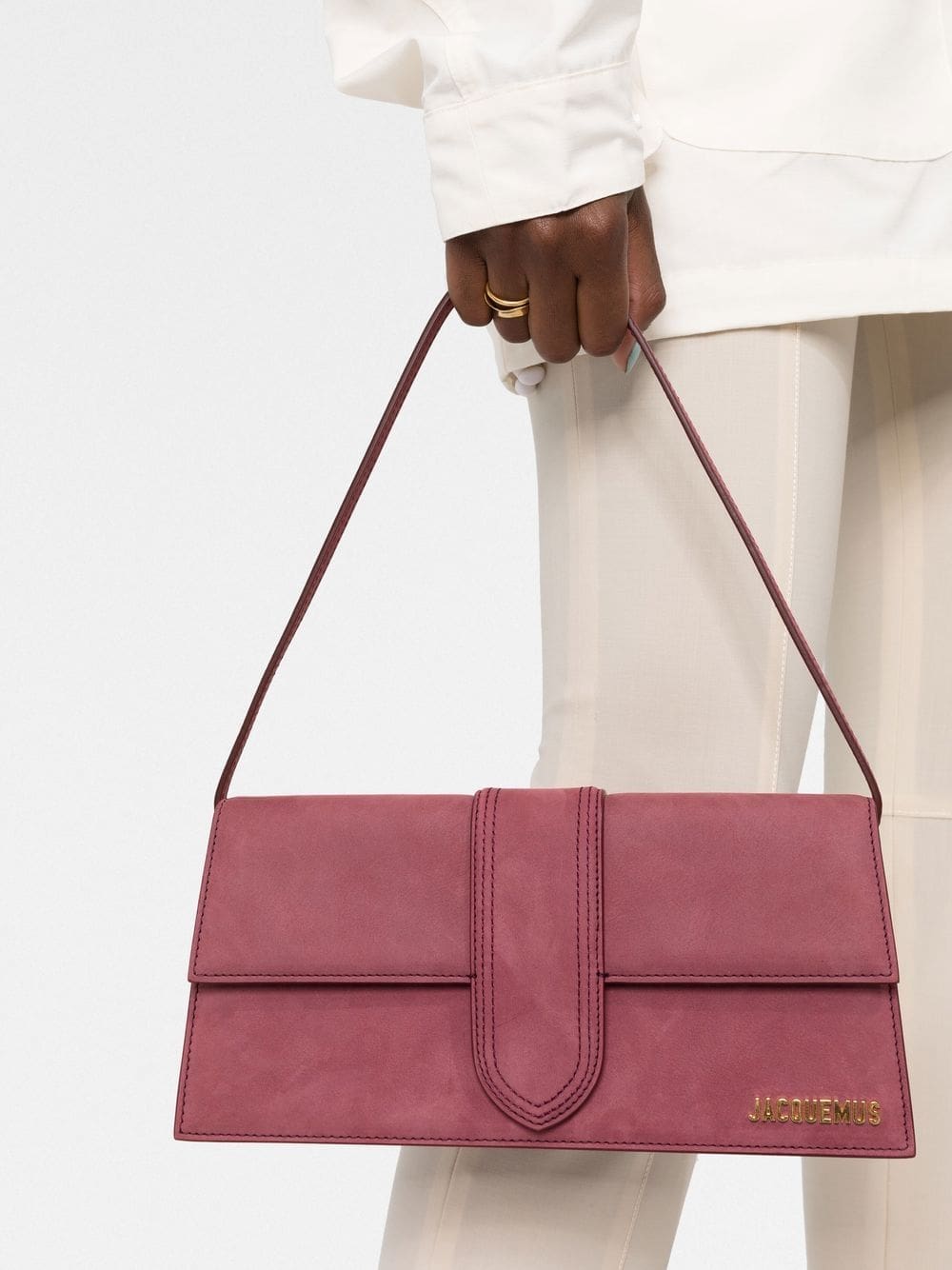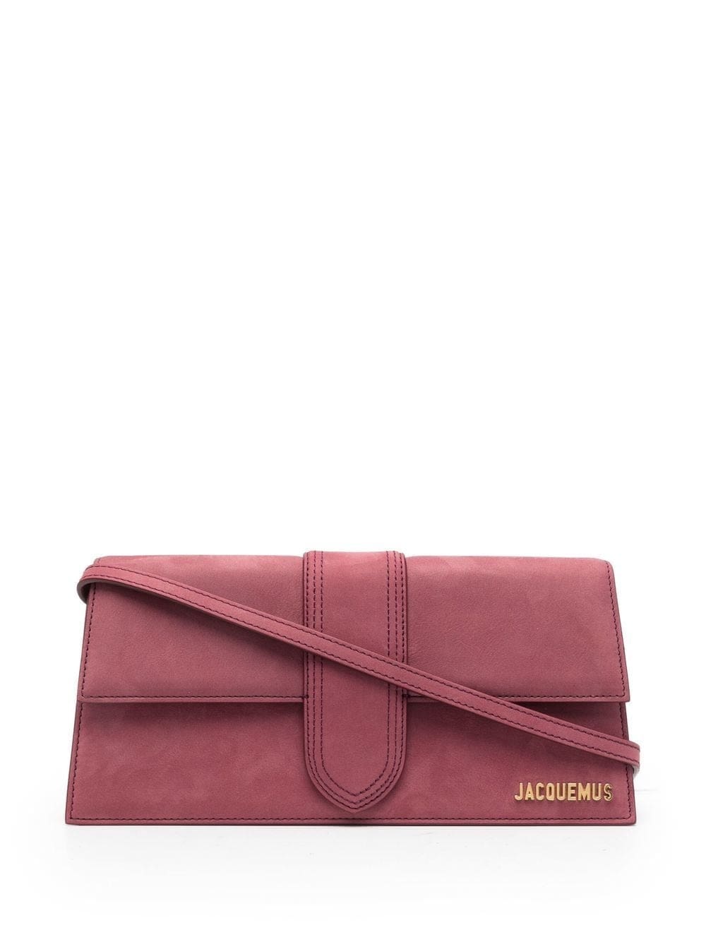A larger iteration of one of their signature styles, Jacquemus' Le Bambino amplifies the brand's penchant for minimal, structured handbags. Crafted from smooth calf suede with a single shoulder strap, the design is adorned with gold-tone logo lettering to the front.