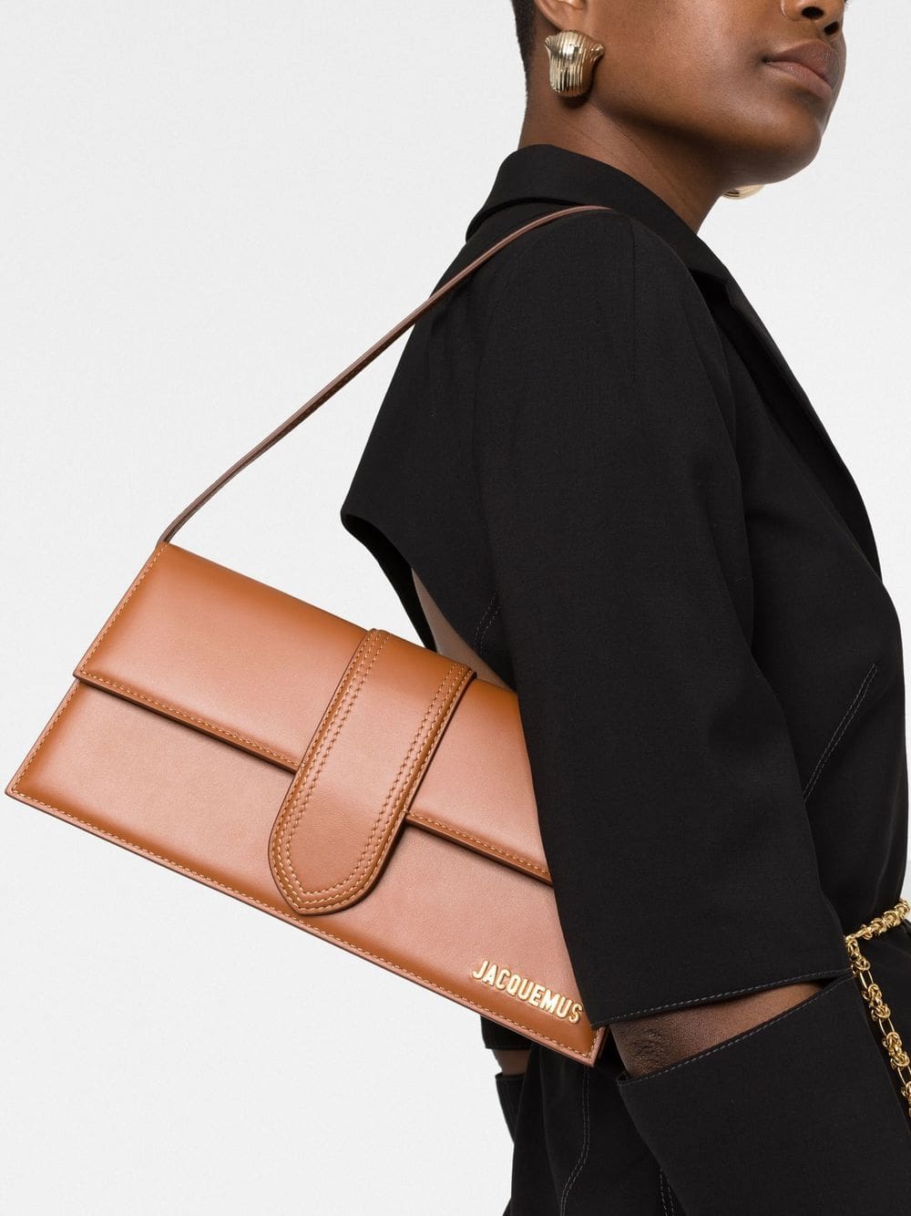 A larger iteration of one of their signature styles, Jacquemus' Le Bambino amplifies the brand's penchant for minimal, structured handbags. Crafted from smooth calf leather with a single shoulder strap, the design is adorned with gold-tone logo lettering to the front.