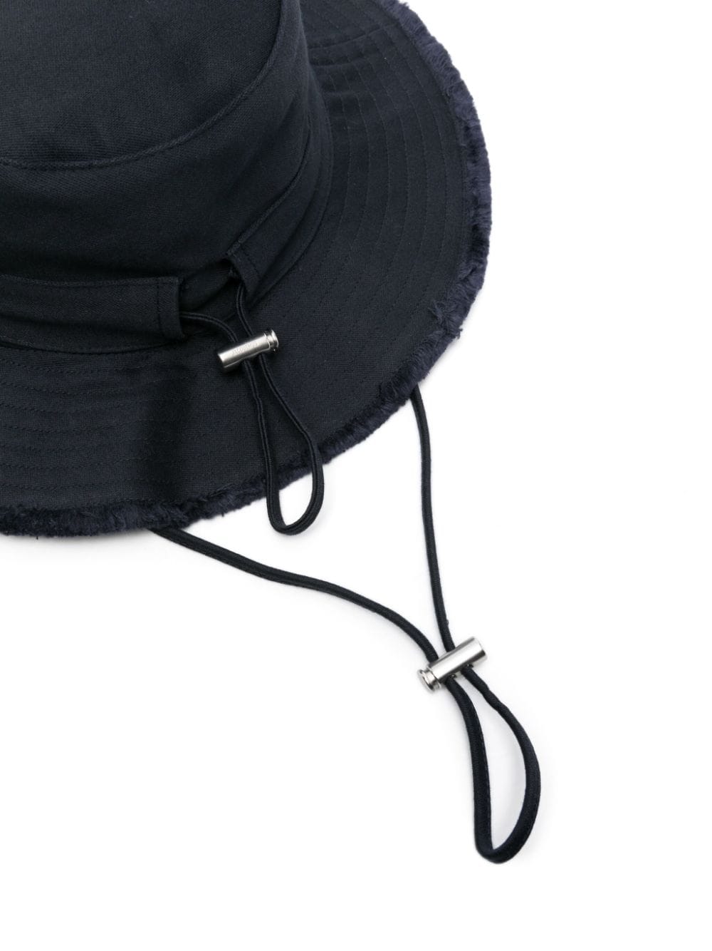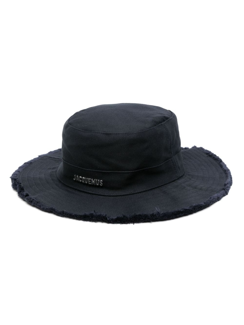 Crafted from breathable cotton and adorned with a signature logo plaque at the front, Jacquemus' nature-inspired aesthetic is evident in this blue bucket hat. With frayed edges for a distressed finish, the accessory can be adjusted with a drawstring.