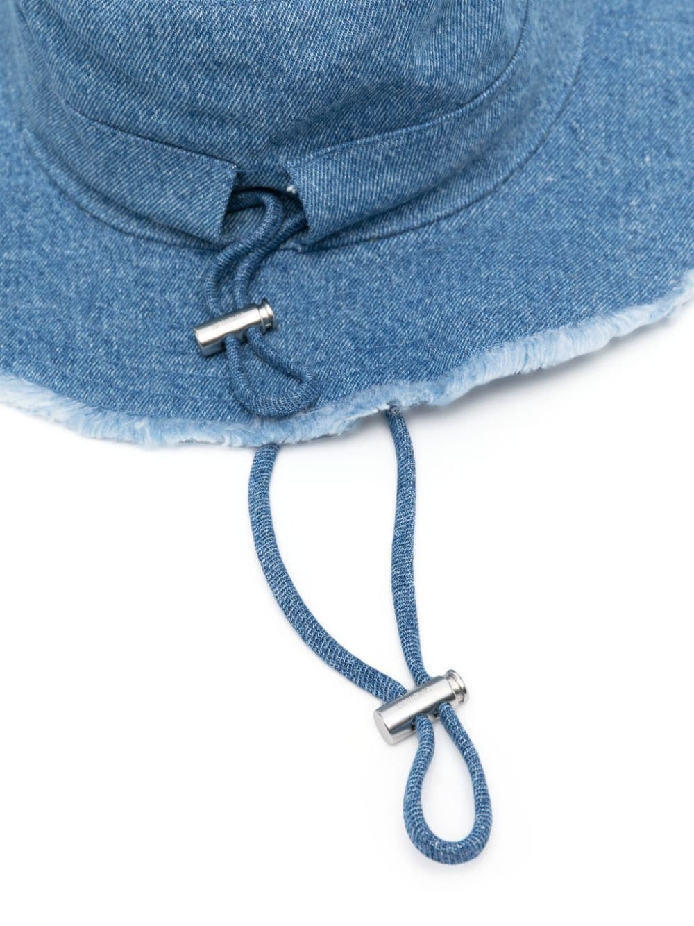 Crafted from cotton and adorned with a signature logo plaque at the front, Jacquemus' nature-inspired aesthetic is evident in this denim bucket hat. With frayed edges for a distressed finish, the accessory can be adjusted with a drawstring.