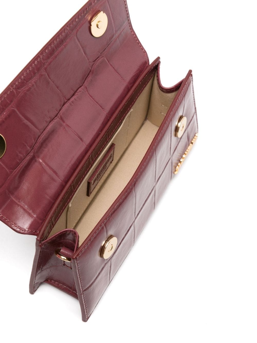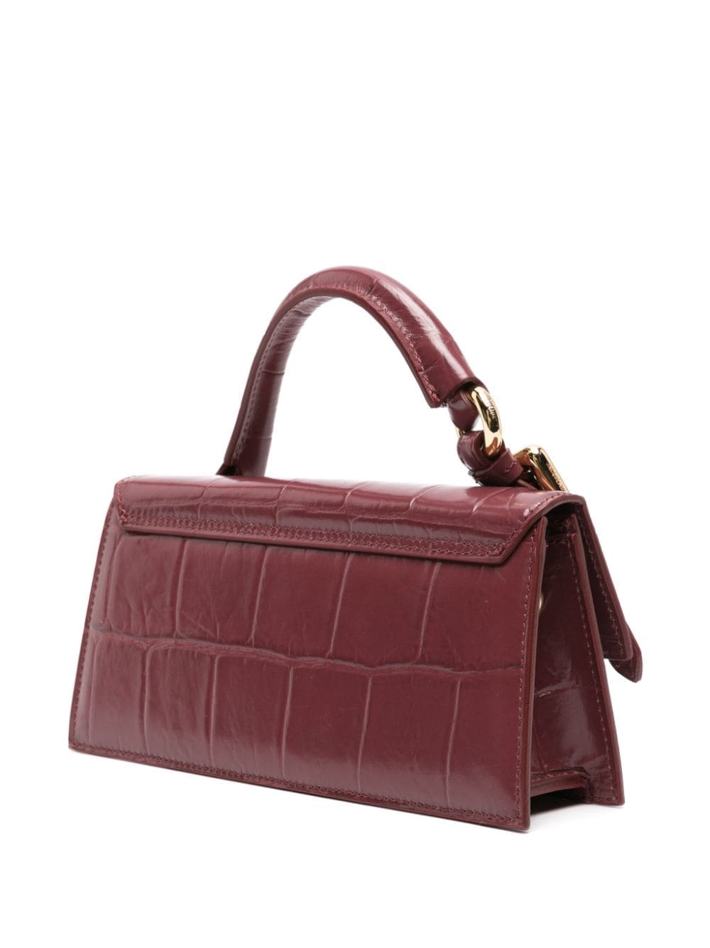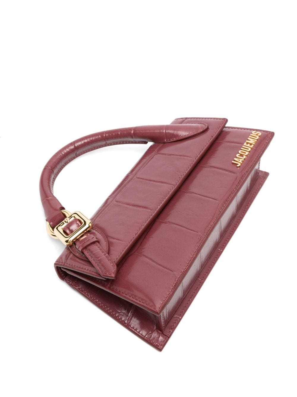 Debuted in AW19, the Chiquito bag has become an iconic Jacquemus symbol. Seen here in a crocodile-embossed version, the silhouette is presented in a burgundy hue and accented with a gold-tone lettering logo.