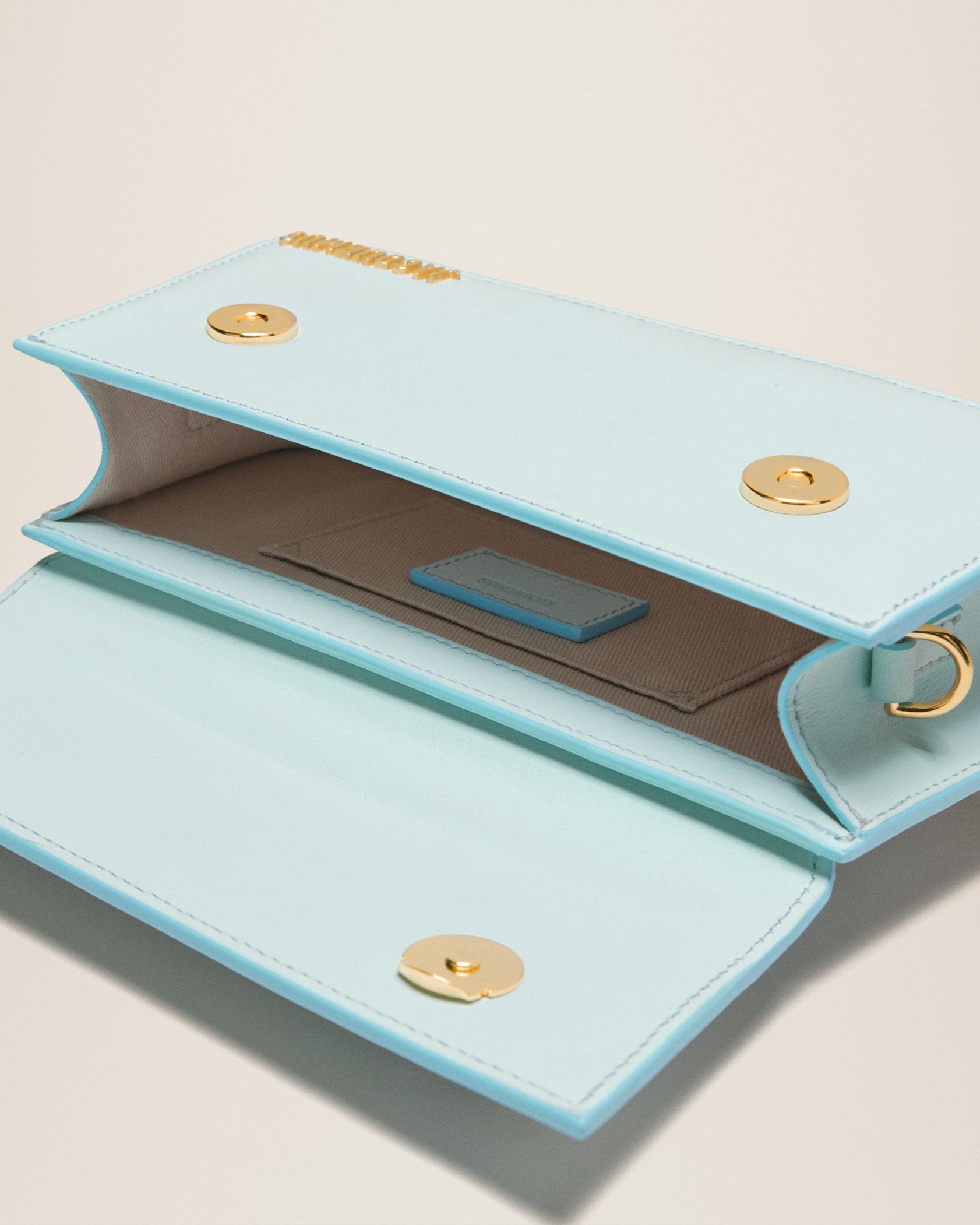 - Gold metal logo and hardware