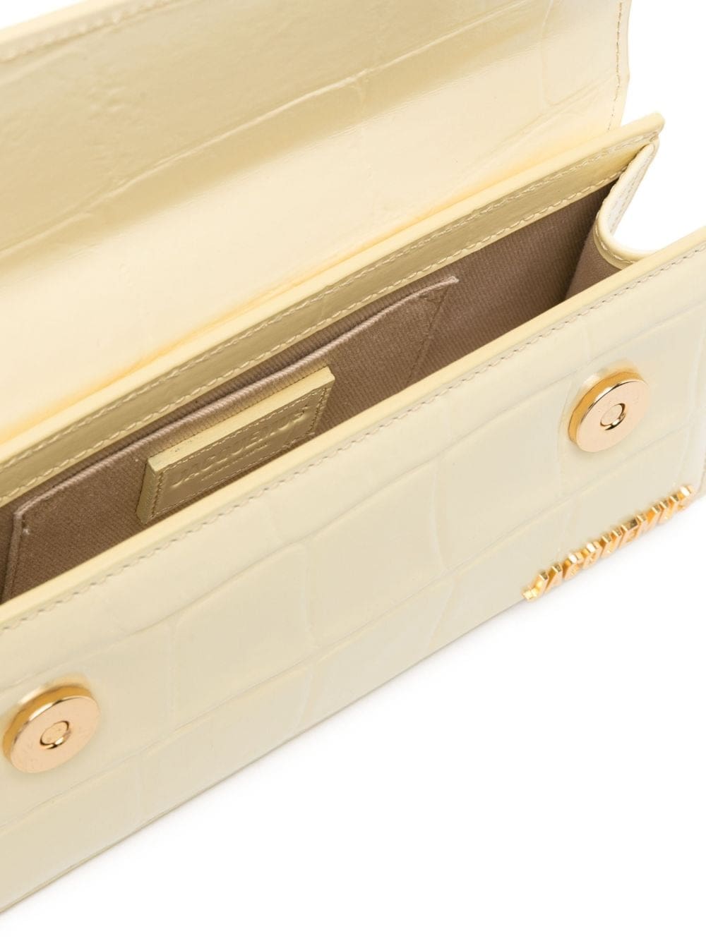 French label Jacquemus is coveted for its expansive line of trapeze bags like this Le Chiquito Long tote. It’s crafted in pale-yellow leather with a tactile mock-croc finish and embellished with gold-tone circle and square hardware at the top handle, which is unexpectedly placed at the front flap.