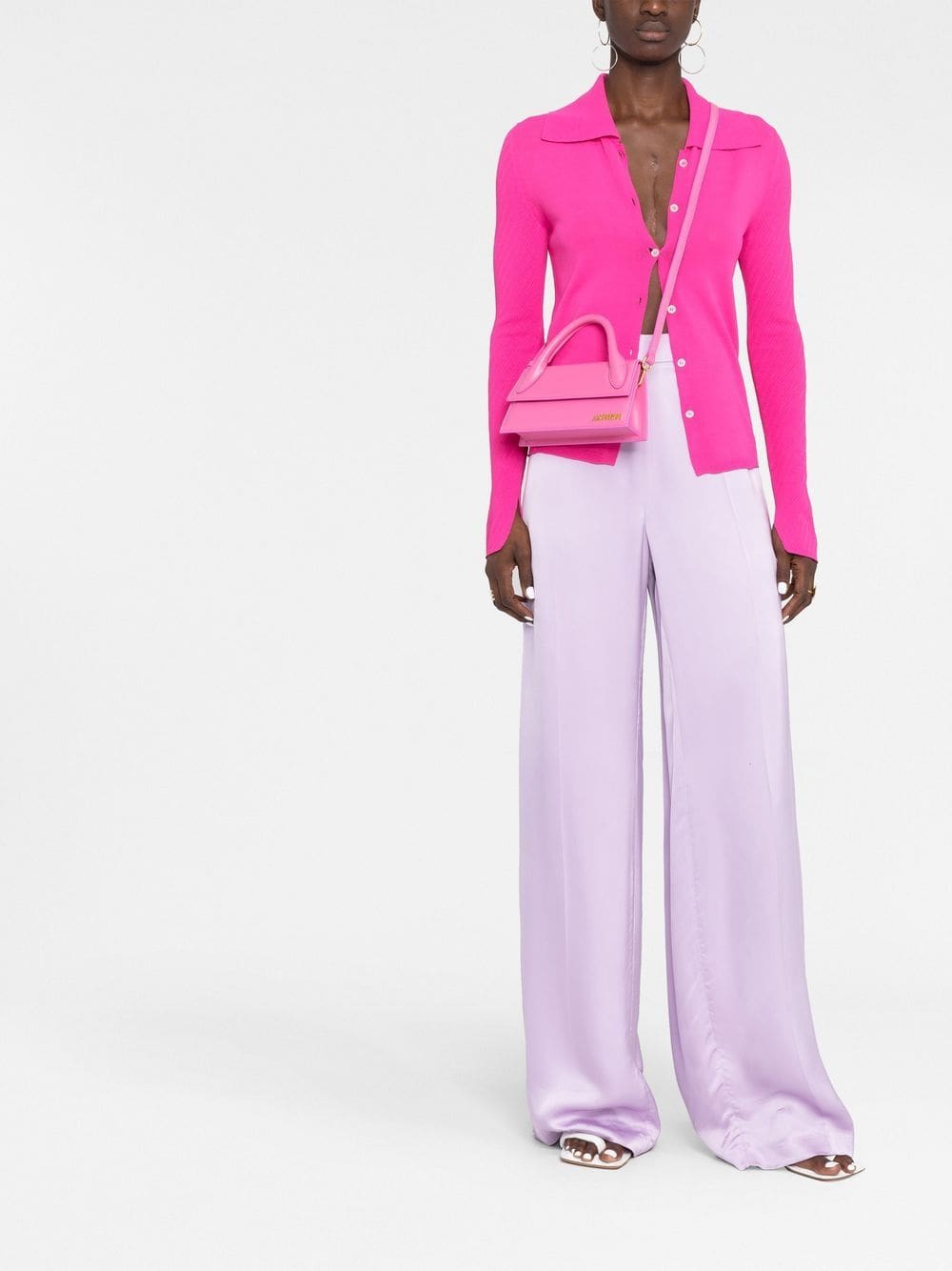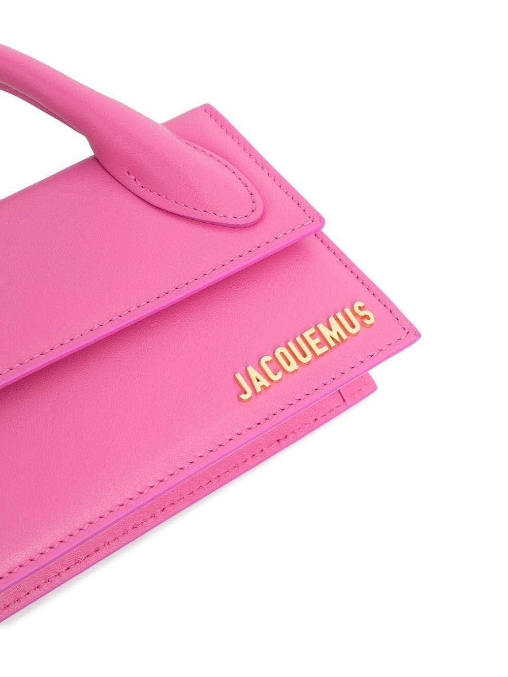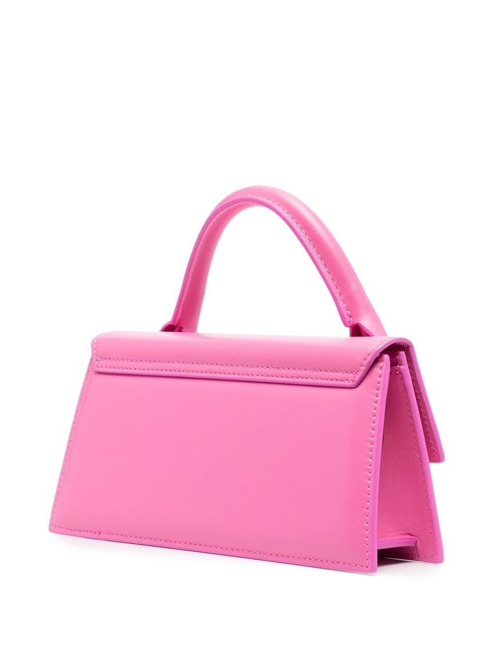 Le Chiquito long tote bag from JACQUEMUS featuring pink, calf leather, gold-tone logo plaque, single circular top handle, front flap closure and adjustable detachable shoulder strap.