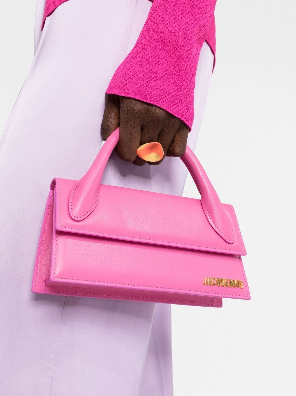 Debuted in AW19, the Chiquito bag has become an iconic Jacquemus symbol. Seen here in an elongated version, the silhouette is presented in pink calf leather and detailed with the usual gold-tone logo lettering.