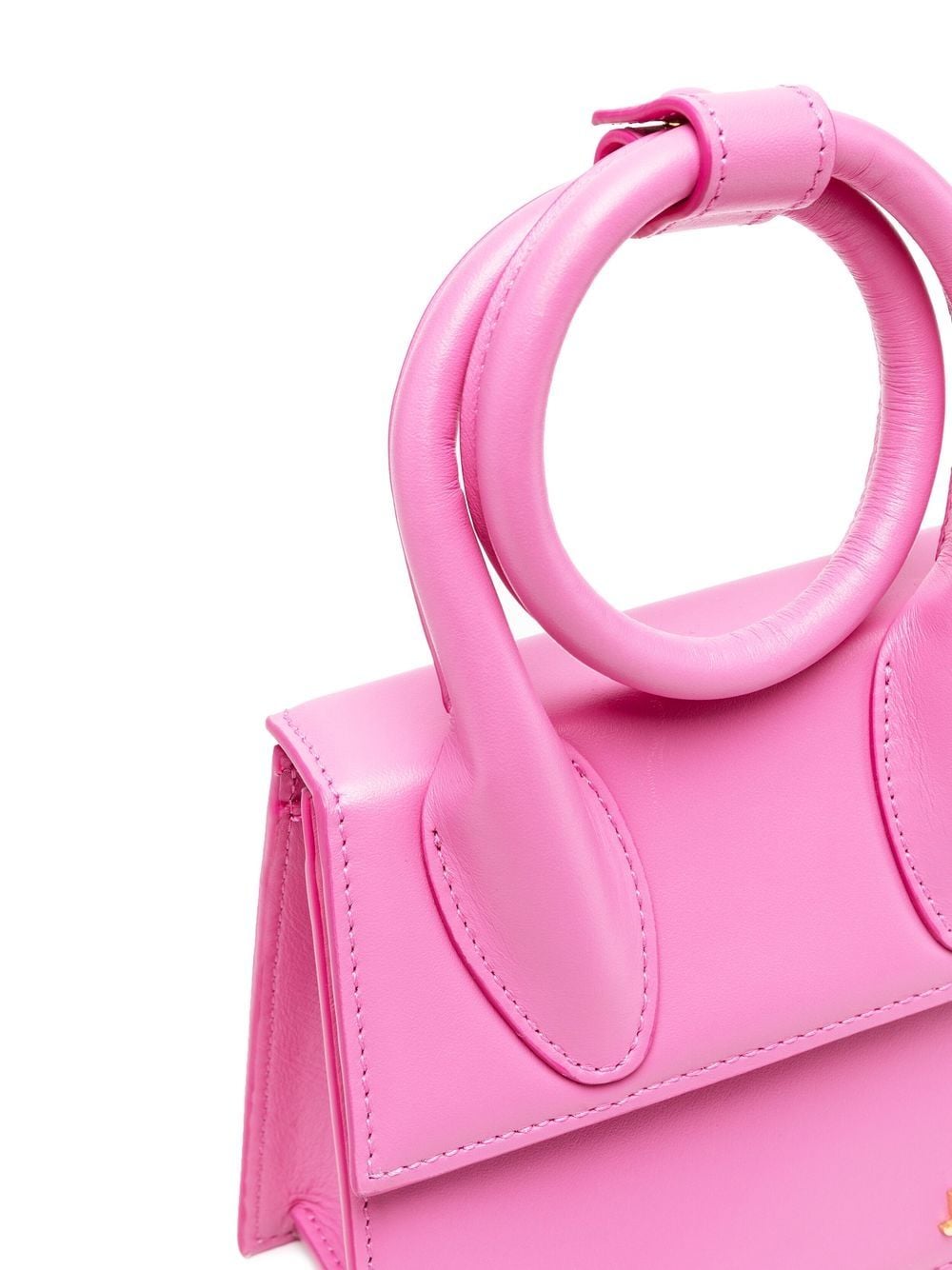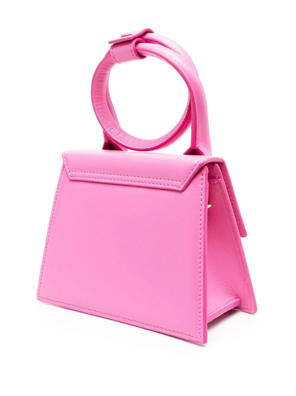 Le Chiquito Nœud mini bag from JACQUEMUS featuring pink, leather, gold-tone logo lettering, foldover top with magnetic fastening, main compartment, single rounded top handle and adjustable detachable shoulder strap.