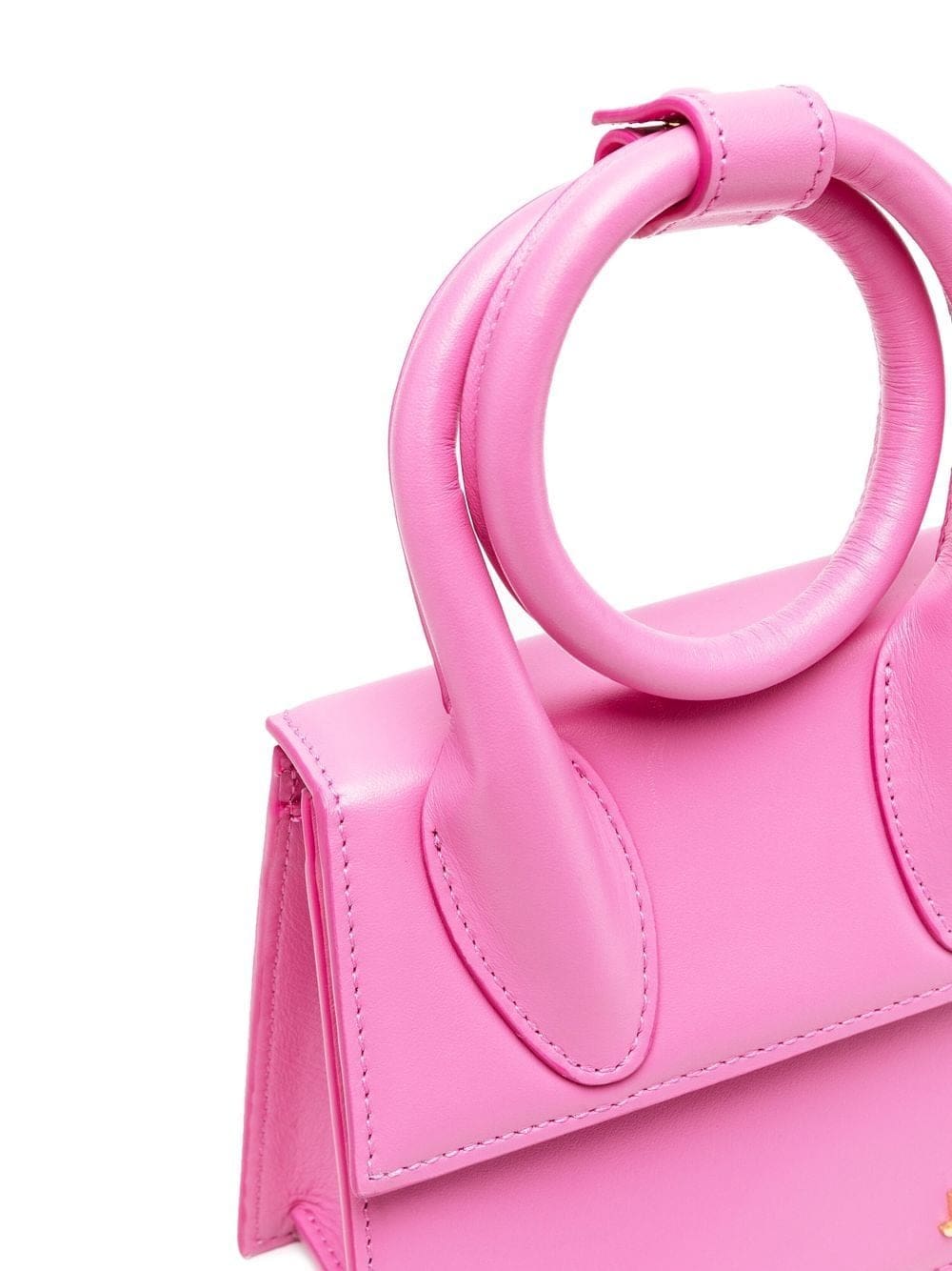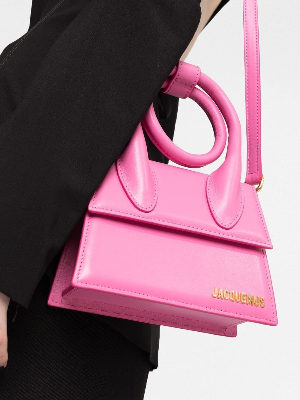 Recognised for its complex proportions, Jacquemus revisits the iconic Le Chiquito bag in its SS22 collection. As showcased here, crafted from pink leather, this Nœud iteration features a coiled top handle for a versatile update.
