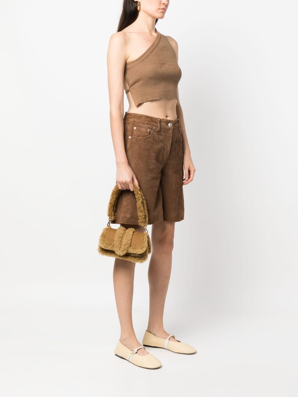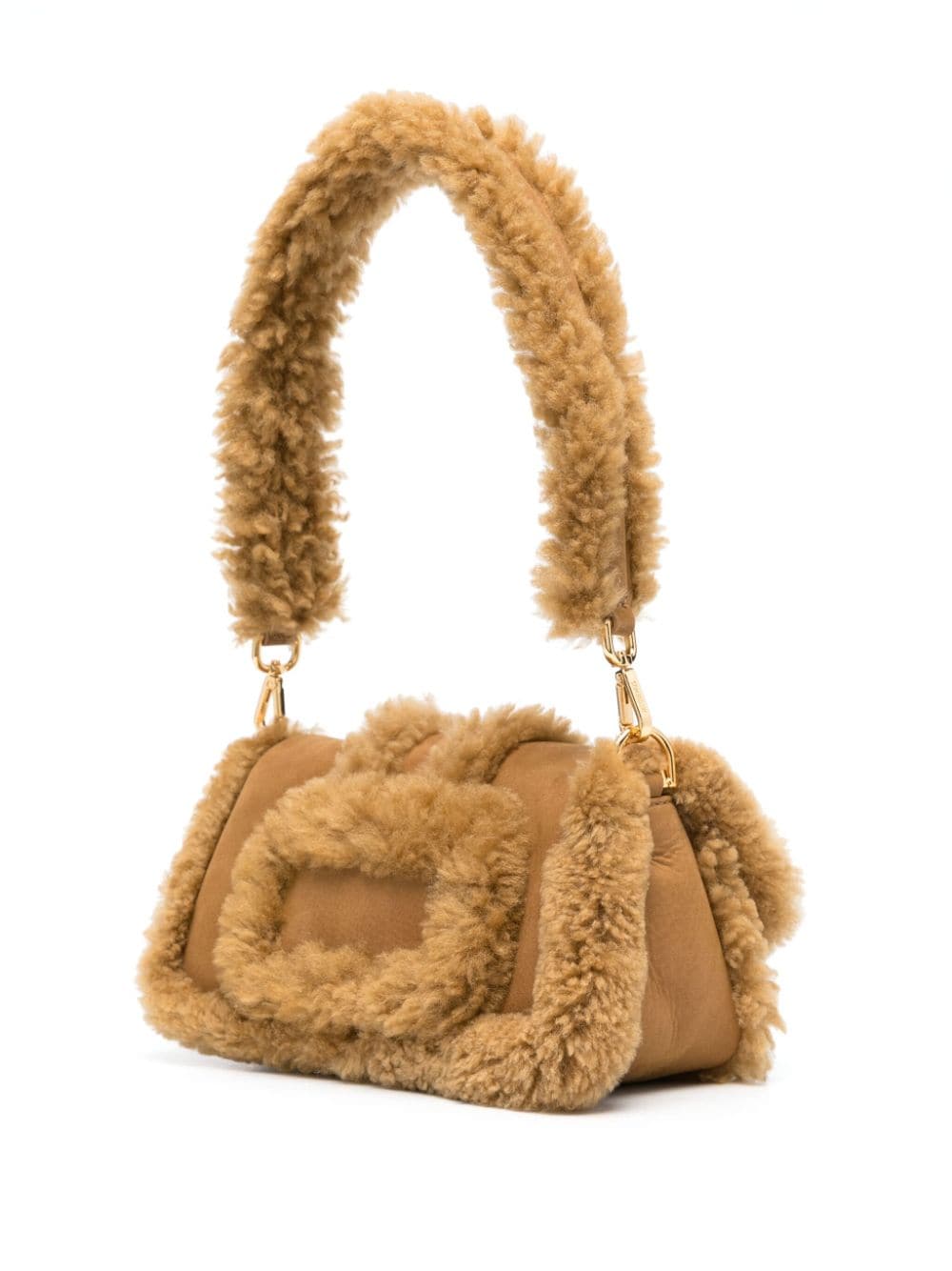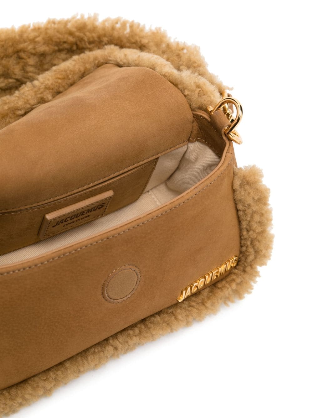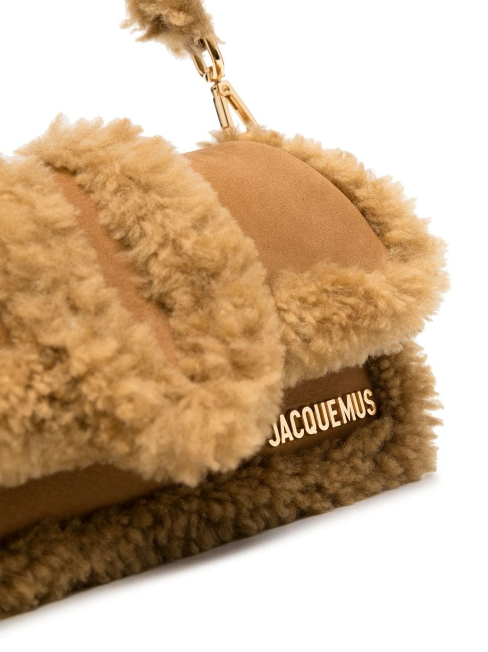 Jacquemus refreshes the iconic Bambino silhouette for AW23 in the Le petit Bambimou doux shoulder bag. It's crafted from grained leather in Italy to a padded silhouette trimmed with tonal shearling and stamped with gold-tone metal logo hardware.