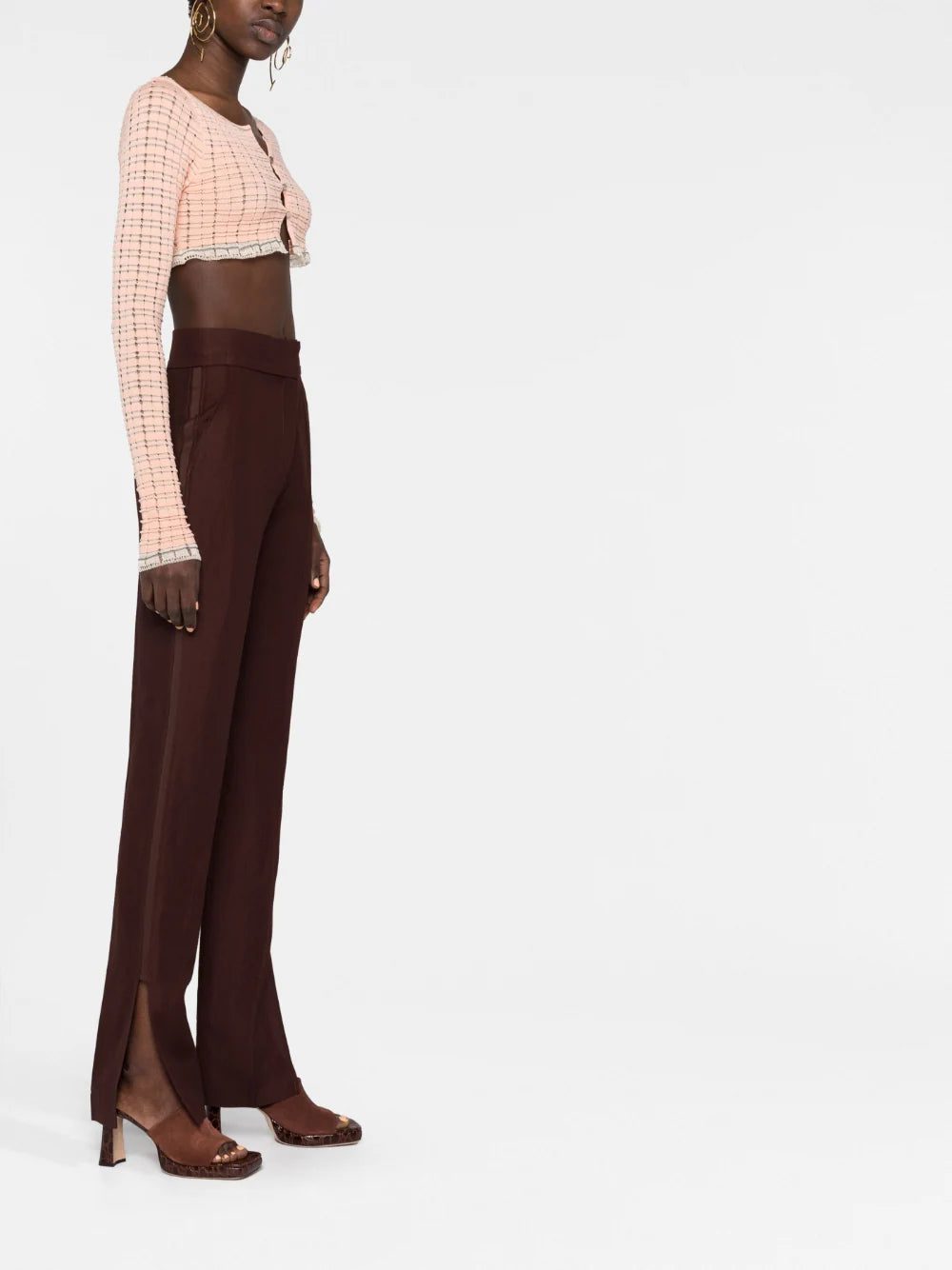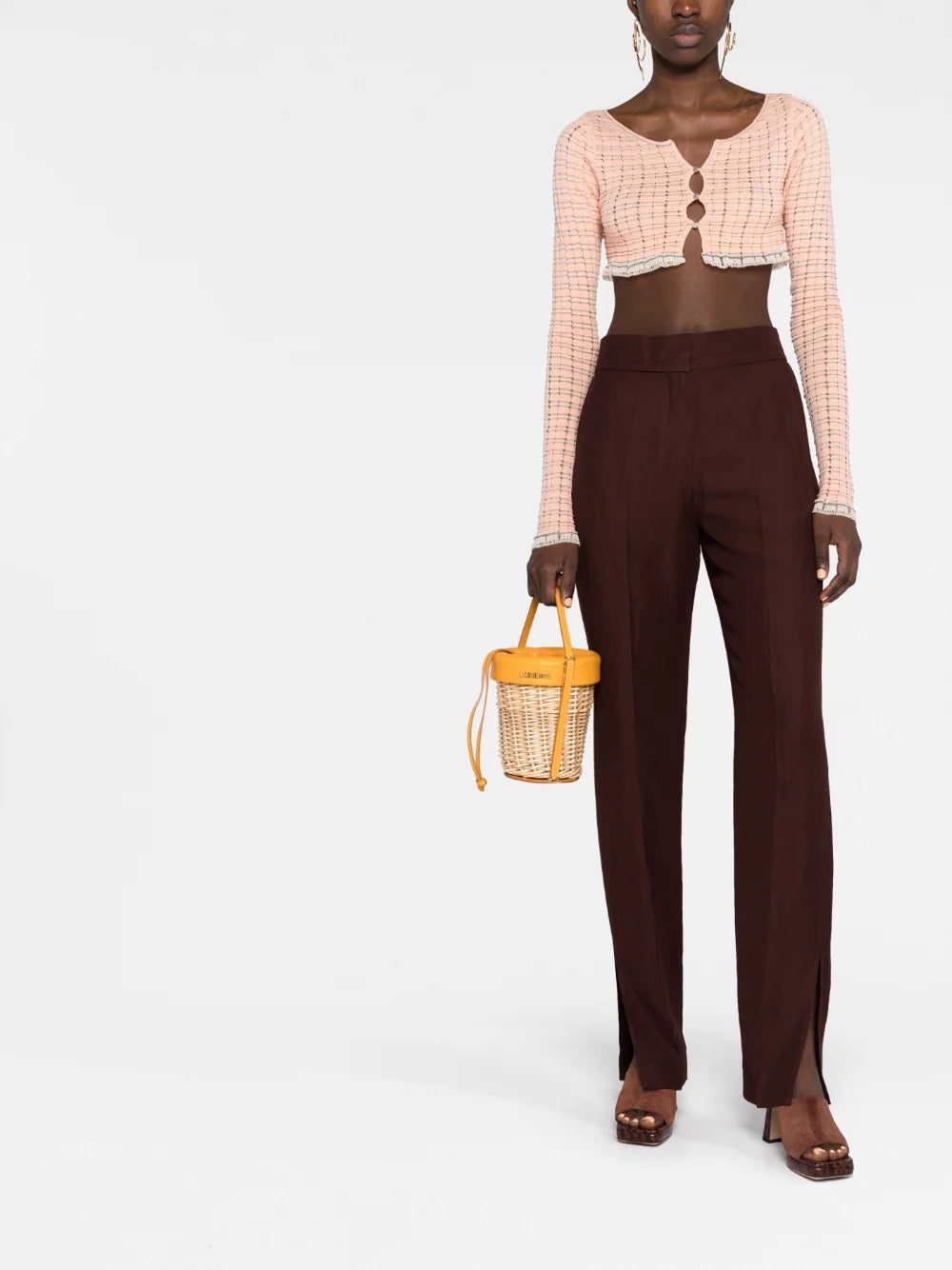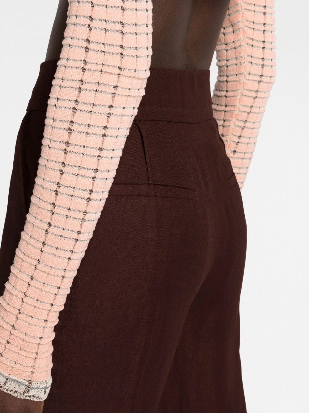Jacquemus's SS23 collection showcases tailored-focused silhouettes, as seen through these Tibau trousers. Crafted from a linen blend, they are enhanced by a ribbon insert along the side and slit hems.