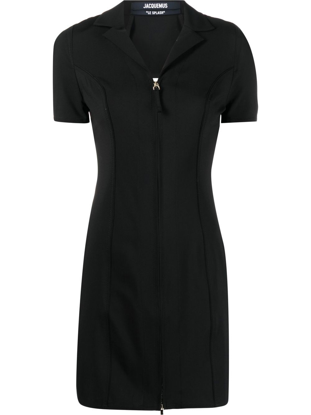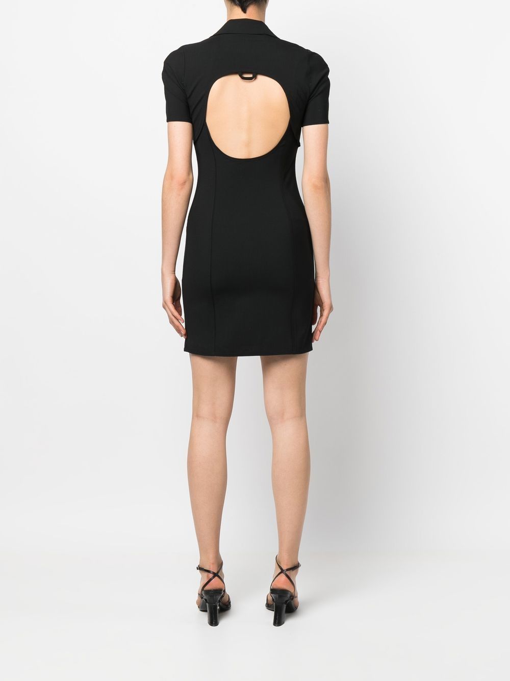 black stretch virgin wool cut-out detailing notched collar front zip fastening short sleeves straight hem thigh-length