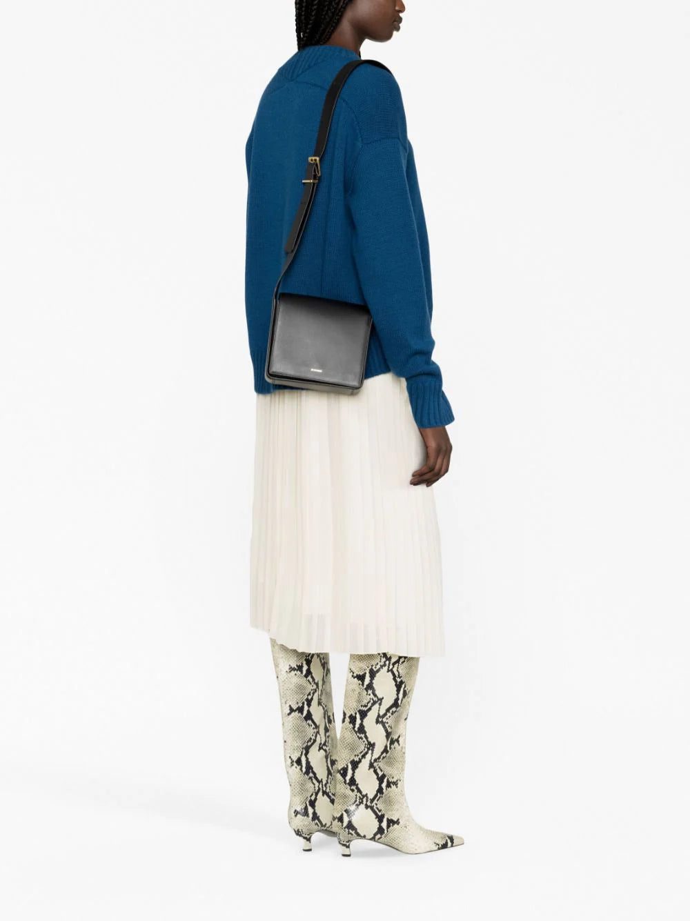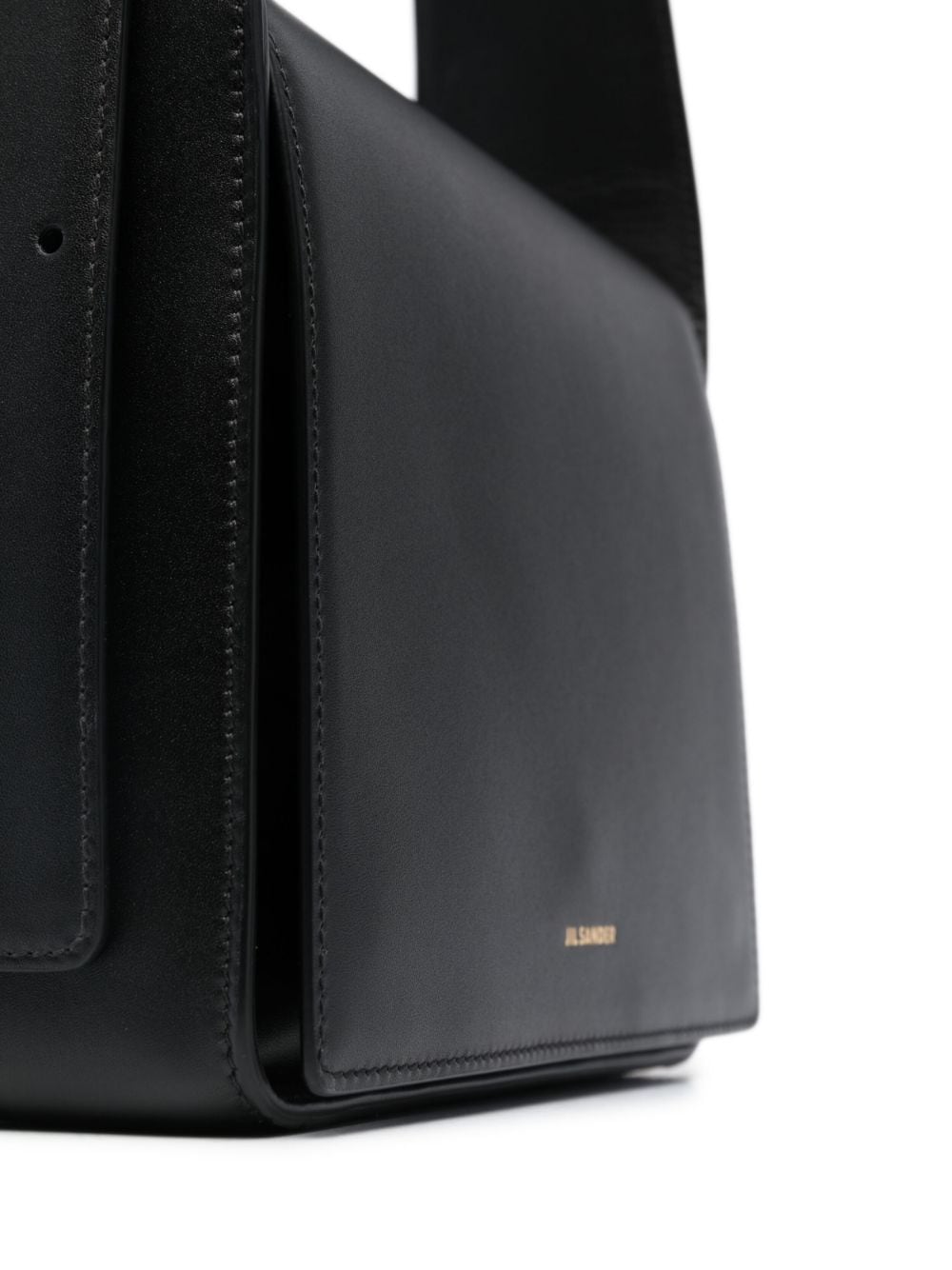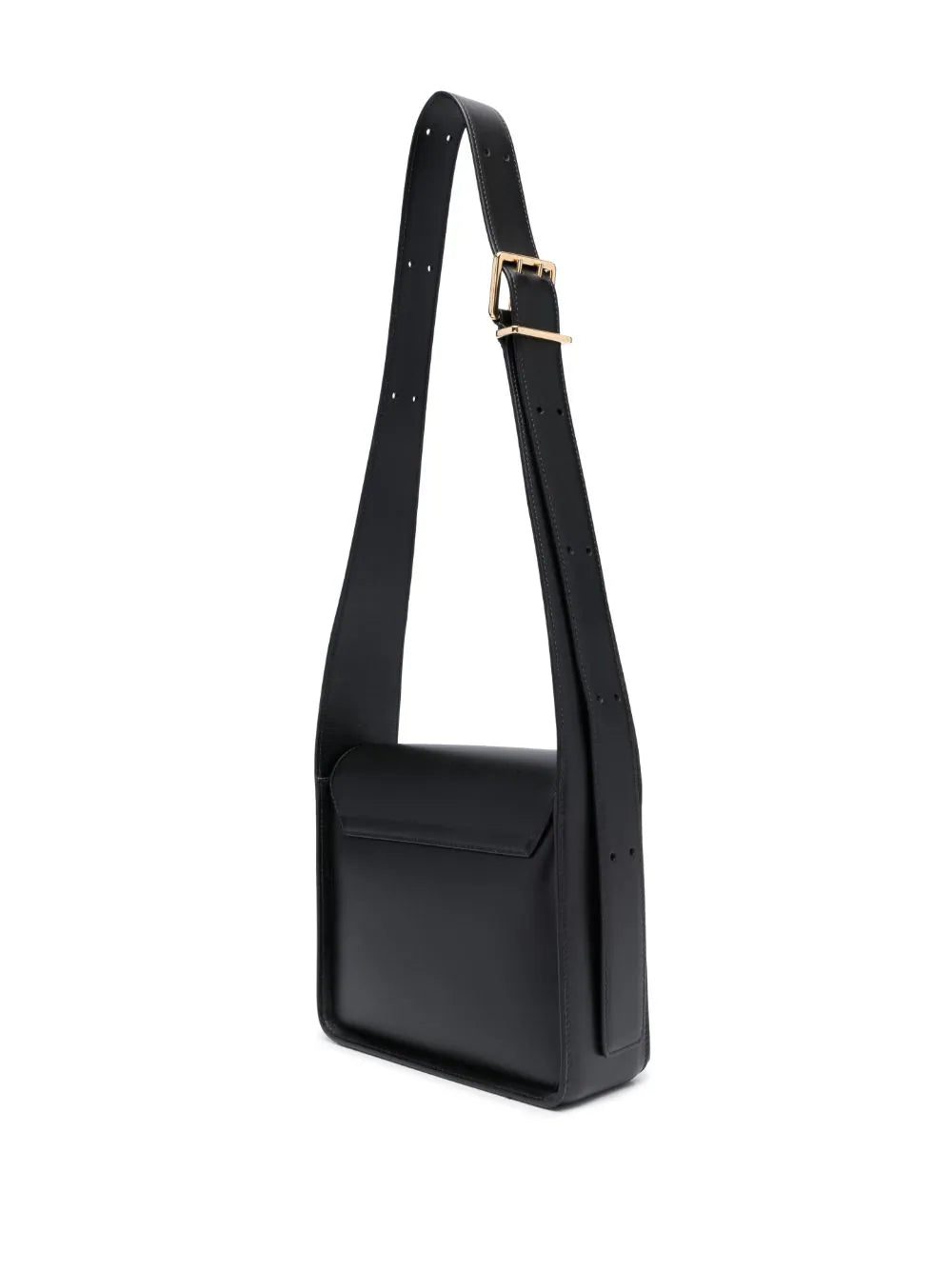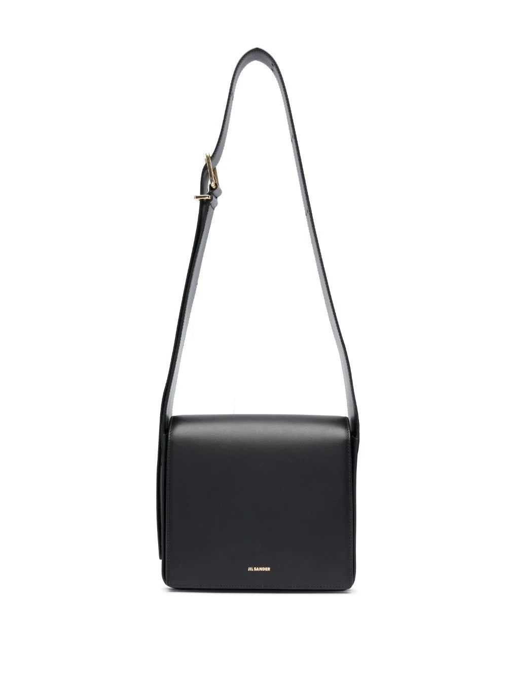 Crafted from smooth calf leather with a structured square body, Jil Sander's black shoulder bag is simply punctuated by a gold-tone logo stamp to the front. The piece features an adjustable shoulder strap and a spacious main compartment.