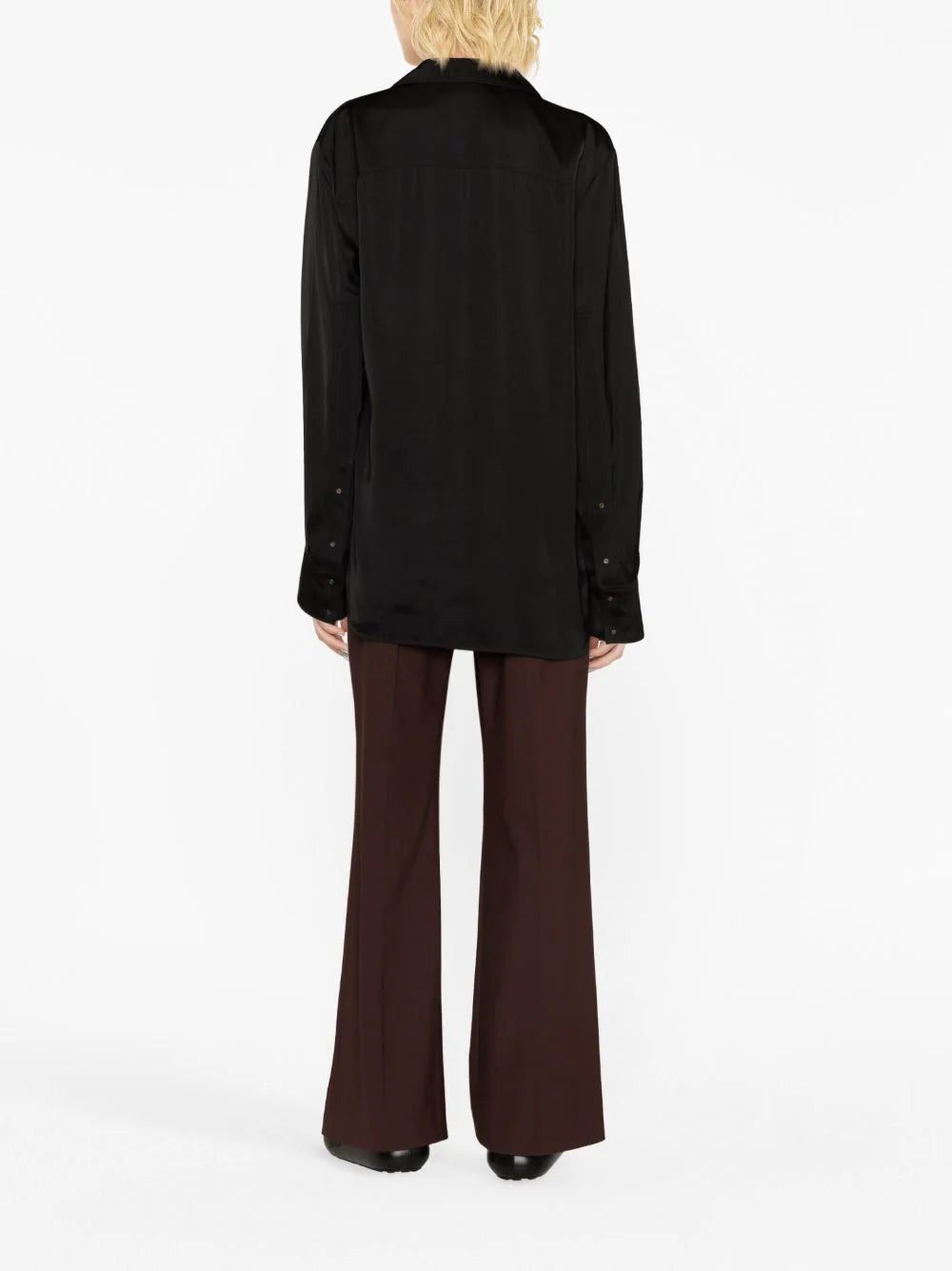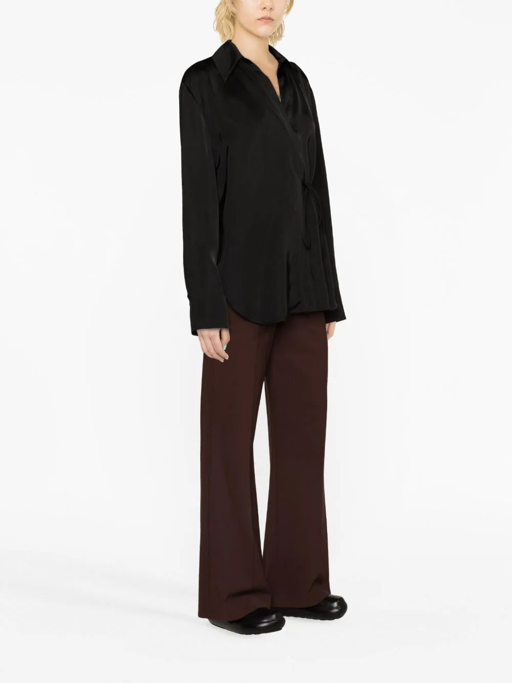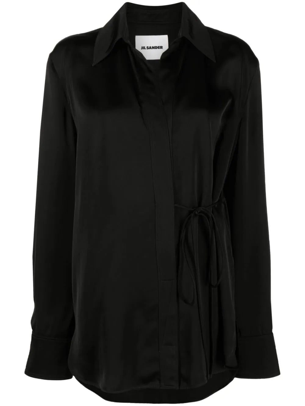 Jil Sander’s shirt is a laid-back take on classic tailoring. It’s crafted from black crepe to a wrap silhouette that secures with a delicate tie at the side.