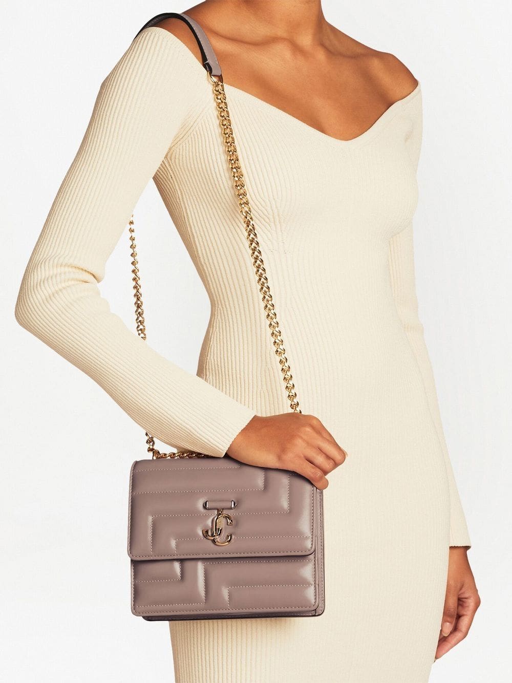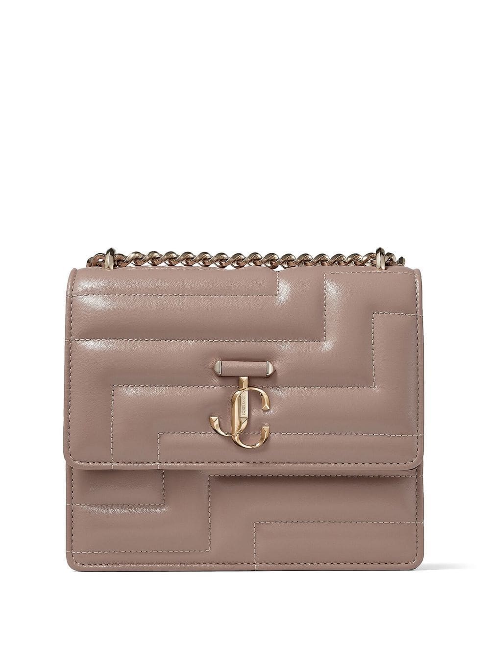 With its distinctive step-style quilting, this leather shoulder bag is unmistakably Jimmy Choo. Added brand-defining glamour is enhanced with a slight shine finish in ballet pink, while it's completed with the brand's JC emblem in complementary gold-tone metal.