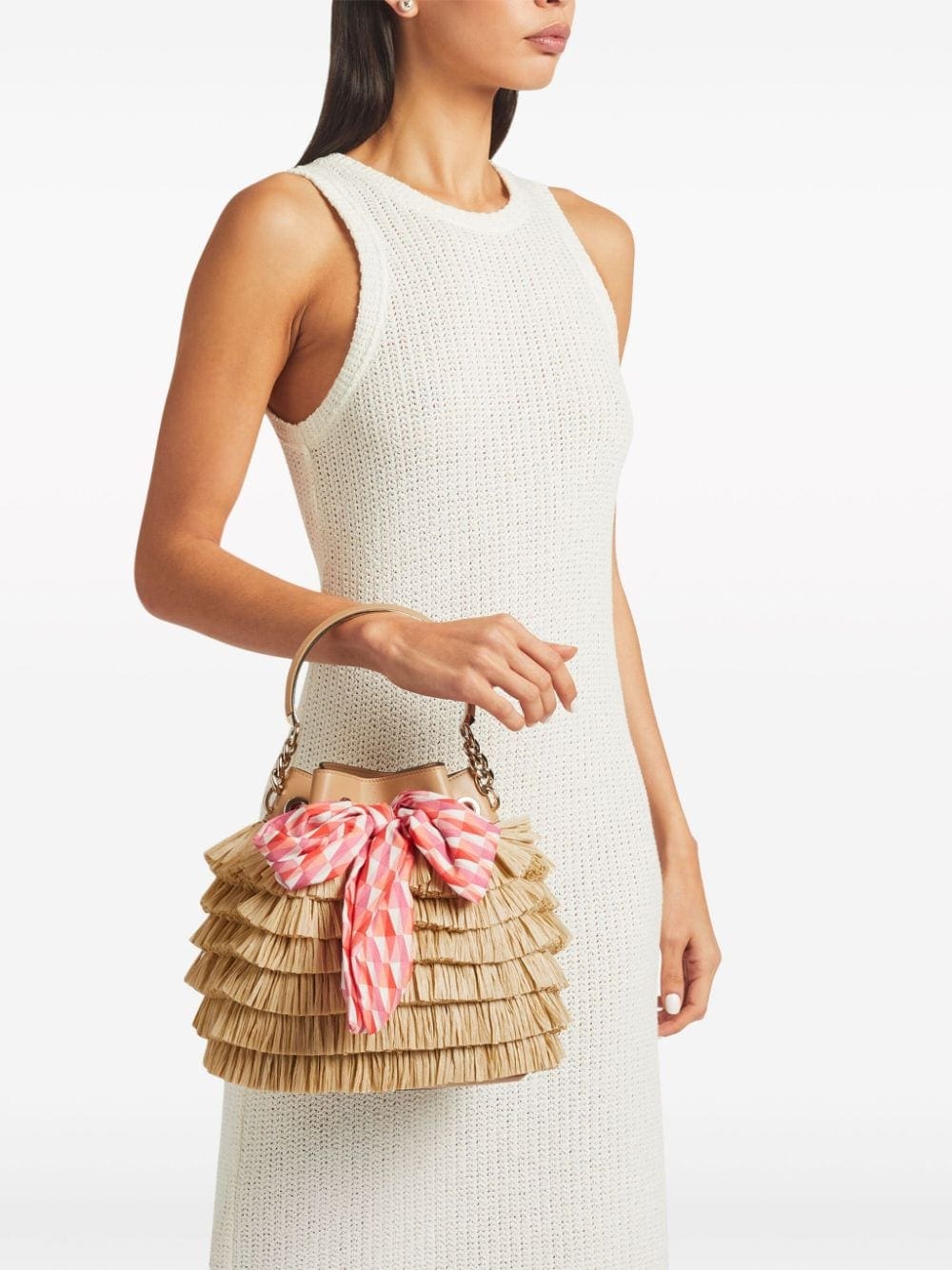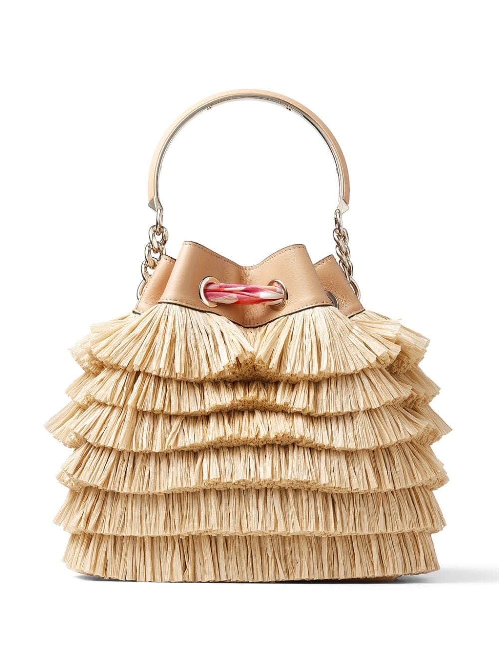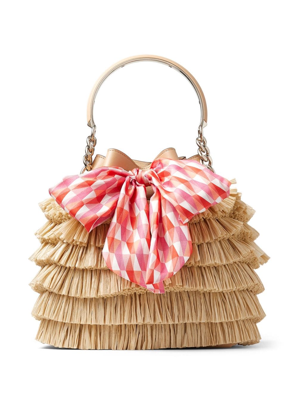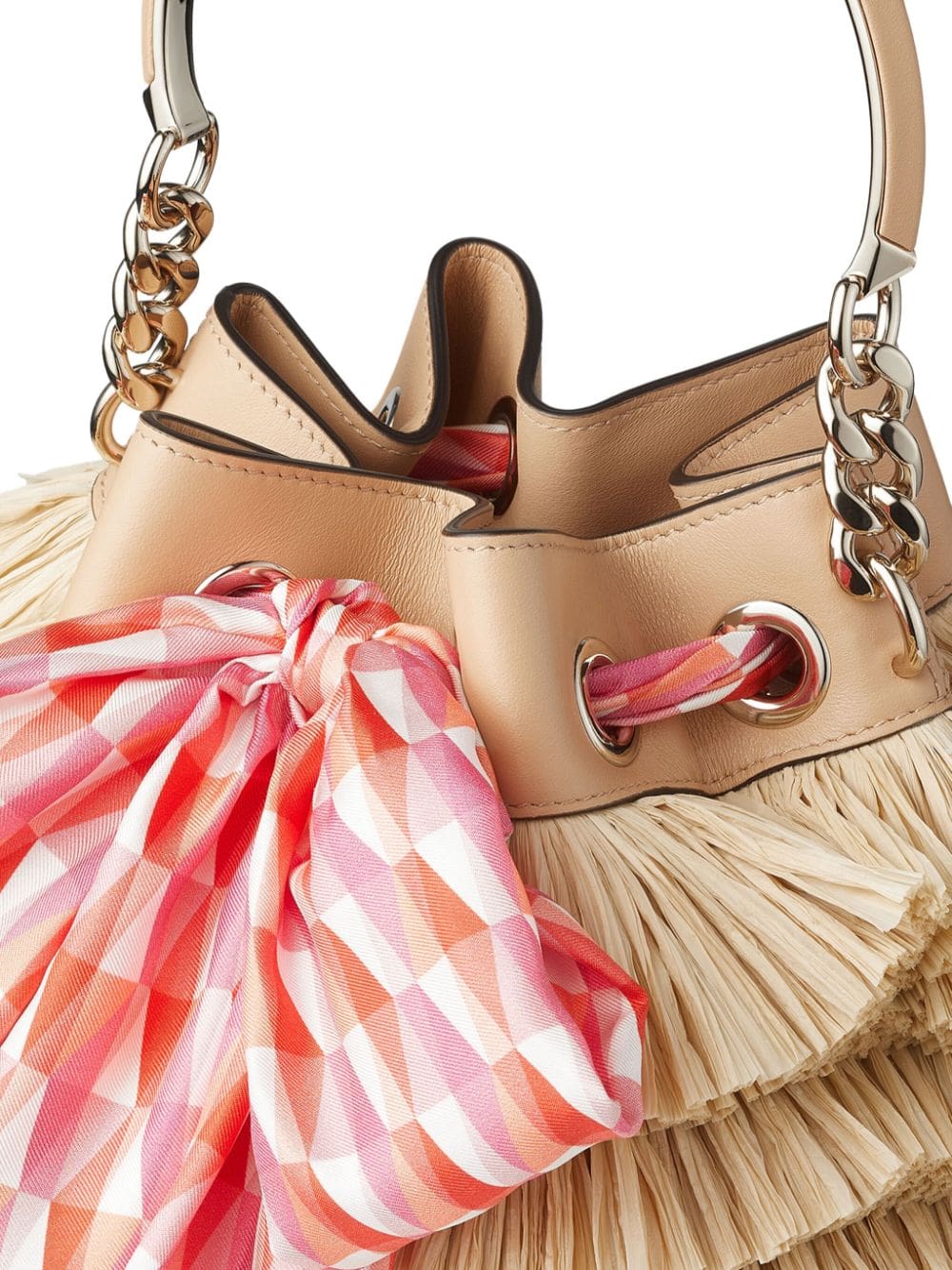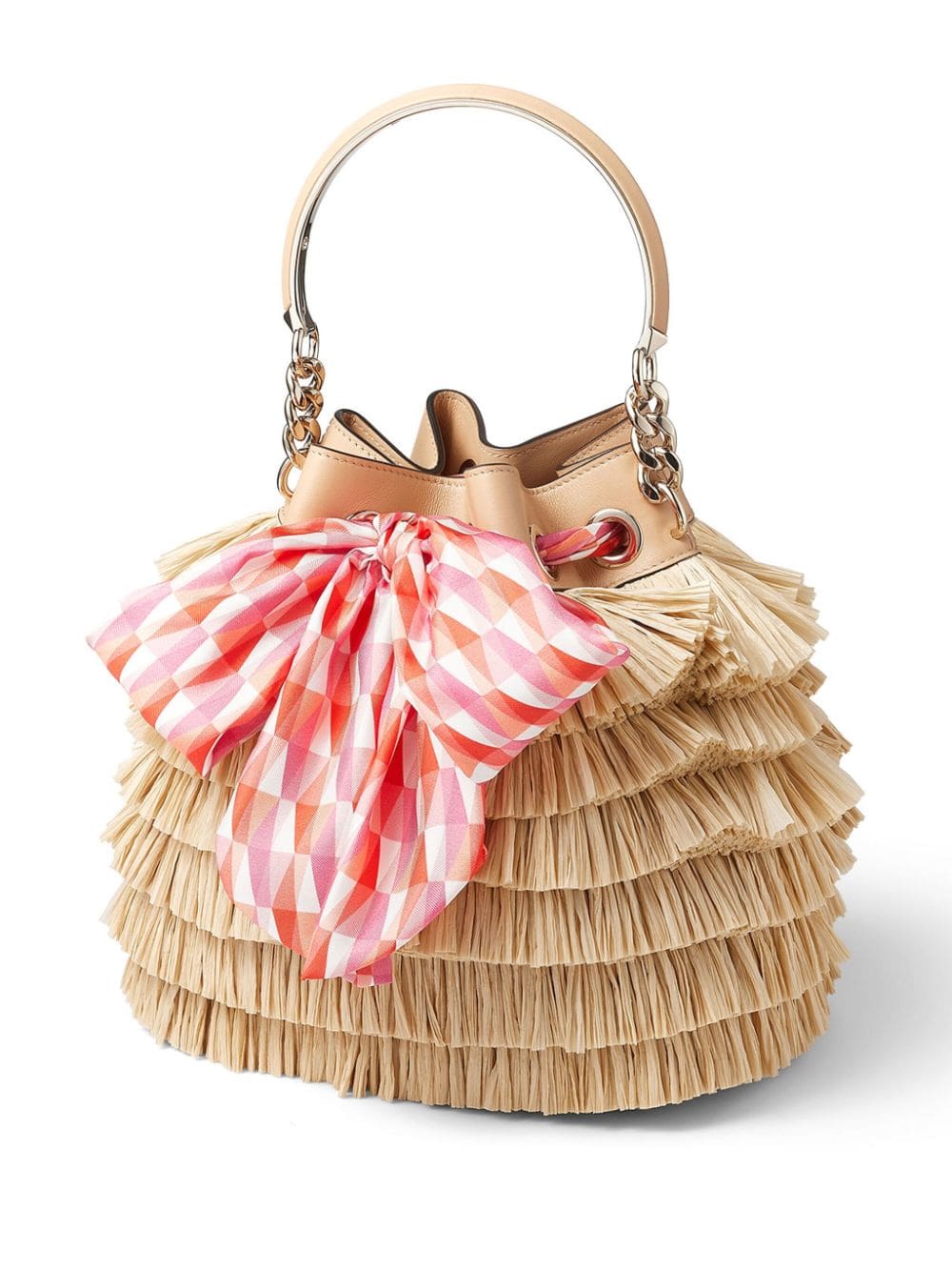 This iteration of Jimmy Choos Bon Bon bag imbues a summer mood. Made from leather with fringed raffia trims, it's secured with a silk scarf decorated with a colourful abstract pattern. Wear handheld or over the shoulder thanks to a detachable shoulder strap.