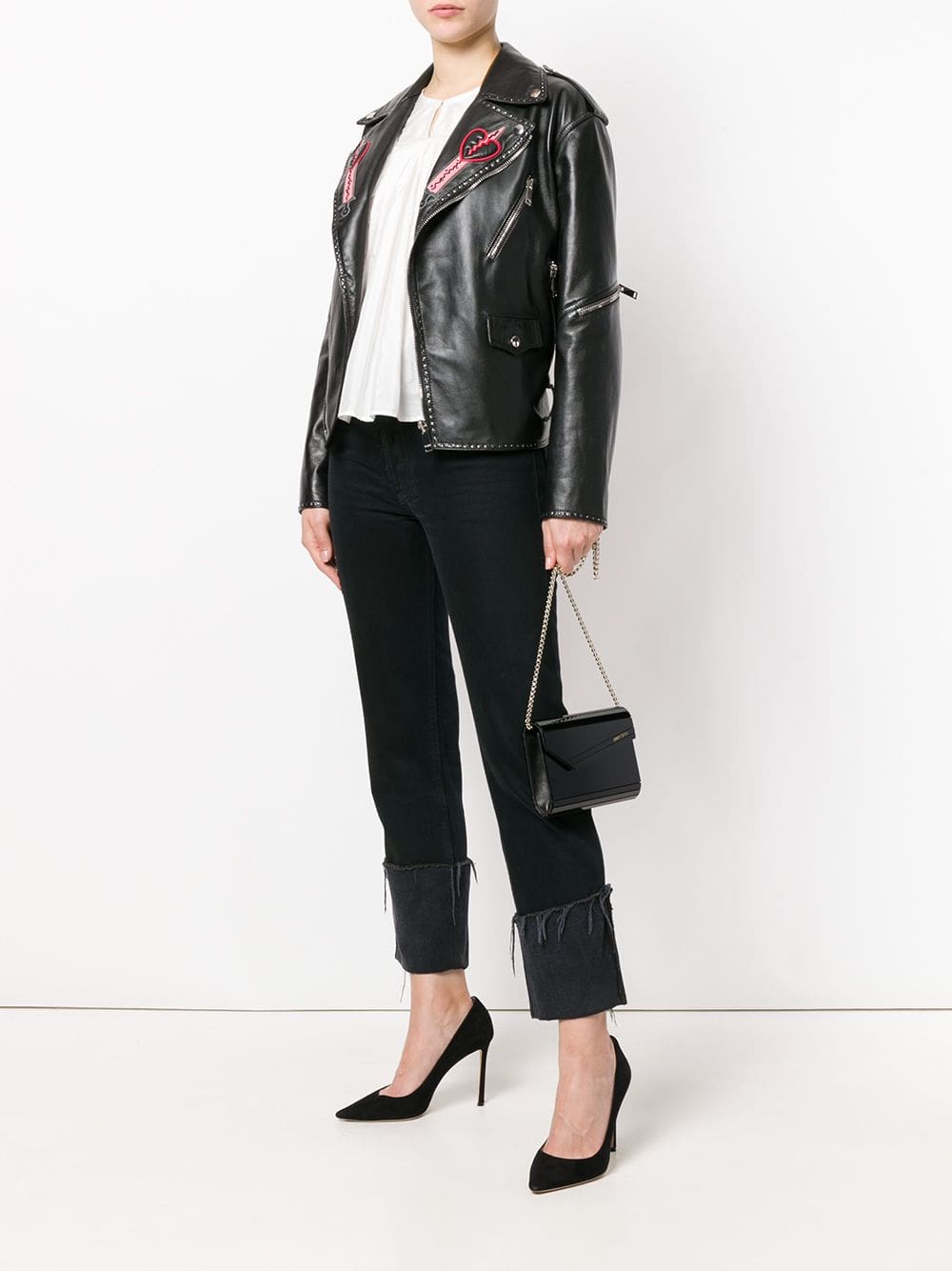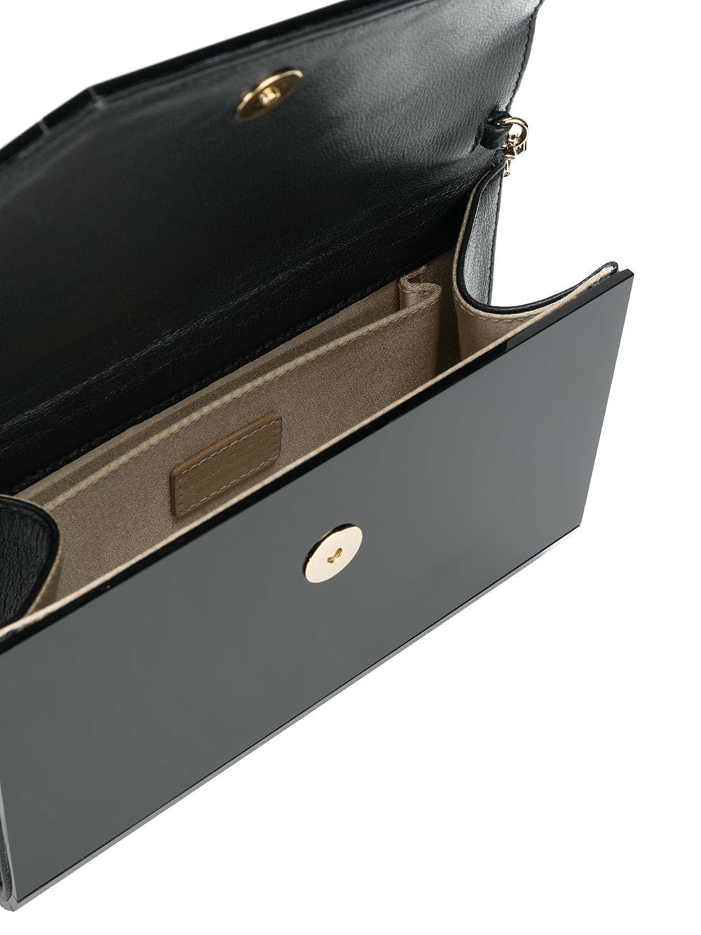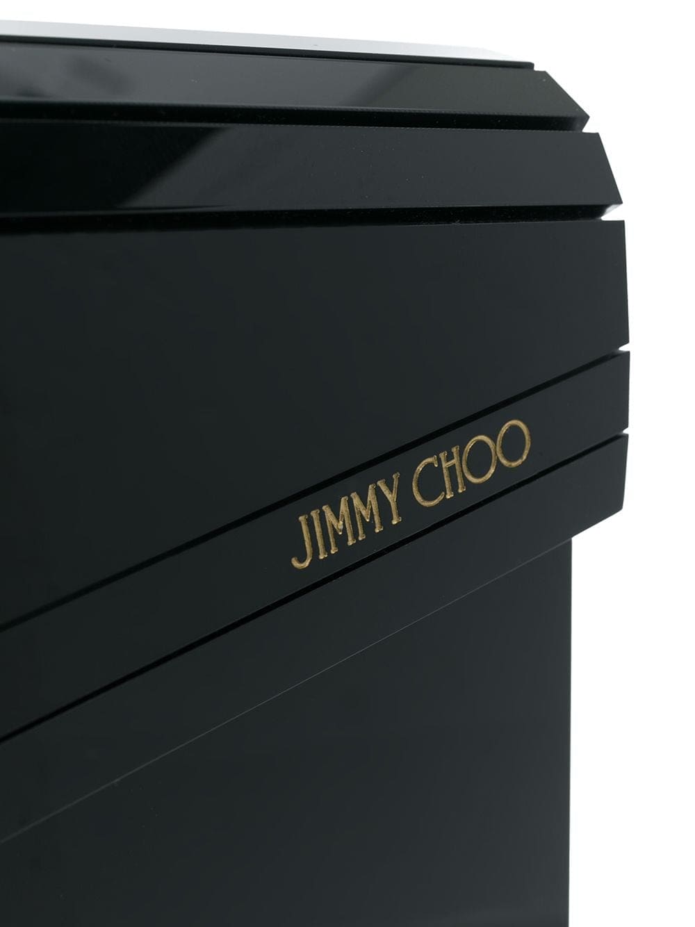 This fancy black Candy box clutch from Jimmy Choo with its glossy compact envelope shape is the perfect sized party accessory. Featuring an asymmetric flap foldover top with easy to fasten magnetic closure, ribbed acrylic panelling and an internal slip pocket, this Candy clutch from Jimmy Choo can be worn in the hand or over the shoulder with its gold-tone chain strap.