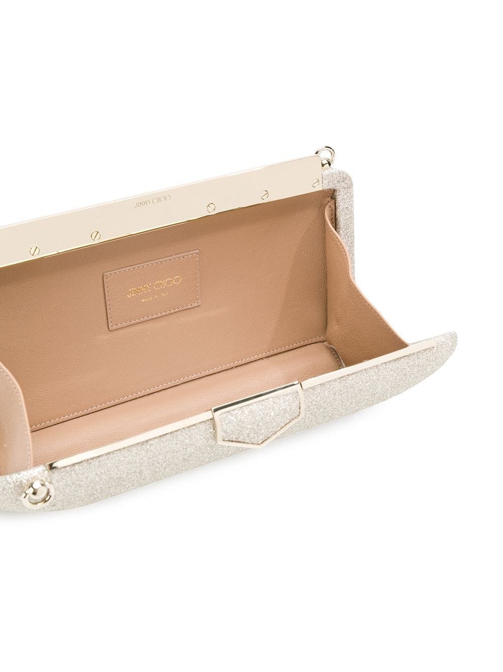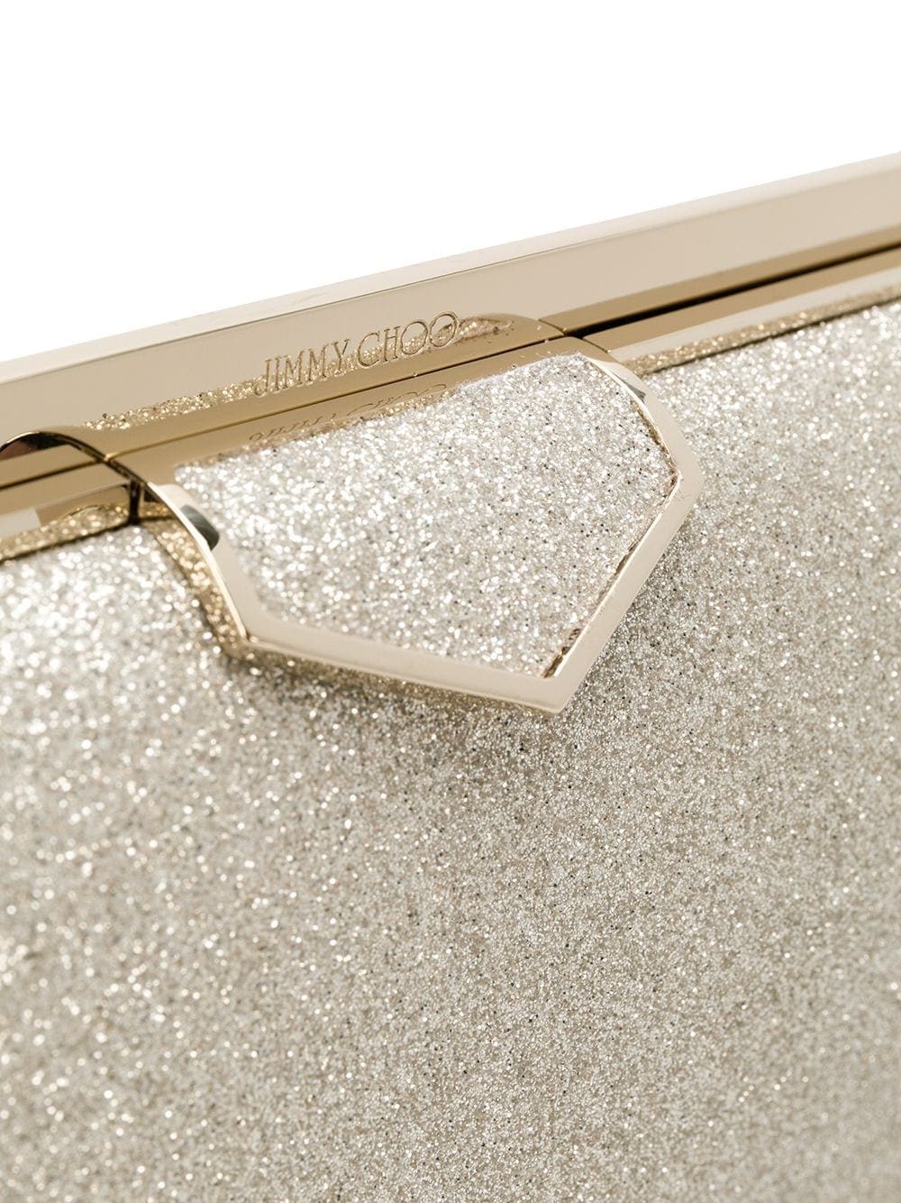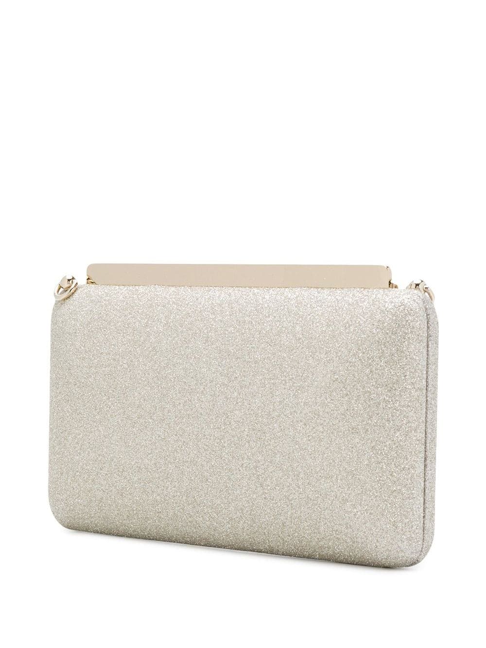 Jimmy Choo presents this shimmering Ellipse clutch in platinum ice dusty glitter. Designed in Italy, this elegant evening bag features two resin shells, a luxurious nappa leather lining and a gold-tone detachable chain shoulder strap, allowing you to carry it hands-free on the shoulder.