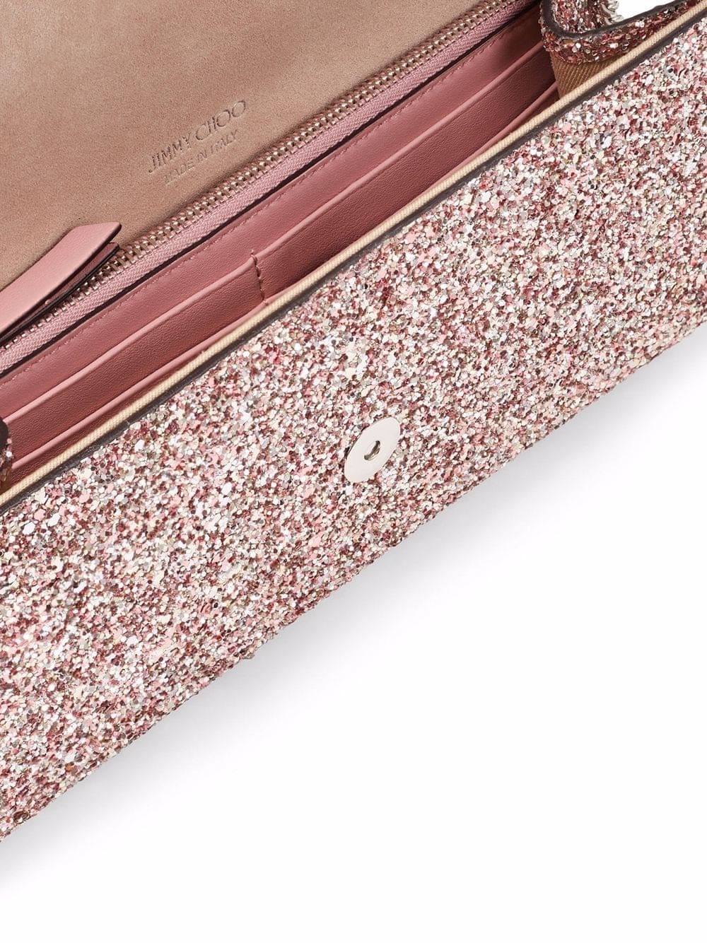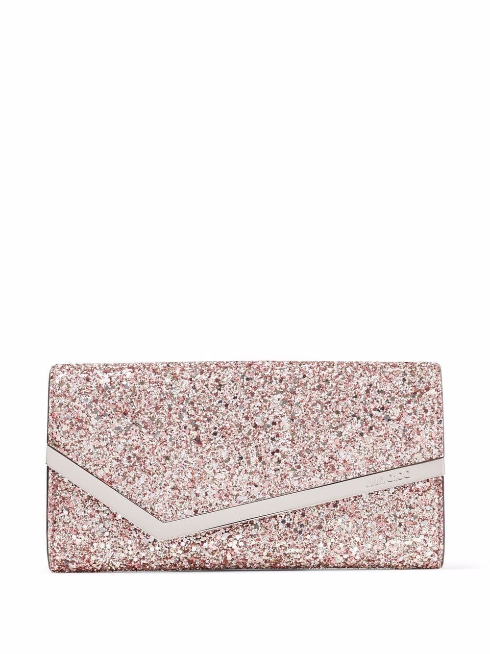 Crafted in Italy, Jimmy Choo's Emmie clutch bag is an eye-catching accessory. The design features a sparkling glitter finish and is detailed with a logo-engraved metallic trim.