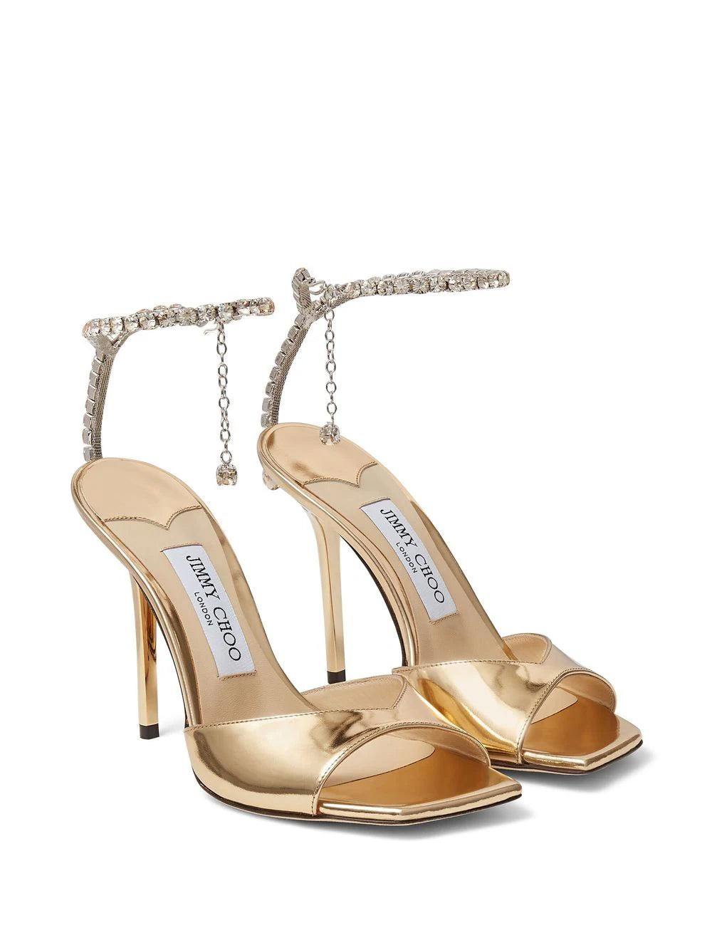 gold-tone calf leather crystal embellishment metallic finish open toe buckle-fastening ankle strap 100mm heel