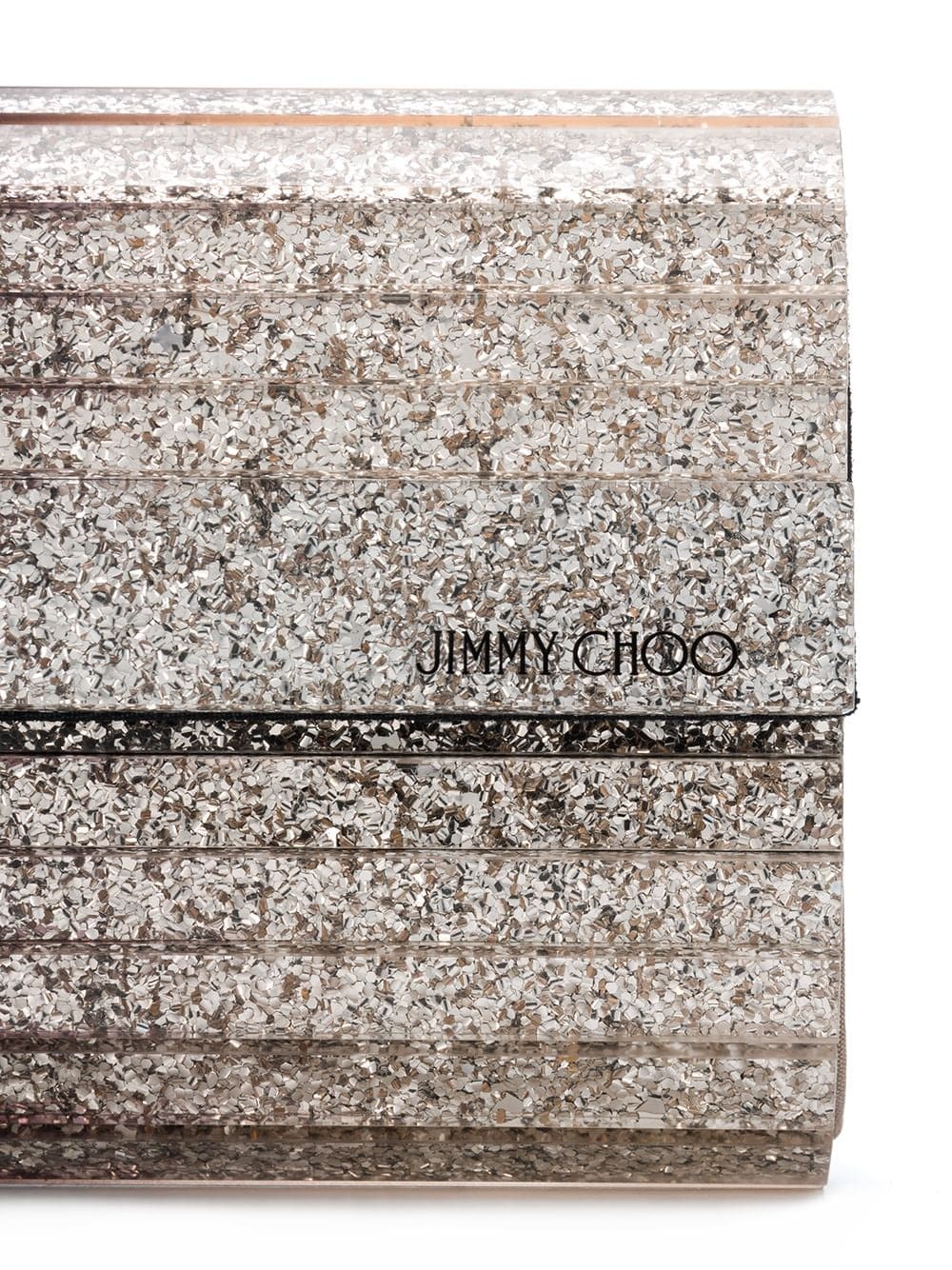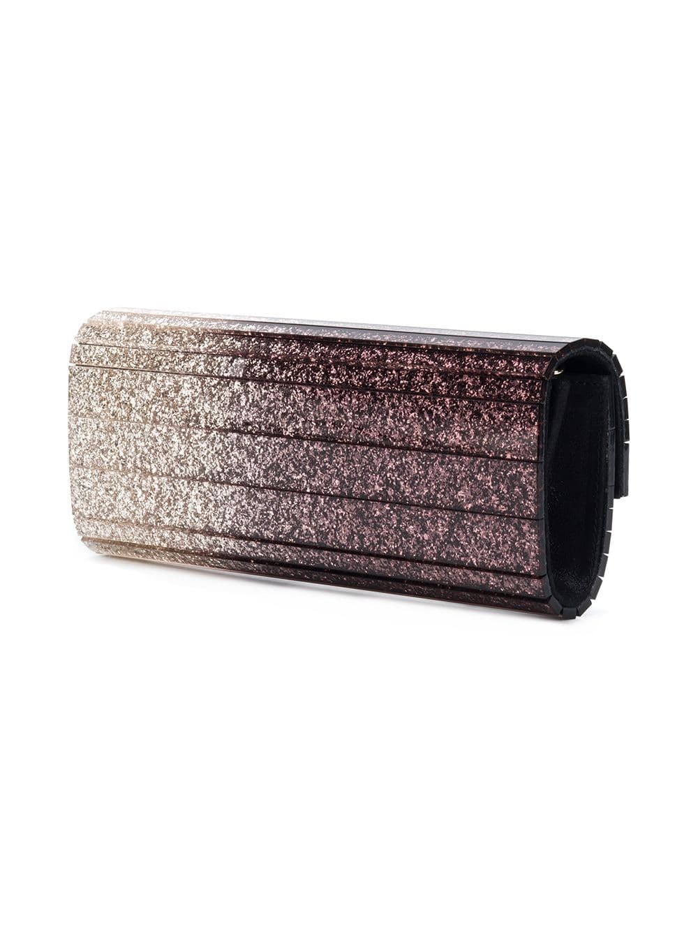 This purple blue speckled glitter acrylic Sweetie clutch from Jimmy Choo sports a sleek tubular design with a stripe motif and tonal gradient effect. Featuring a foldover top with easy to fasten magnetic closure, an internal logo patch and an internal zipped pocket, this Sweetie clutch can be carried in the hand or across the shoulder by means of the shiny gold-tone chain strap.
