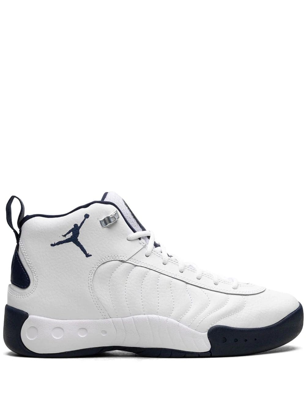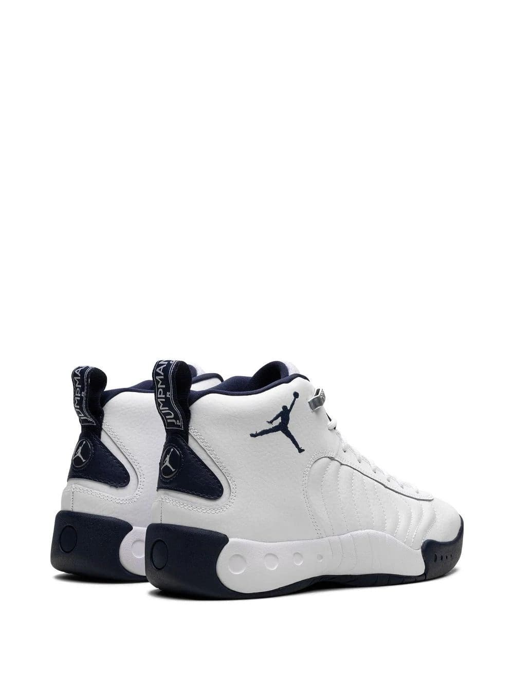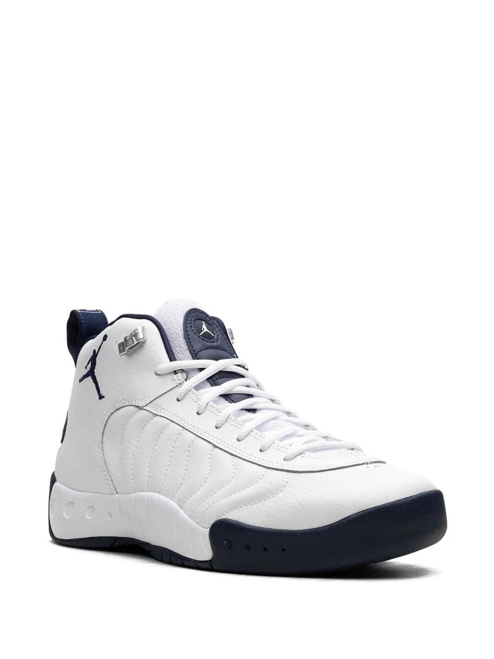 Jordan's Jumpman Pro returns in a white and navy blue colourway. They have a retro-inspired look made of leather the upper while a Jumpman stands out on the lateral ankle.
